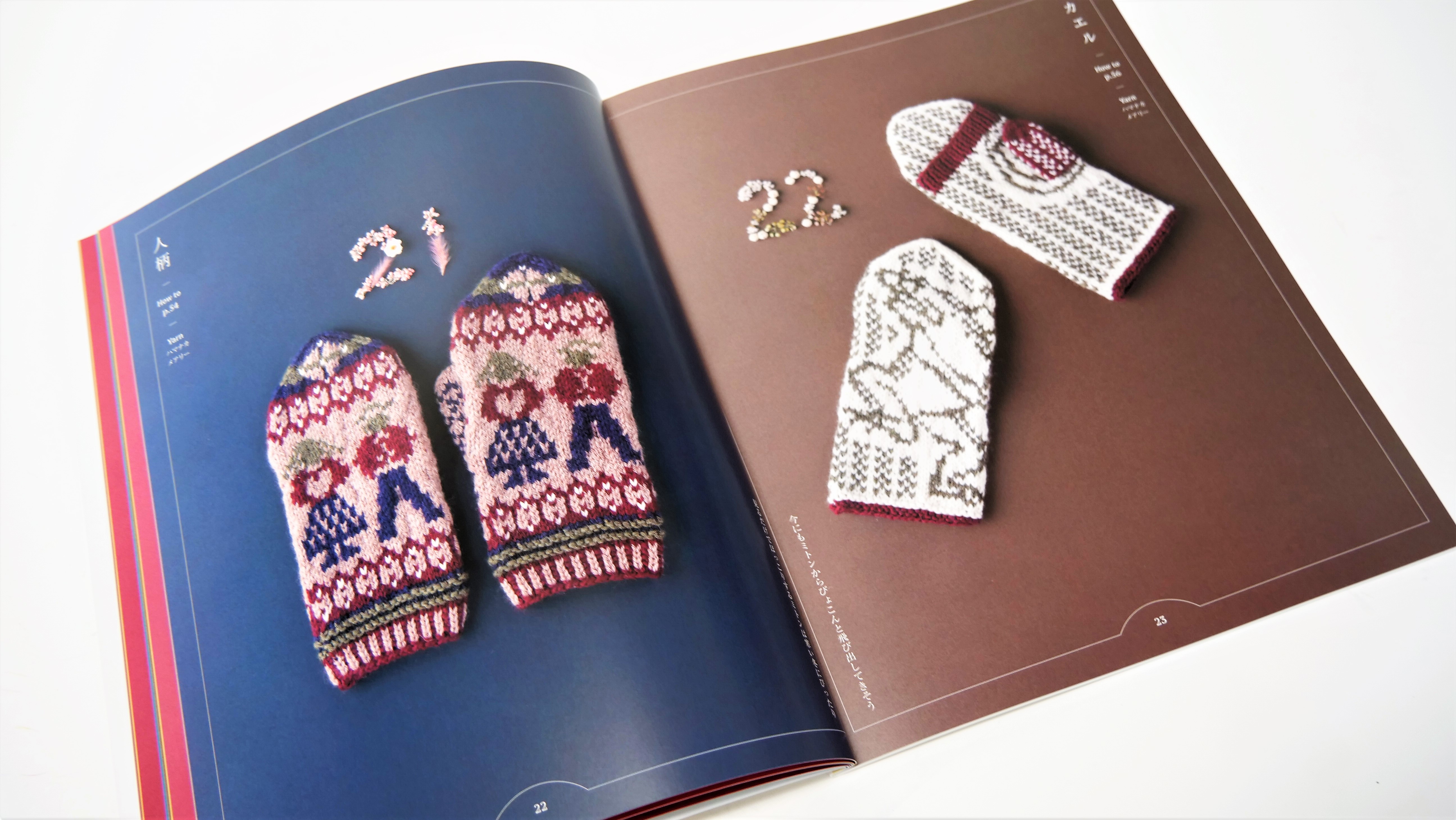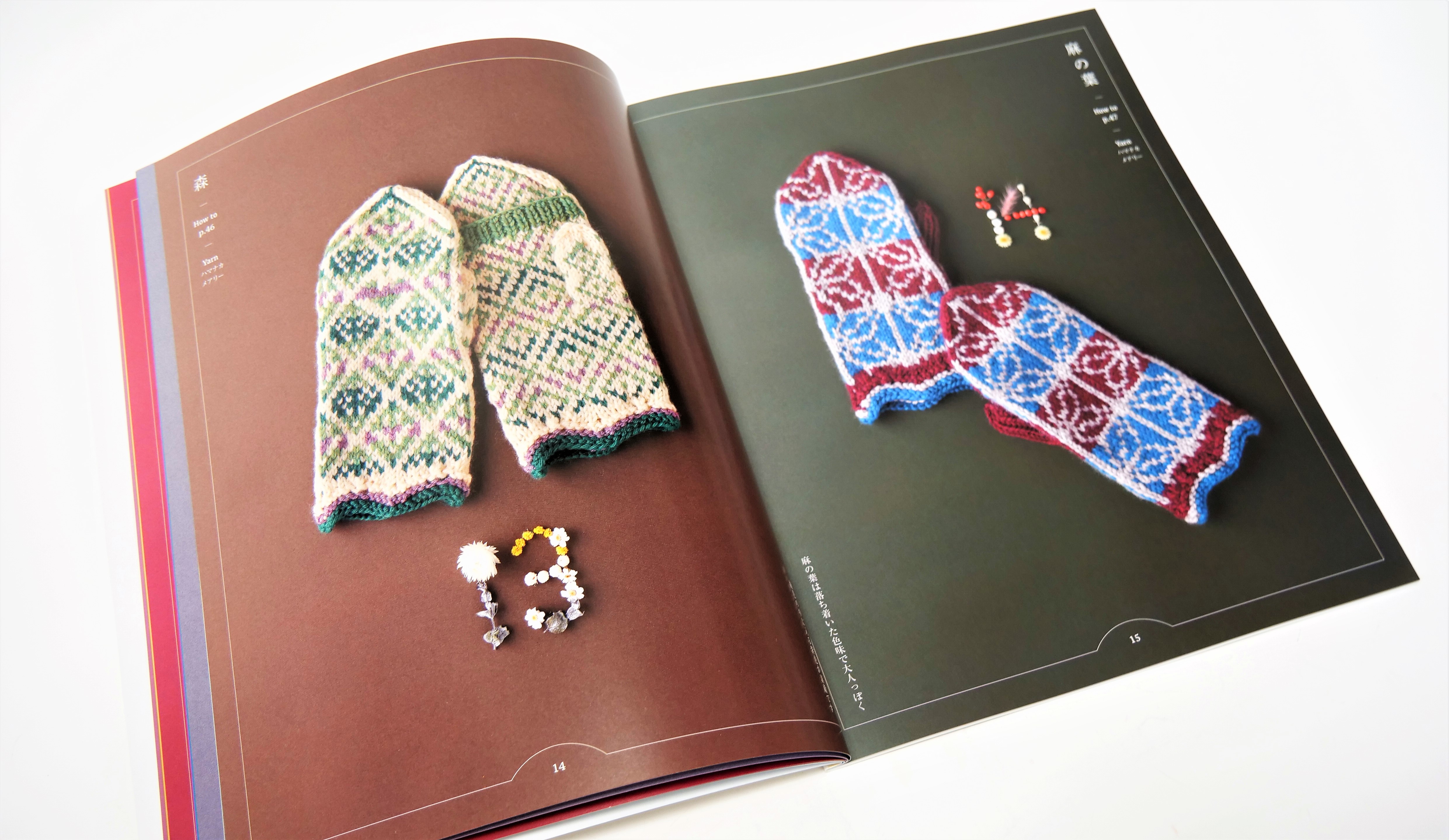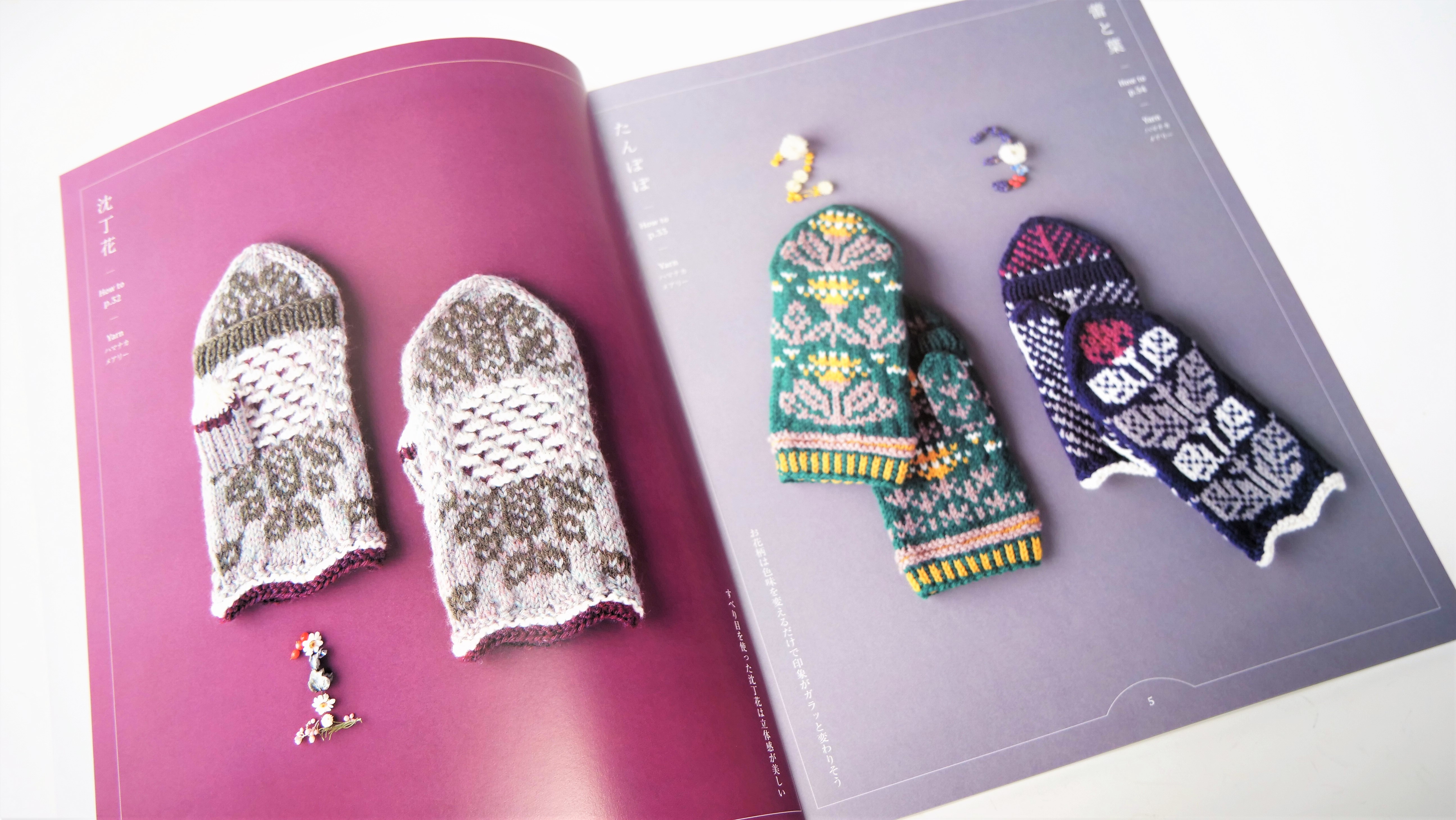形はミトンとしてはもちろん、手のひら側から4本指を出して使用することができる便利なタイプ。また、抜群の配色センスで繊細な絵柄が得意なみぞはたひろみさんの図案は、編み物大好きな方にも大満足の素敵なものばかりです。作品は全て編み込み模様で展開されており、表を見て編み進めていくので、編んでくと編み込み模様の柄が出てくるのも編んでいて楽しいポイント。