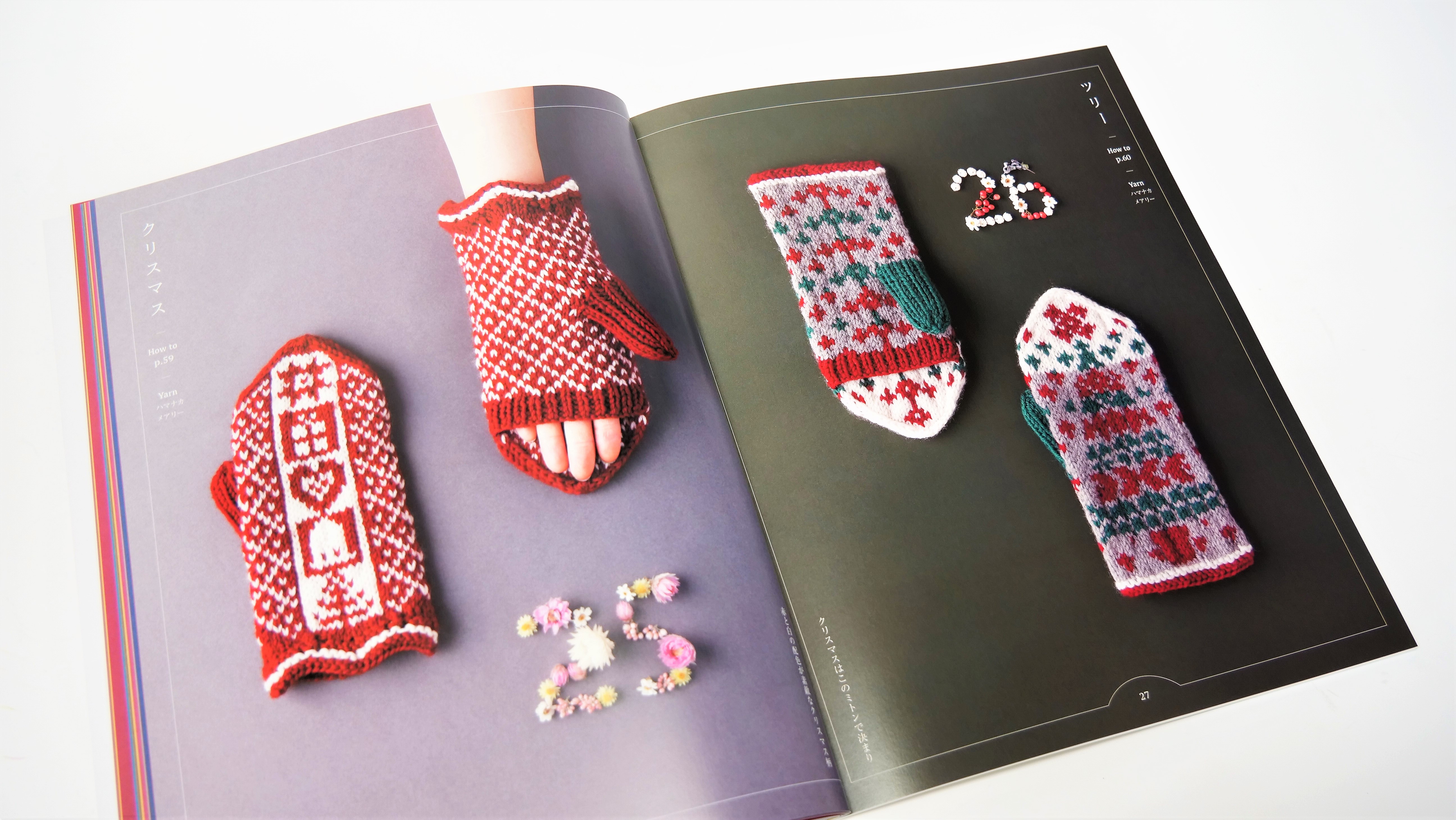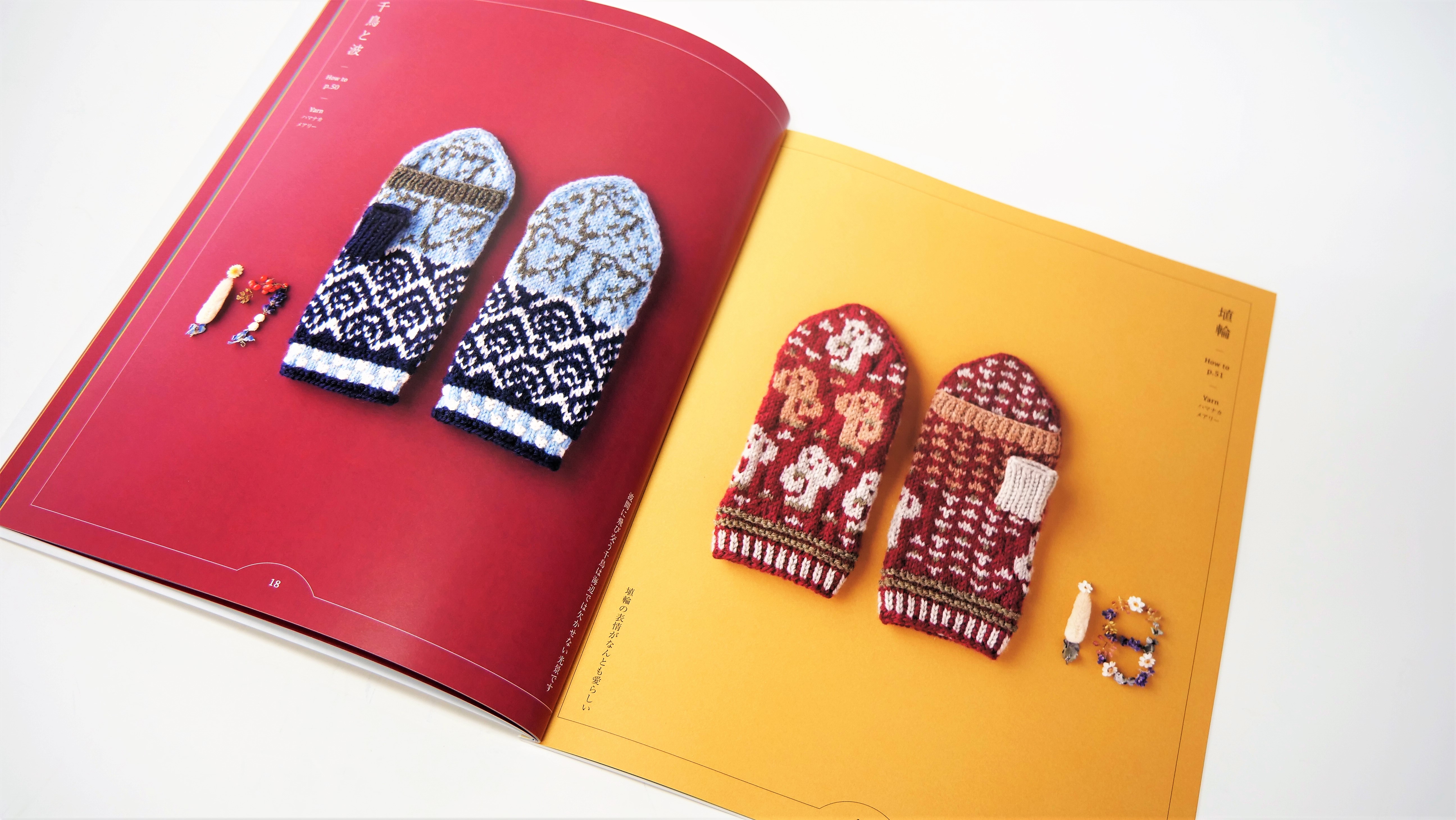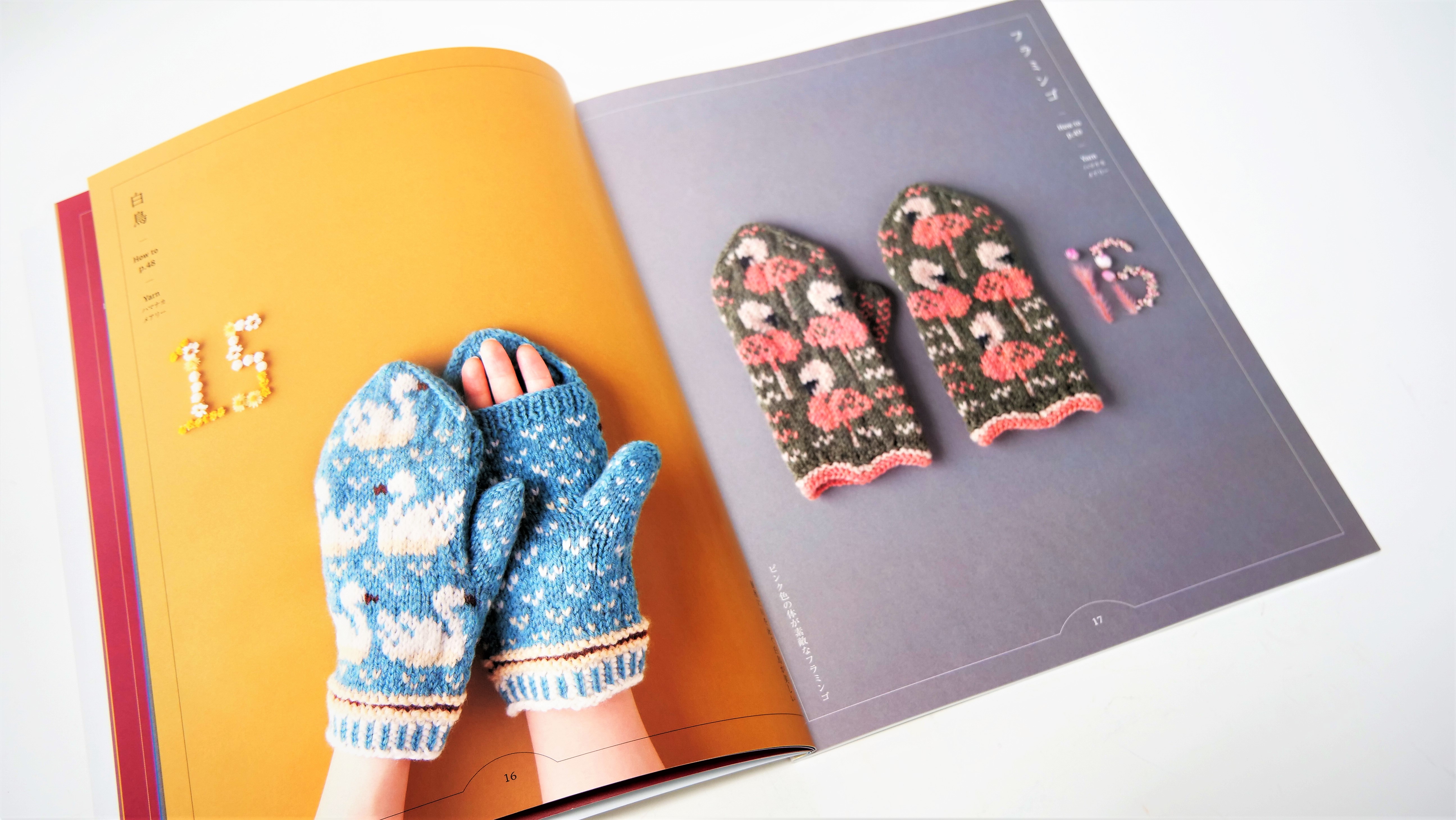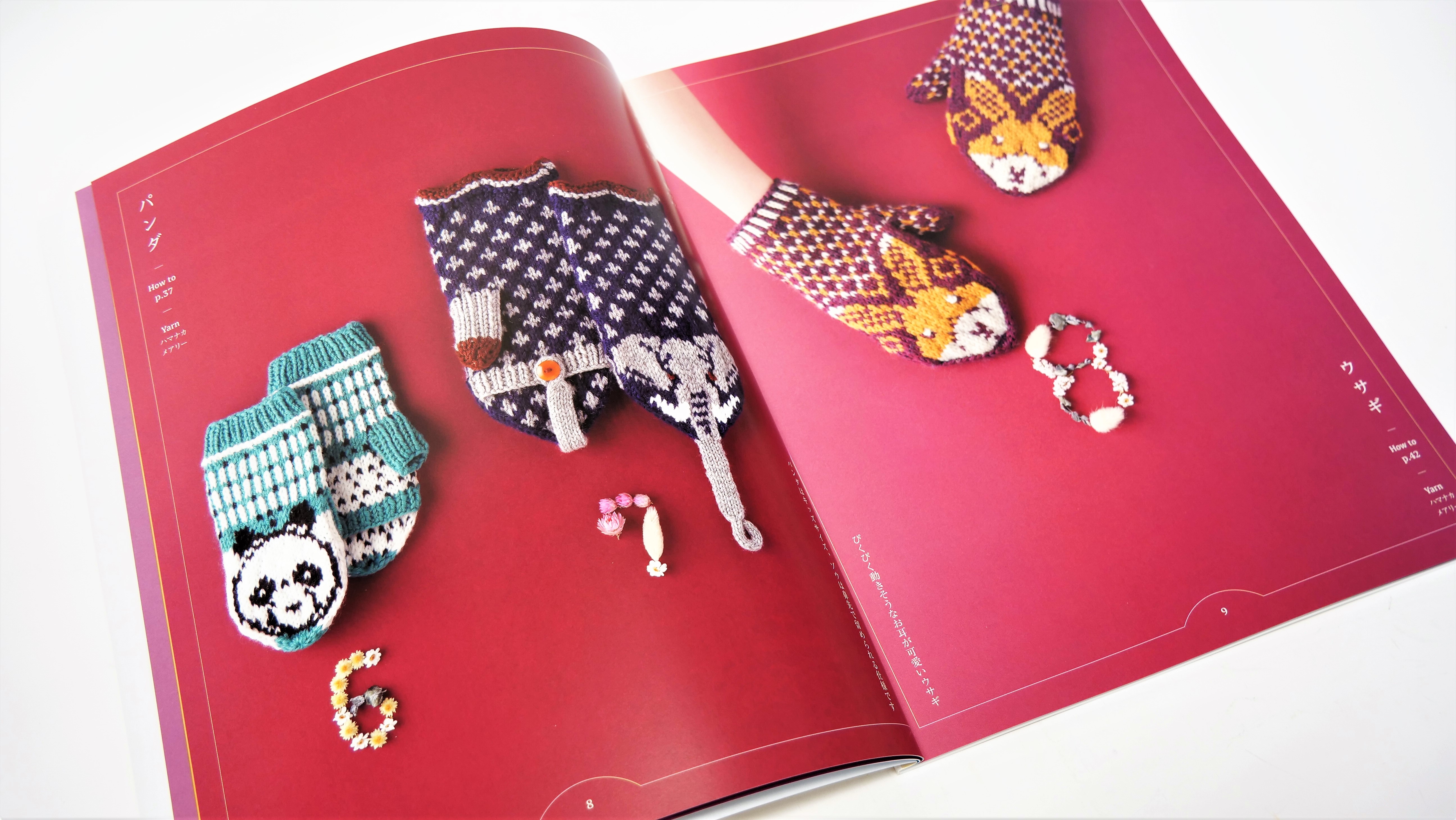形はミトンとしてはもちろん、手のひら側から4本指を出して使用することができる便利なタイプ。また、抜群の配色センスで繊細な絵柄が得意なみぞはたひろみさんの図案は、編み物大好きな方にも大満足の素敵なものばかりです。作品は全て編み込み模様で展開されており、表を見て編み進めていくので、編んでくと編み込み模様の柄が出てくるのも編んでいて楽しいポイント。