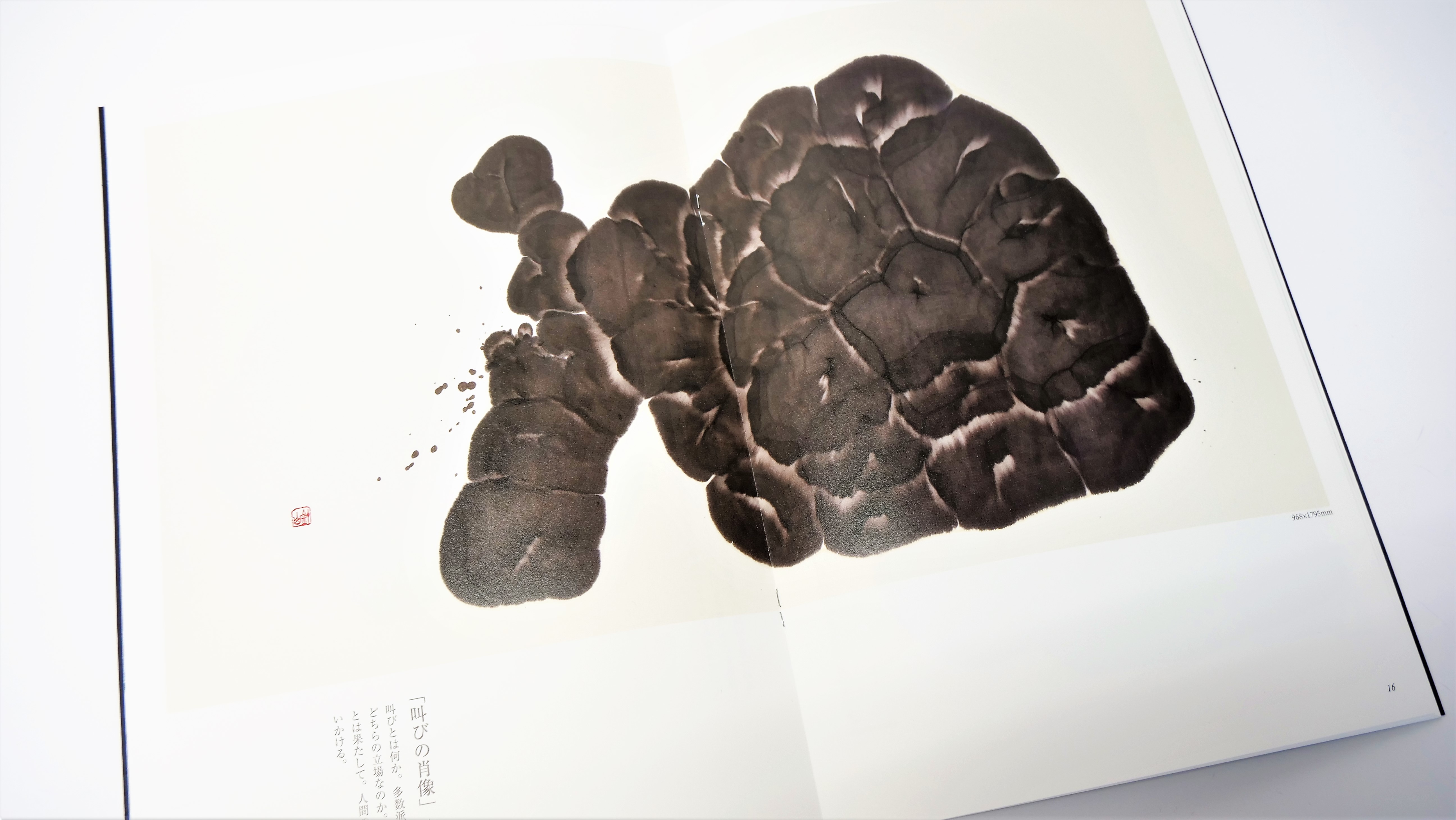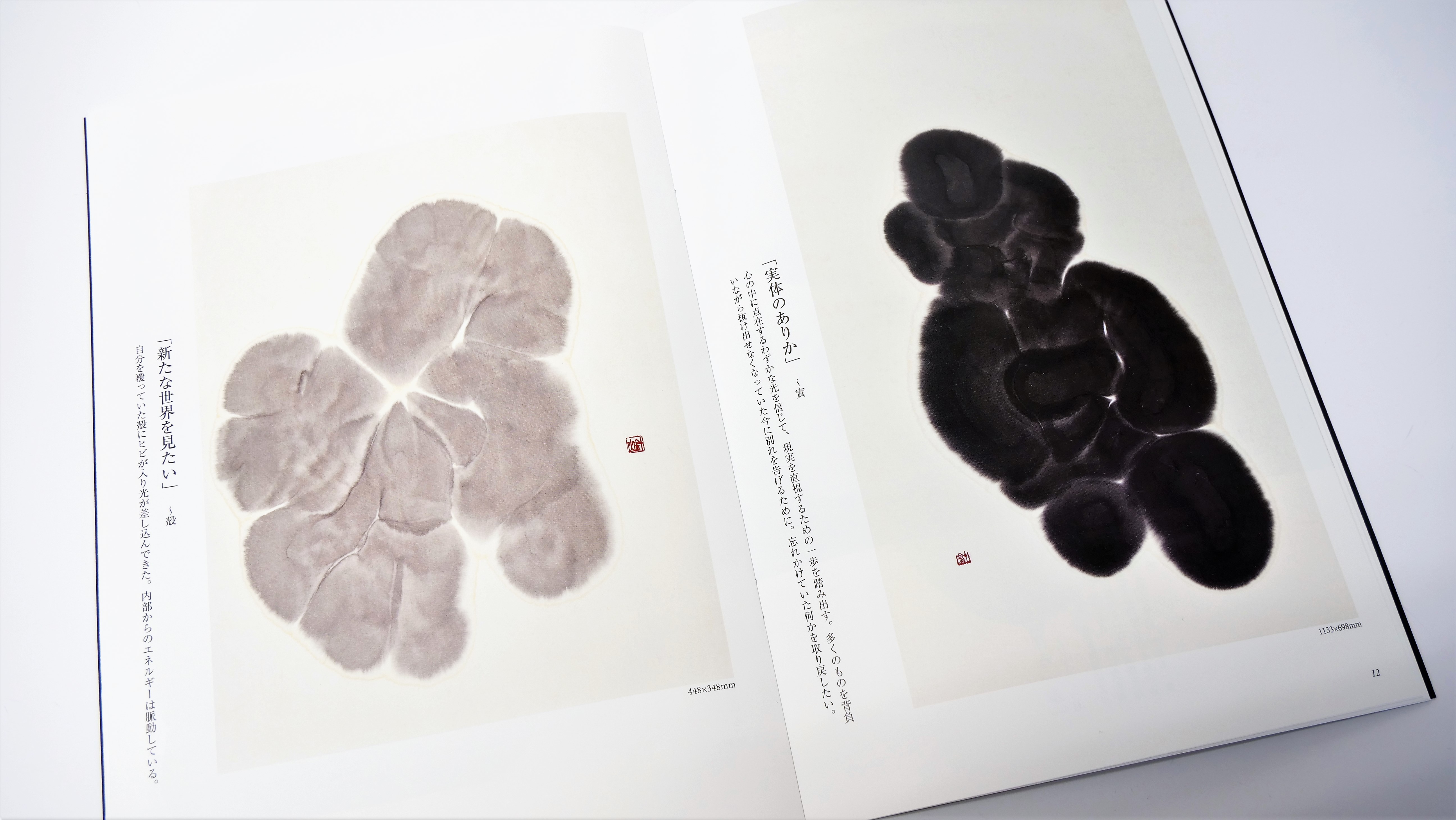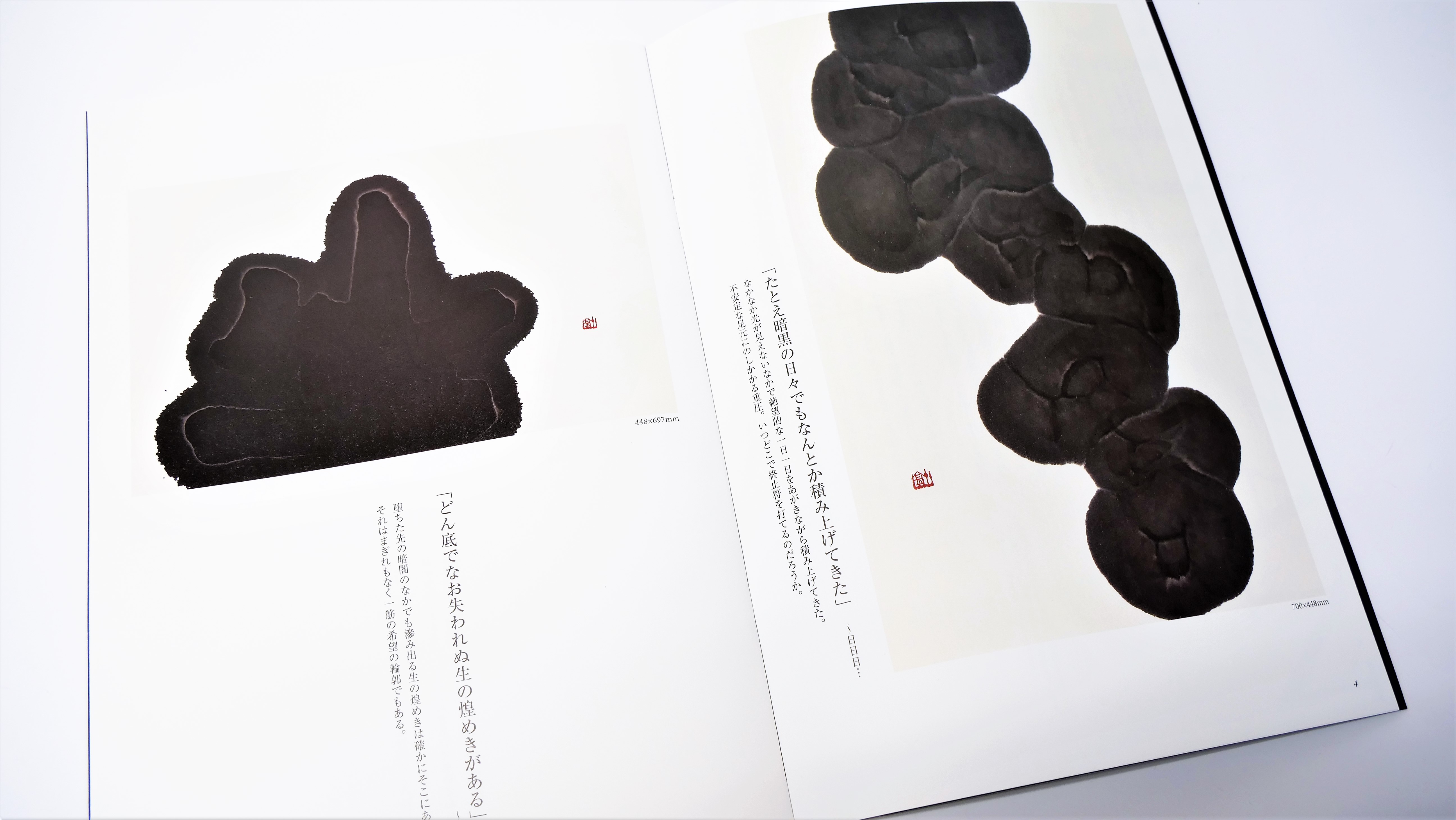 墨の滲みの表現や実際の作品のスケール感を再現できるように、濃度を調整することで濃淡を出して製版させていただきました。特に”モコモコボーダー”による書の白い部分は重要なポイントでしたので、印刷で潰れないように細心の注意を払いました。