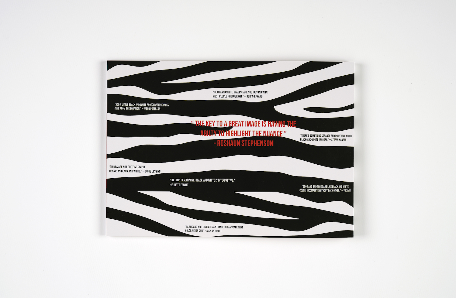 米国出身、日本在住の写真家ロショーン・スティーヴンソン氏による初となるモノクロ写真集「Nuancez」が刊行された。白黒の縞模様を背景にタイトルが大きく冠されたインパクトある表紙は、私たちがオーソドックスな「写真集」に対して持つイメージを良い意味でも裏切ってくれる。表紙を捲ると、そこには目の覚めるような鮮烈な赤い見返しに浮かび上がる序文から始まり、48ページにわたる重厚かつ繊細なモノクロームの世界が幕を開ける。