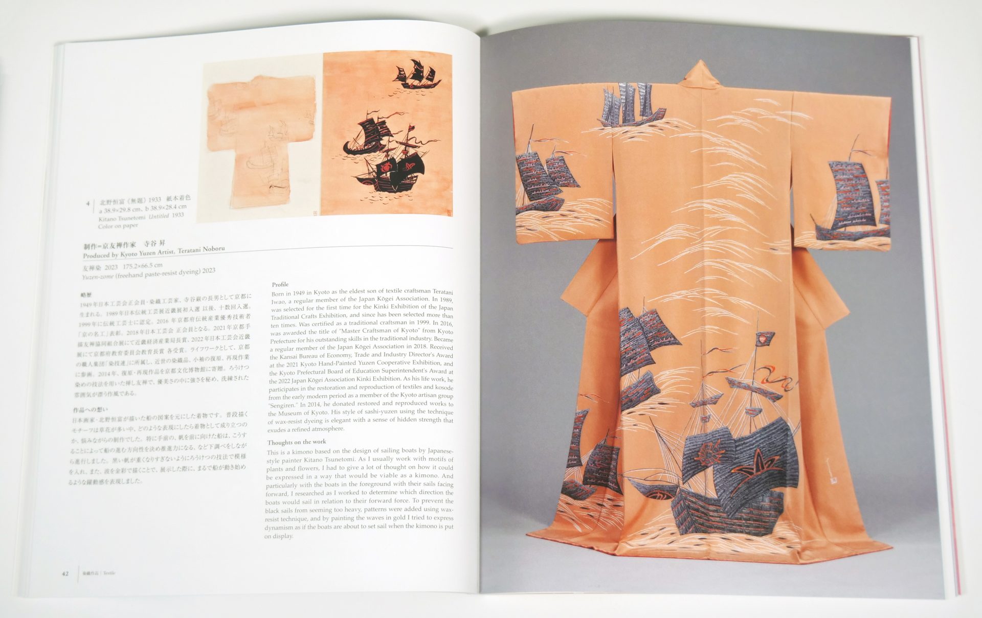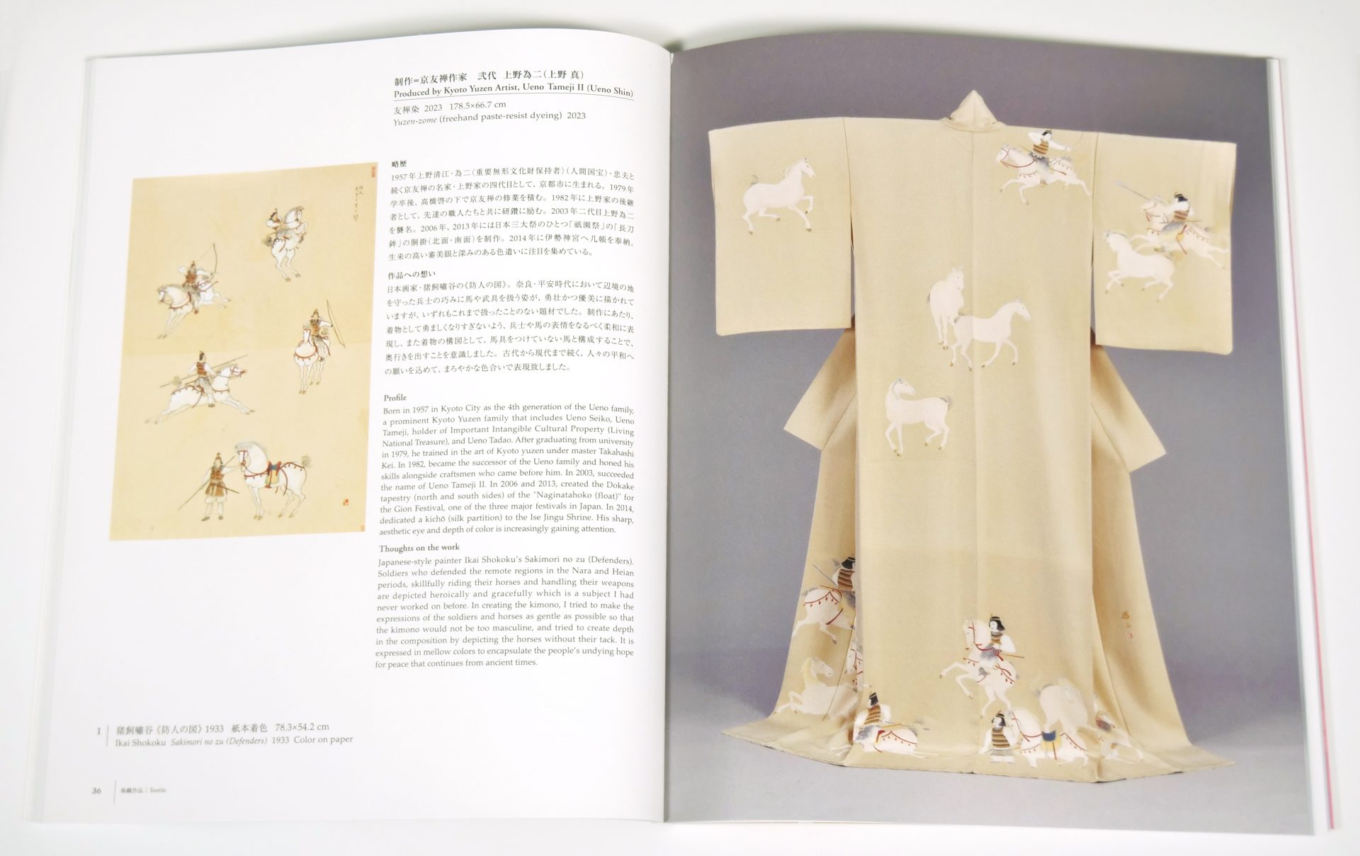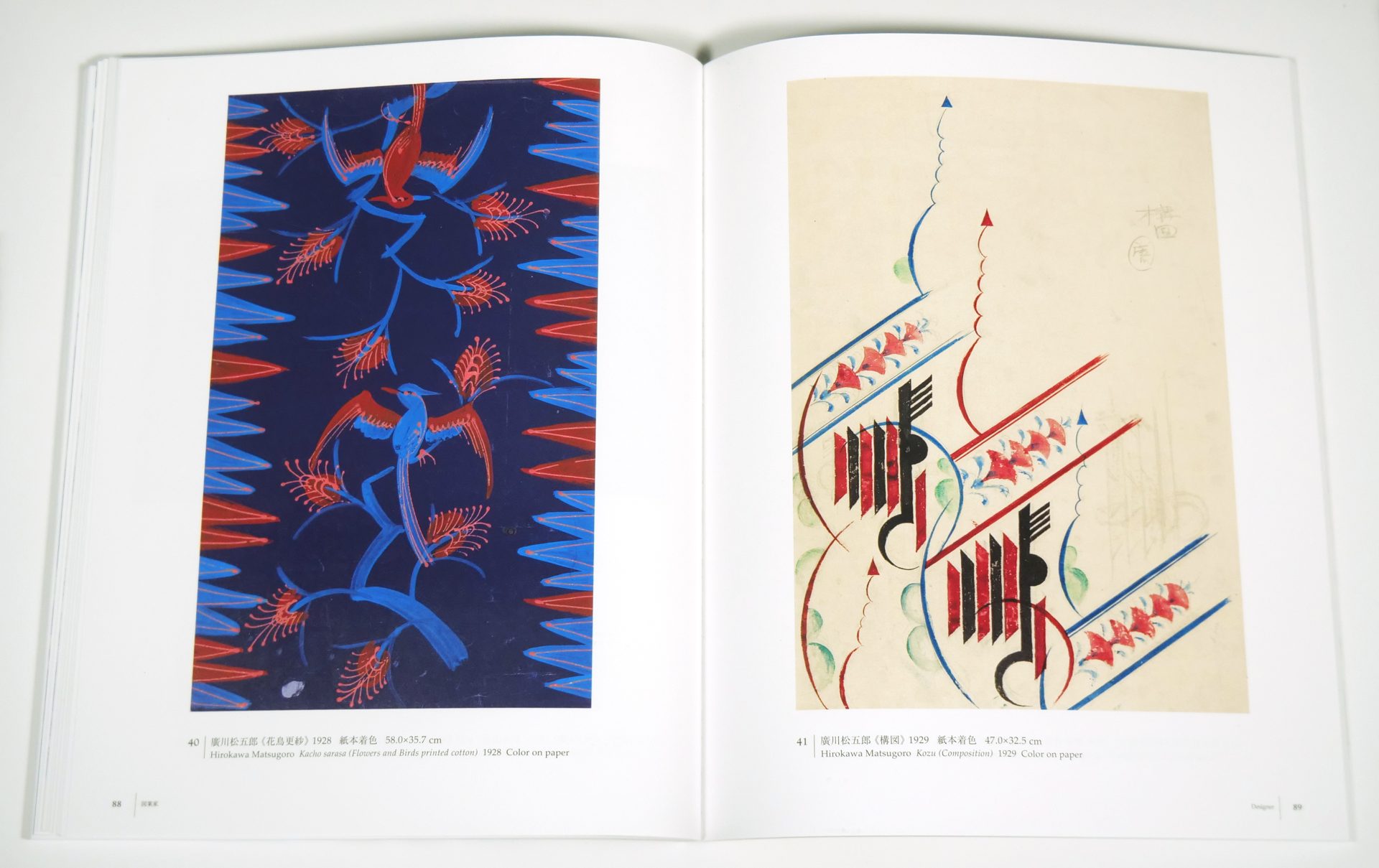 本図録では、本展同様、元の図案と図案を元に制作された染織品を並べて鑑賞することができます。制作に際しても、当社のプリンティングディレクターが撮影から立ち会い、図案の色を再現することに力を入れました。
