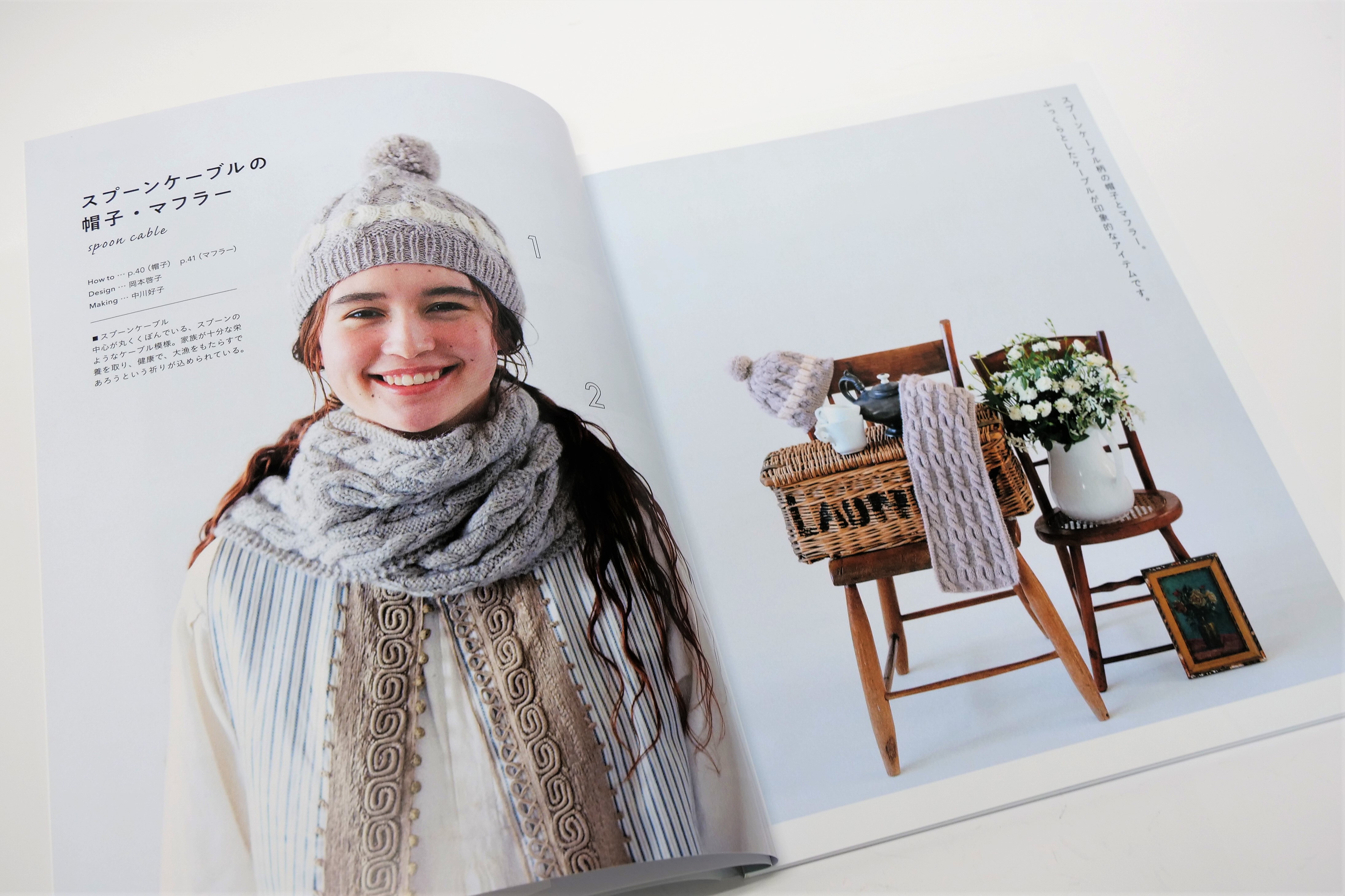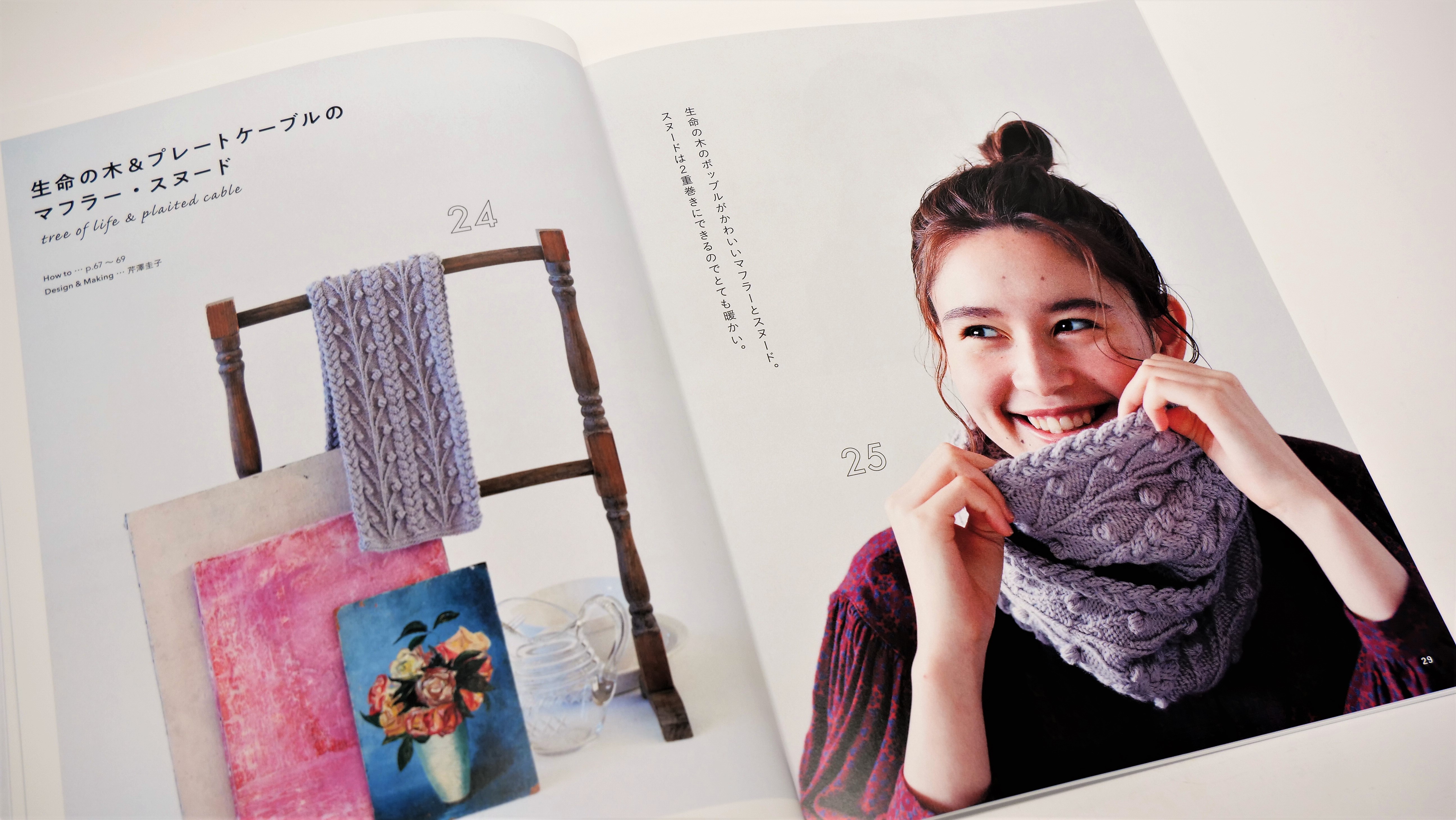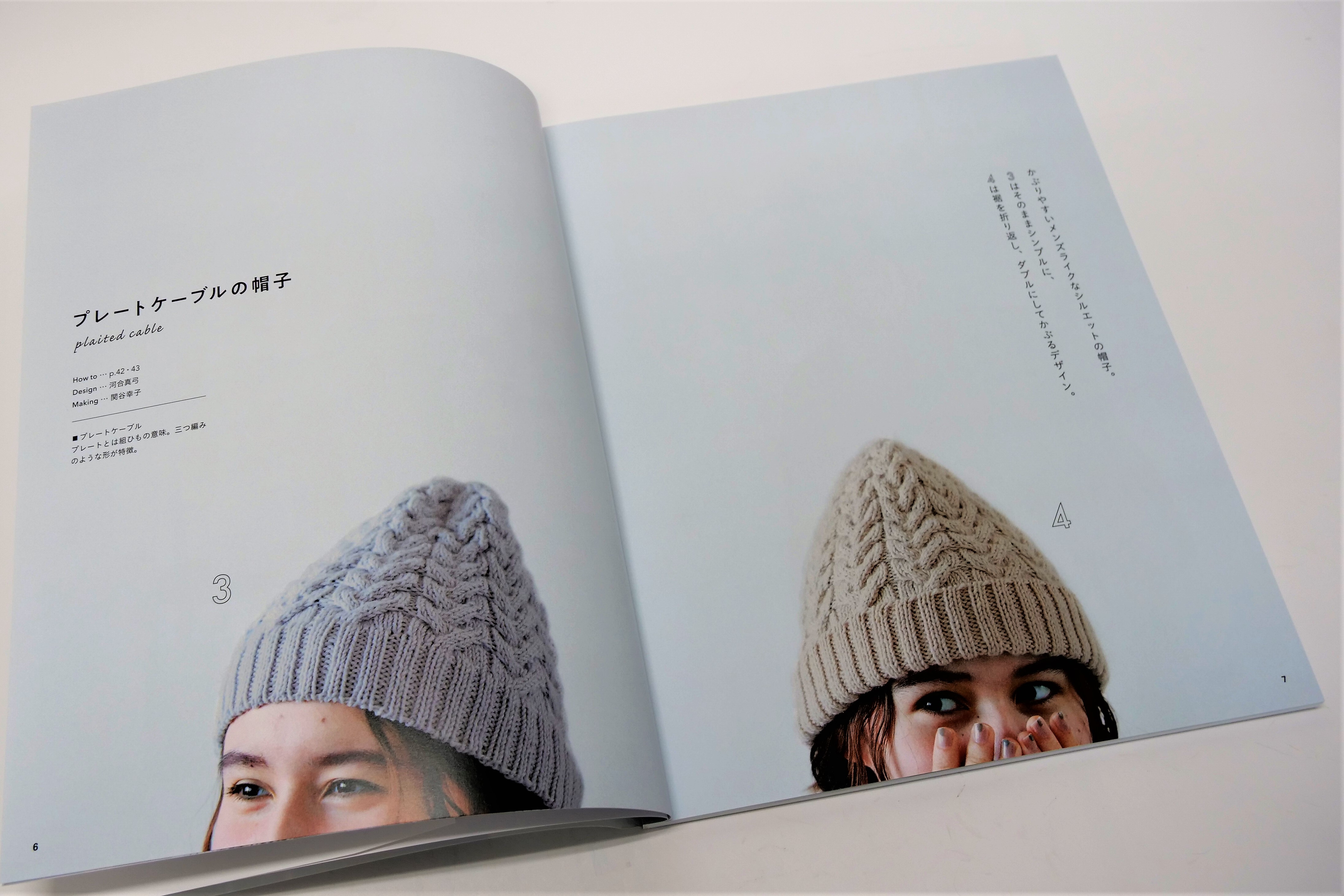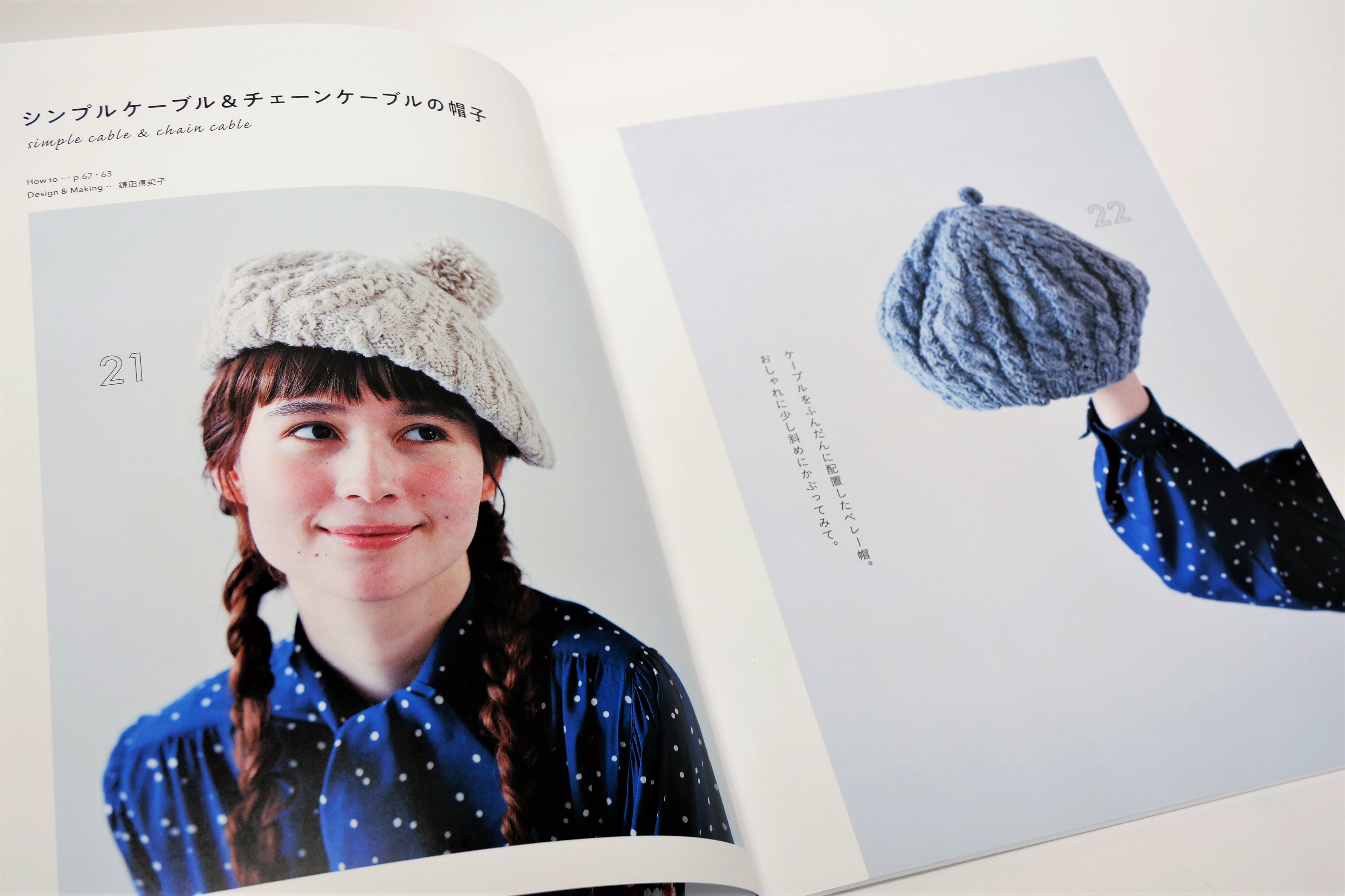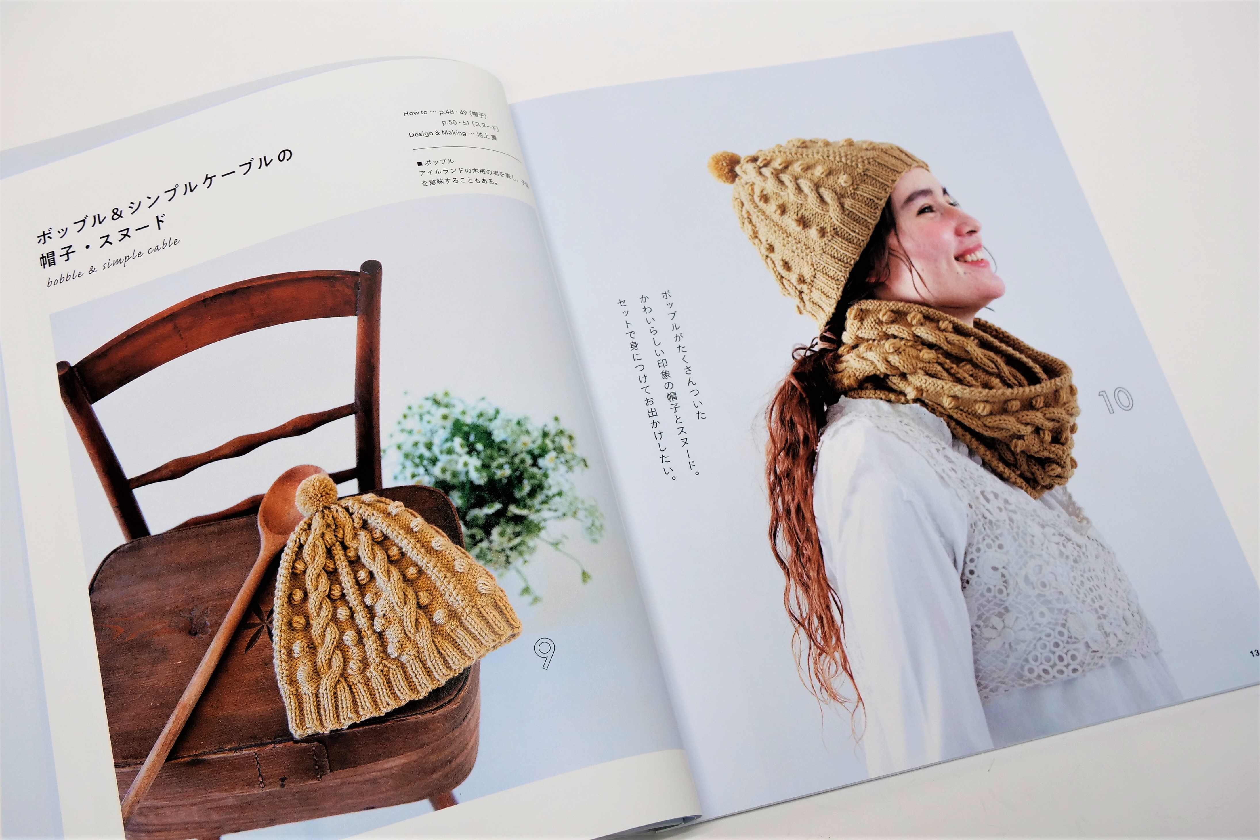 定番のケーブル模様や蜂の巣から生命の木、リーフ模様、ダイヤ柄など種類豊富に紹介。帽子は定番のニット帽に加え、耳当て付き帽子、バケットハット、ベレー帽、フード付きのマフラーなどトレンド感のある作品もたくさん。