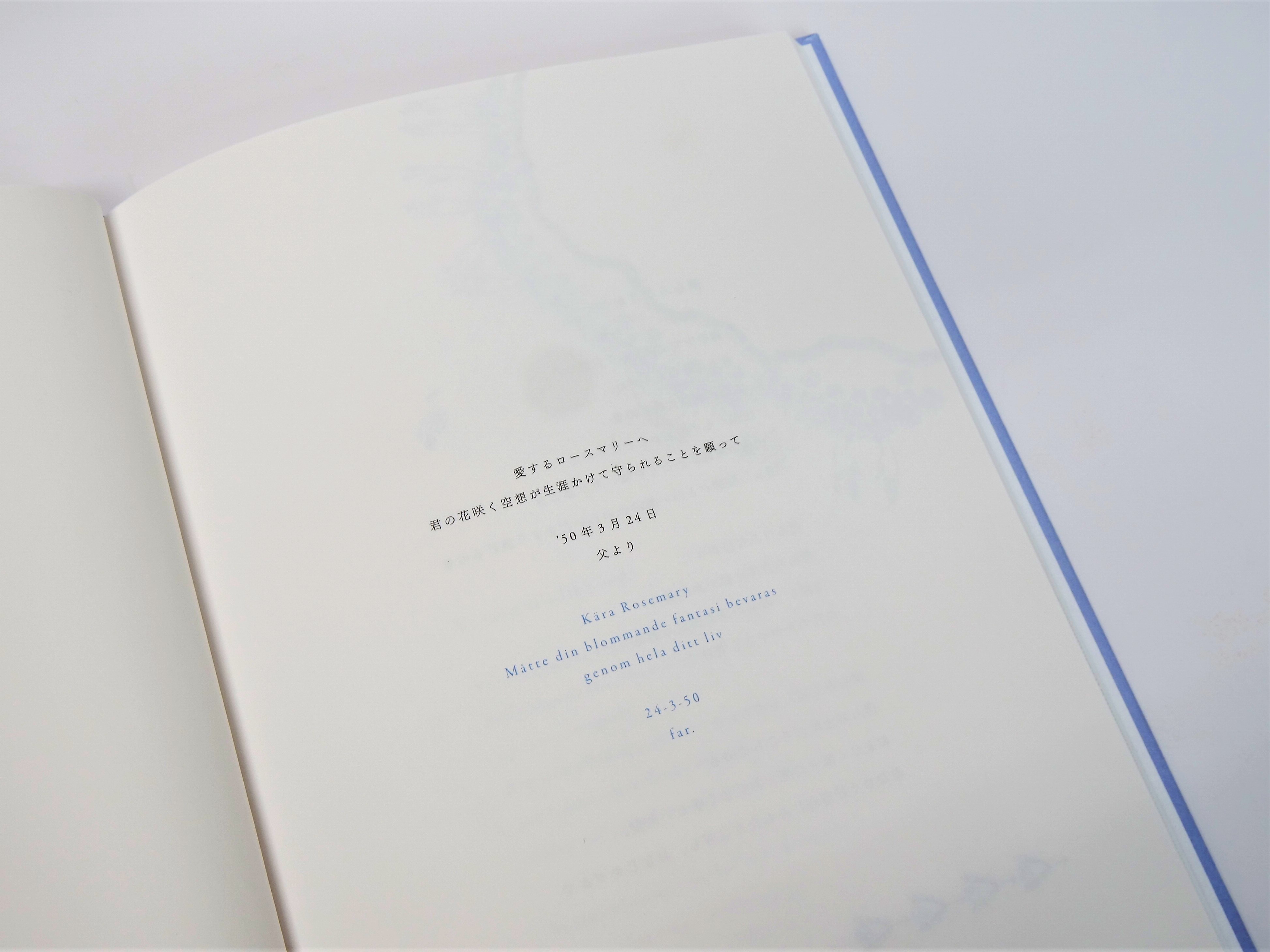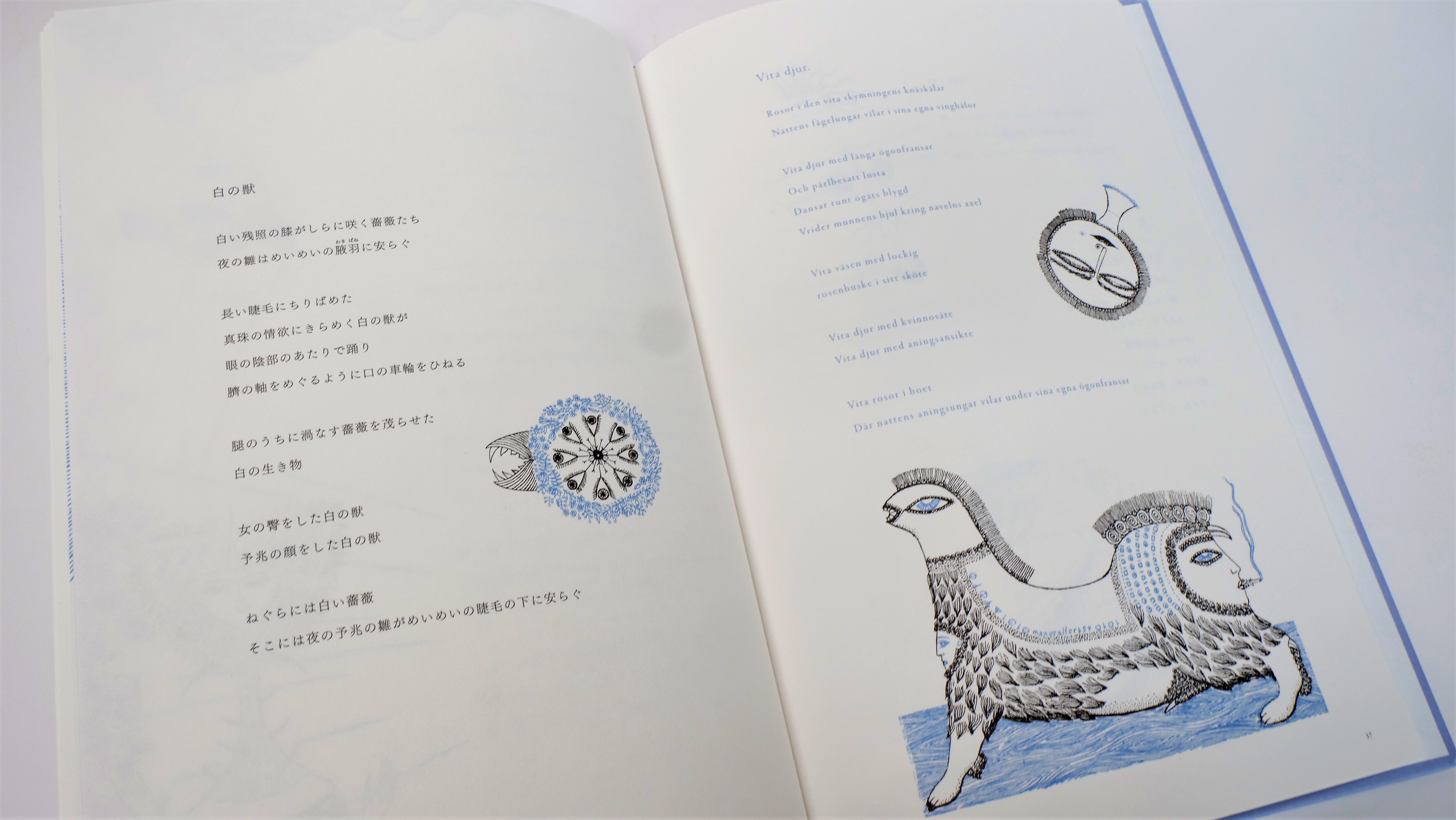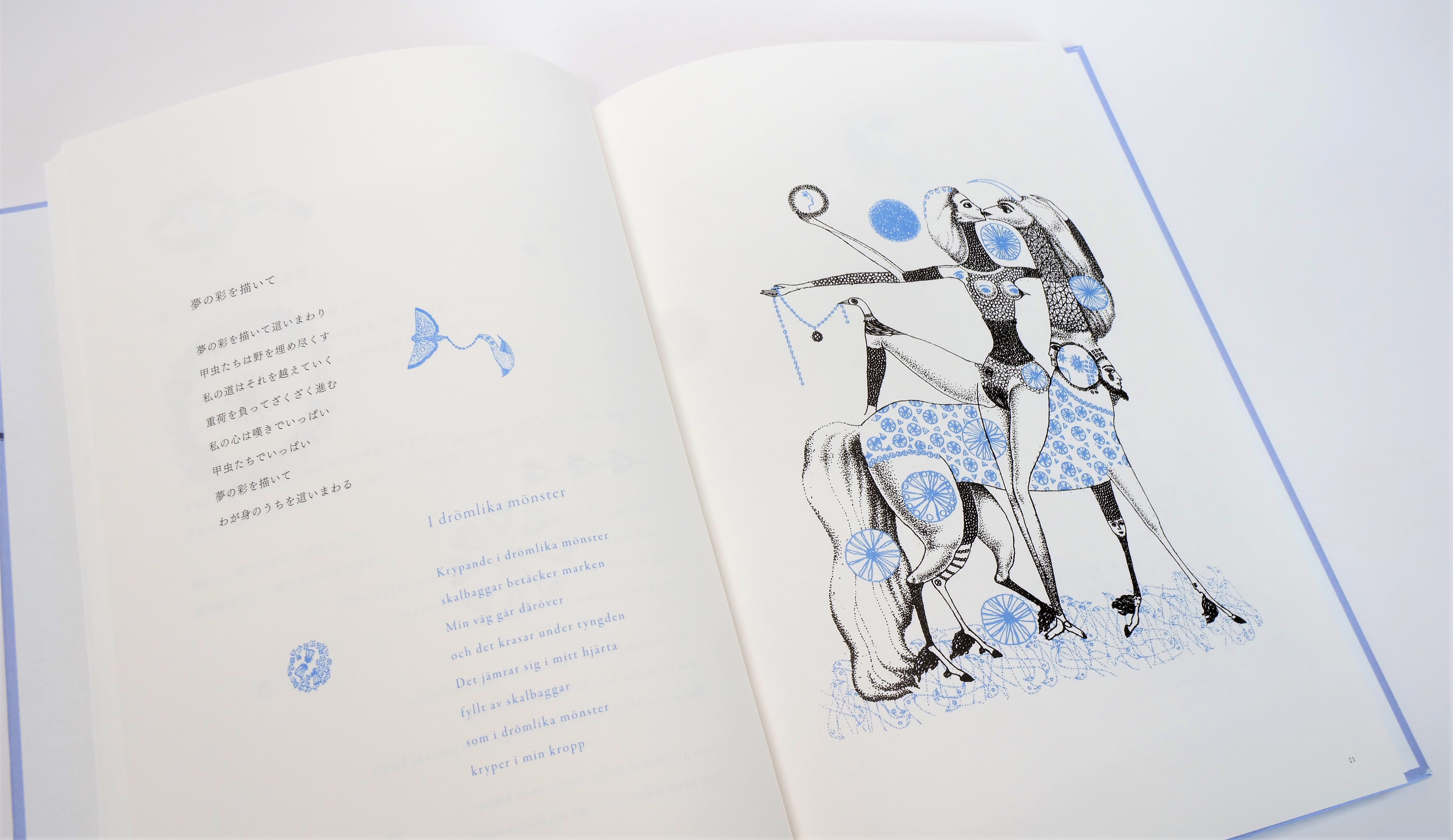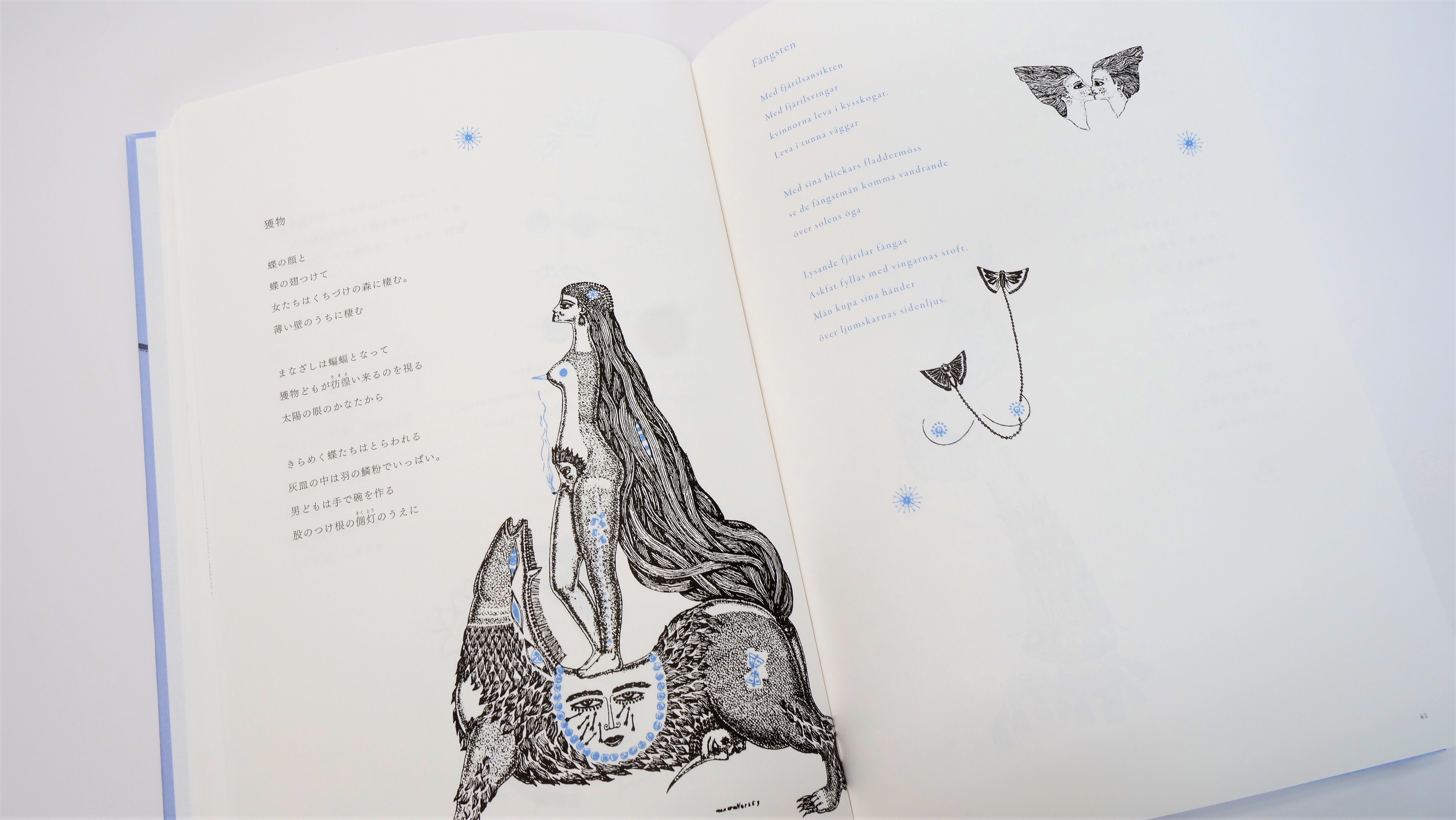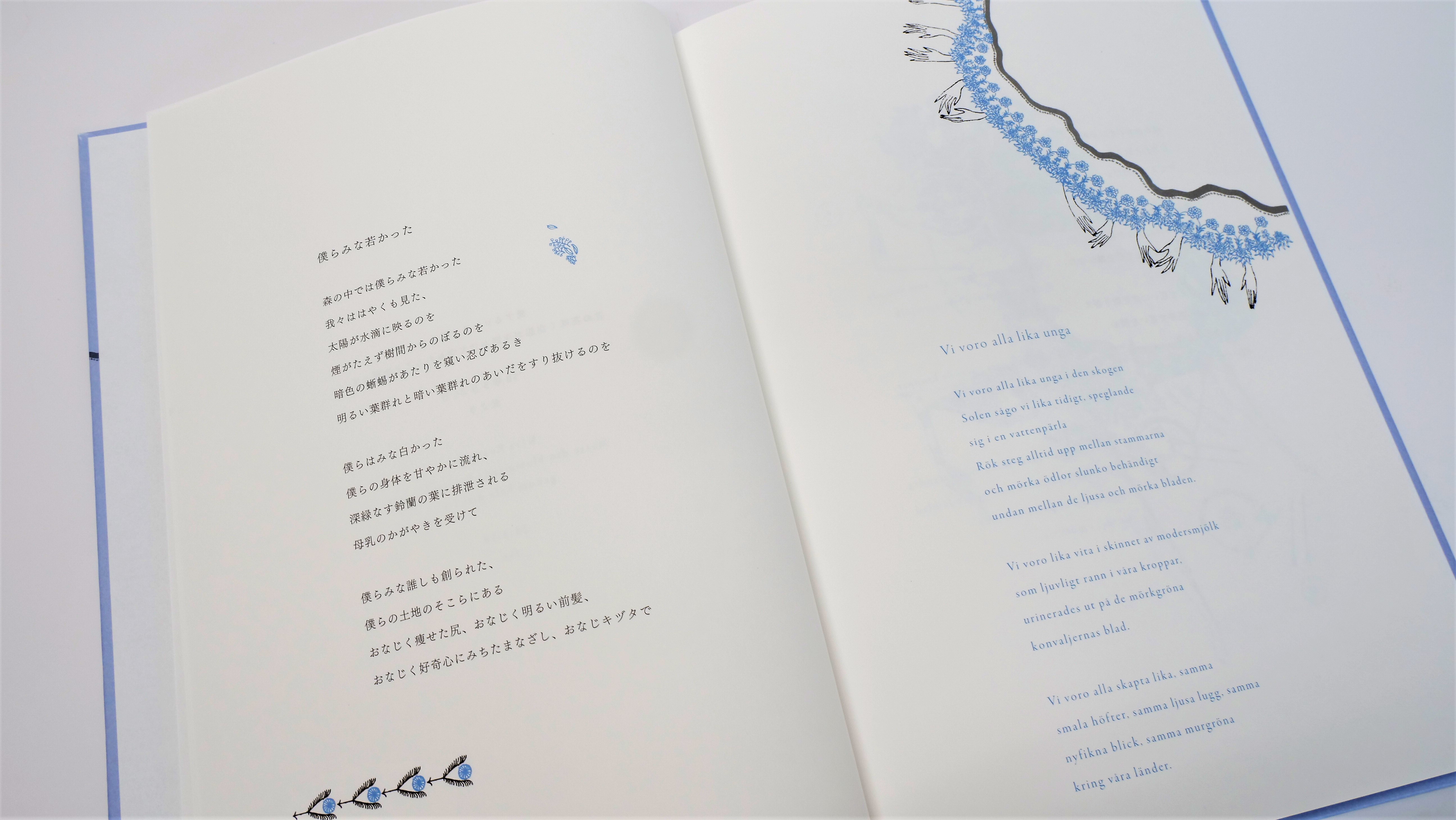 佐野裕哉氏による美しい装丁は、スウェーデンの白夜を思わせる冷たく淡いブルーに、銀でタイトルの『Åren』が箔押しされています。つかのま現実を忘れ、蠱惑的な夢の世界に誘ってくれる美麗な詩集です。ぜひ、皆様の書棚にコレクションしていただきたい一冊です。
