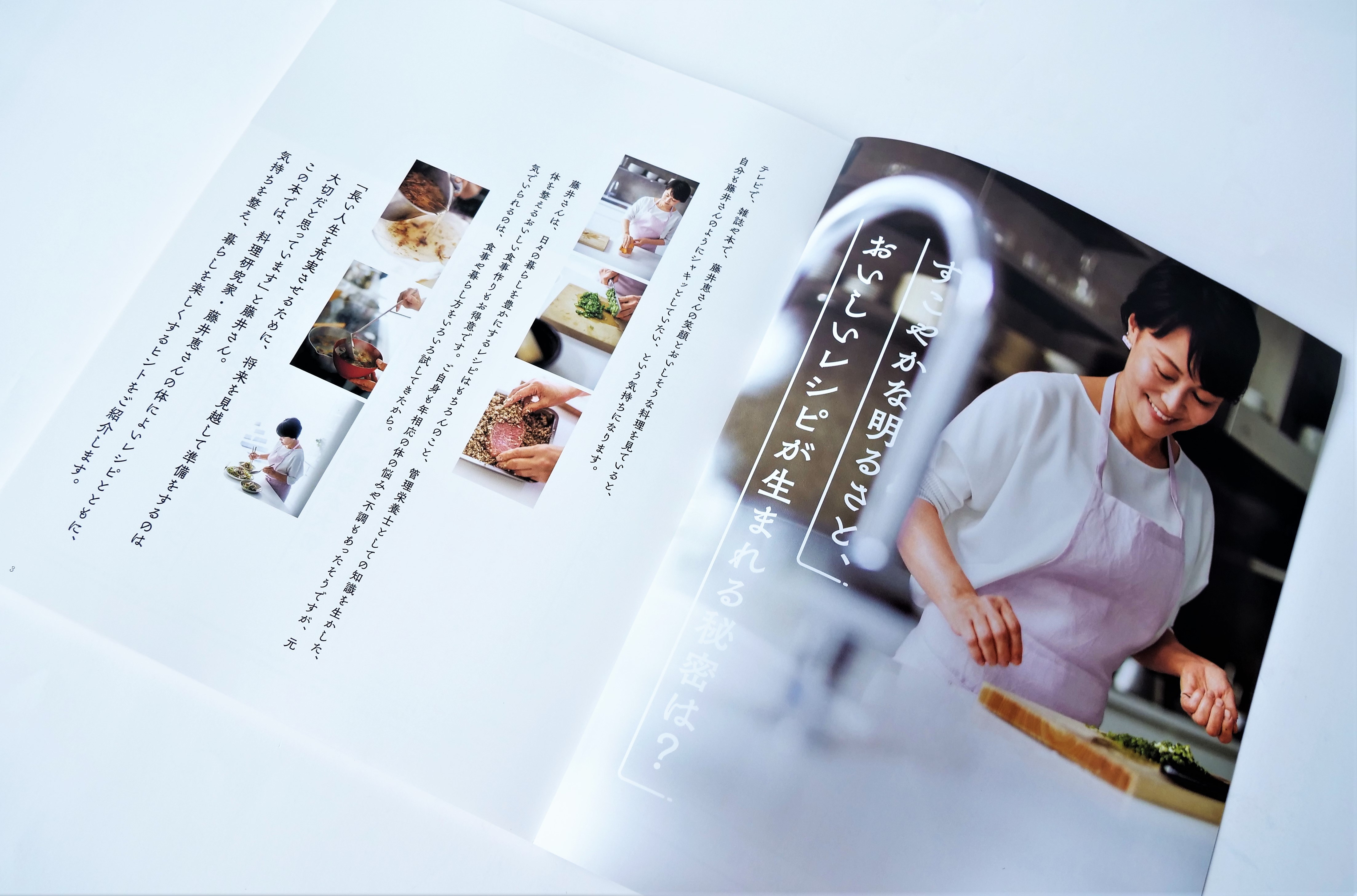 藤井先生のいきいきとした表情と、料理のシズル感に重点を置いて、全体的に明るくしマゼンタ(紅)をやや強めにして、製版いたしました。