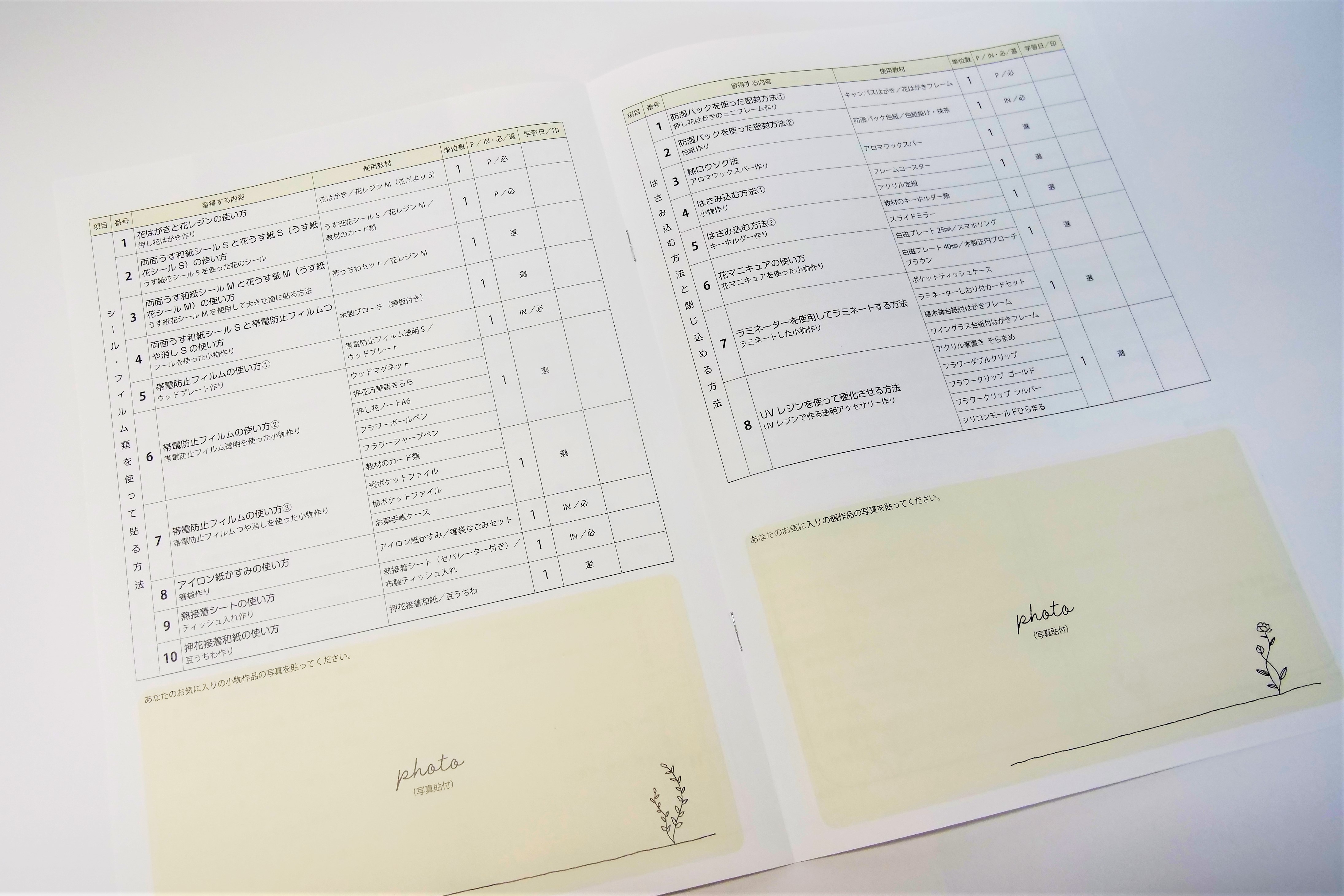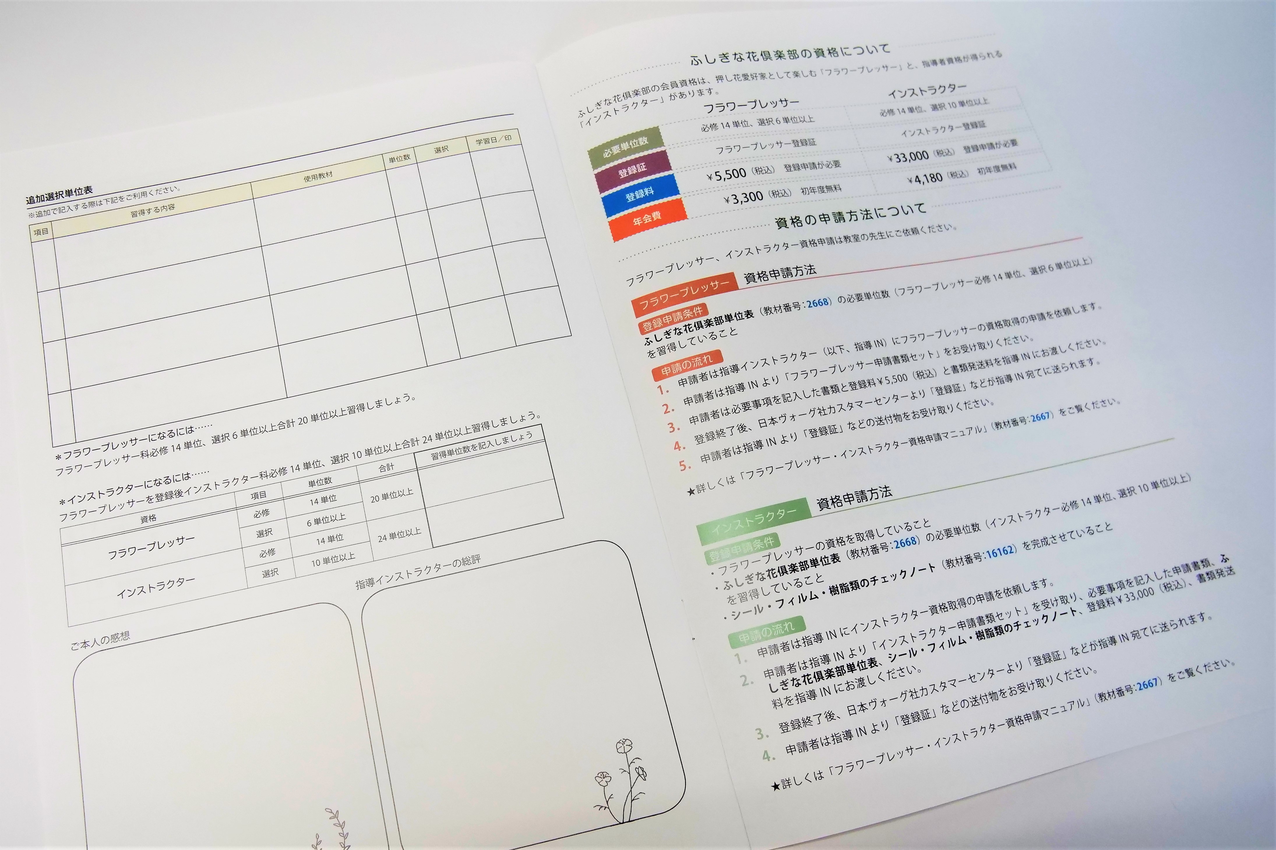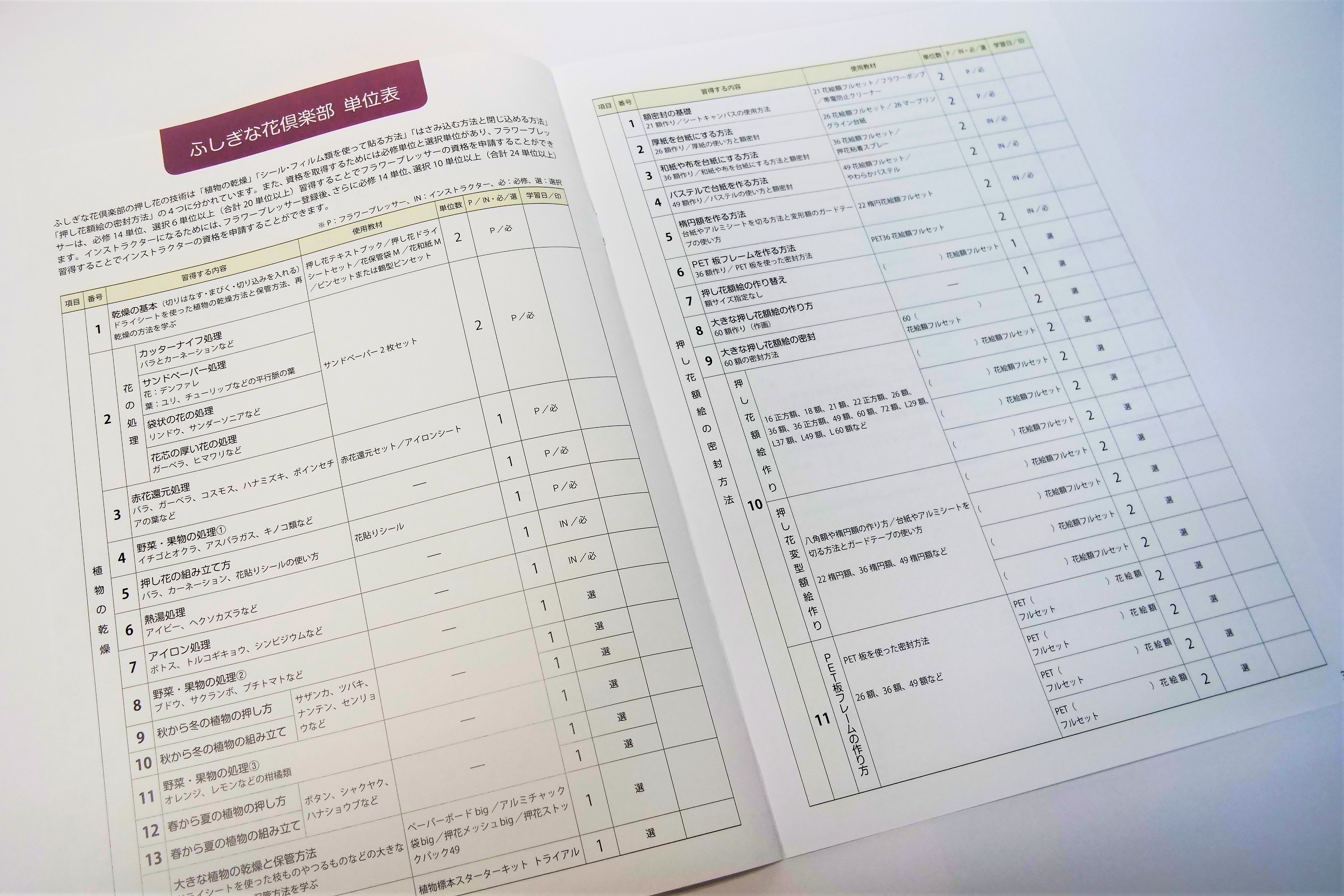 ふしぎな花倶楽部では、初めての方でも基礎からしっかりと学べるカリキュラム(単位制)があります。カリキュラムを終了することで、フラワープレッサー(押し花愛好家)・インストラクター(押し花指導者)の資格を取得することができます。