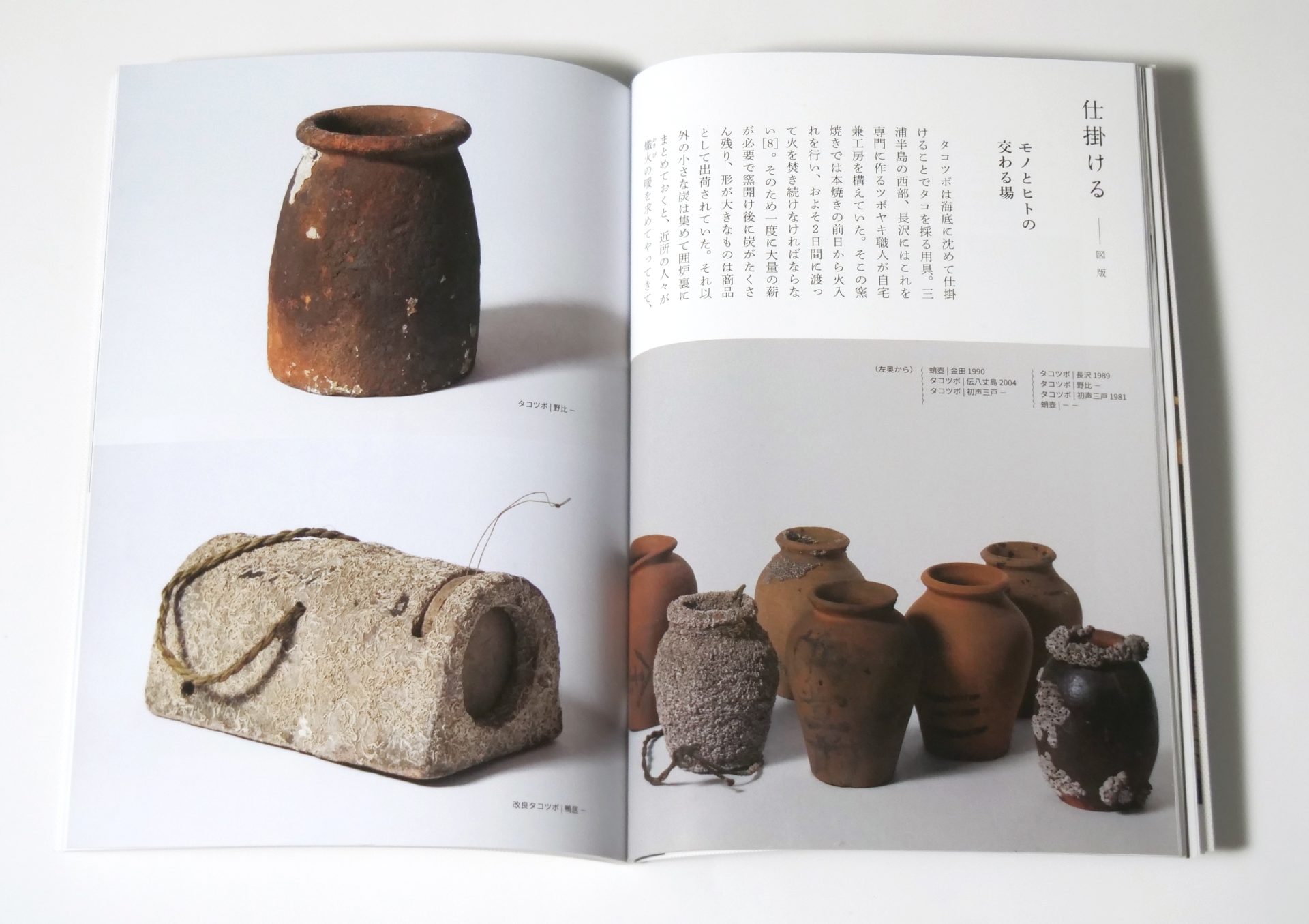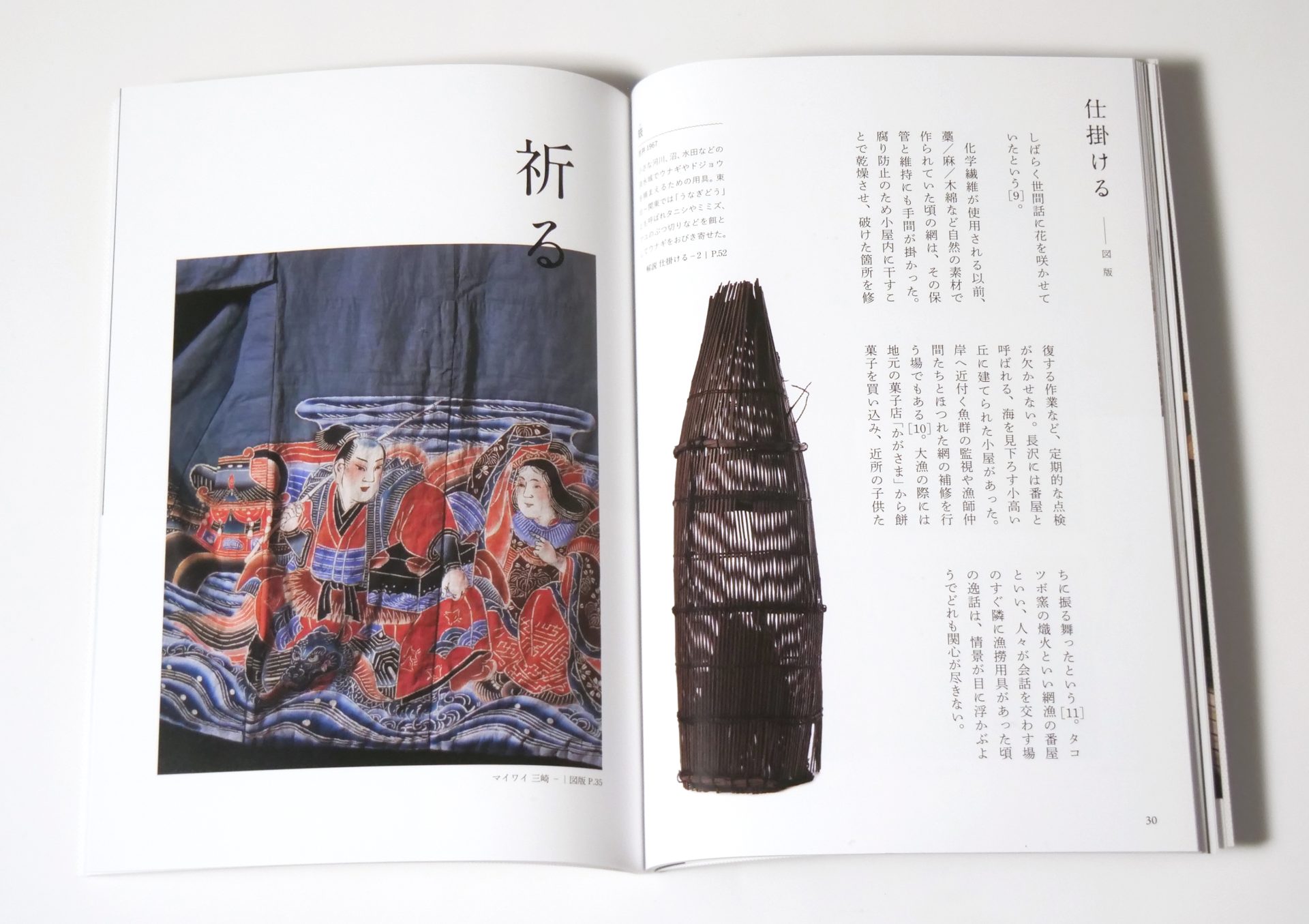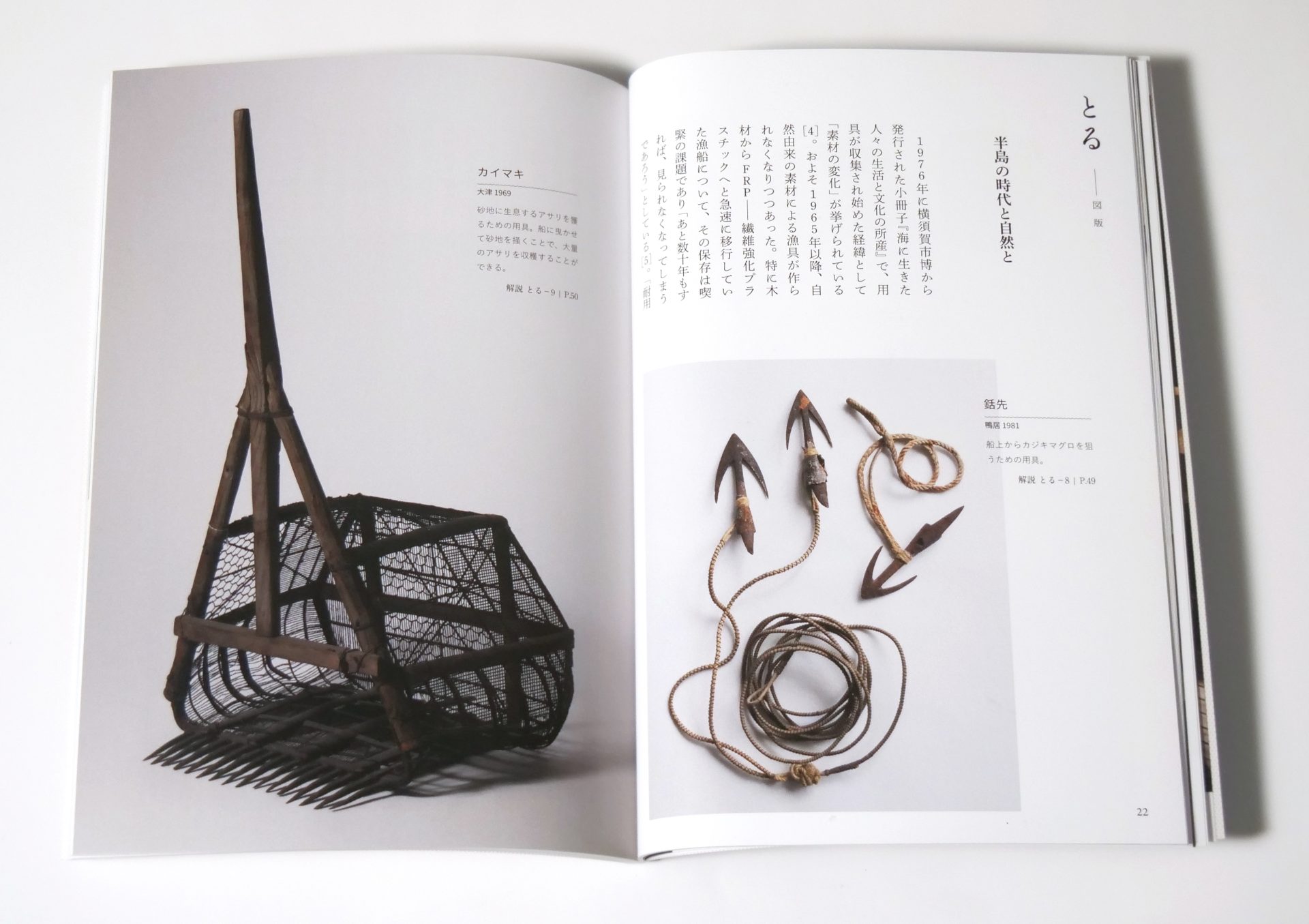 第1部は漁撈用具の写真を中心に紹介。用具の使用方法や文化的な背景を解説する第2部、第3部では長く横須賀で鮮魚店を営んできた人物からの聞き書きの他に、神奈川県立博物館が行った約50年前の民俗調査資料を元に、専門家が当時の三浦半島の生態を探るという内容です。現代の自然科学の視点から、漁撈用具が使われていた環境を立体的に掴むことができないかを模索した、とあります。
