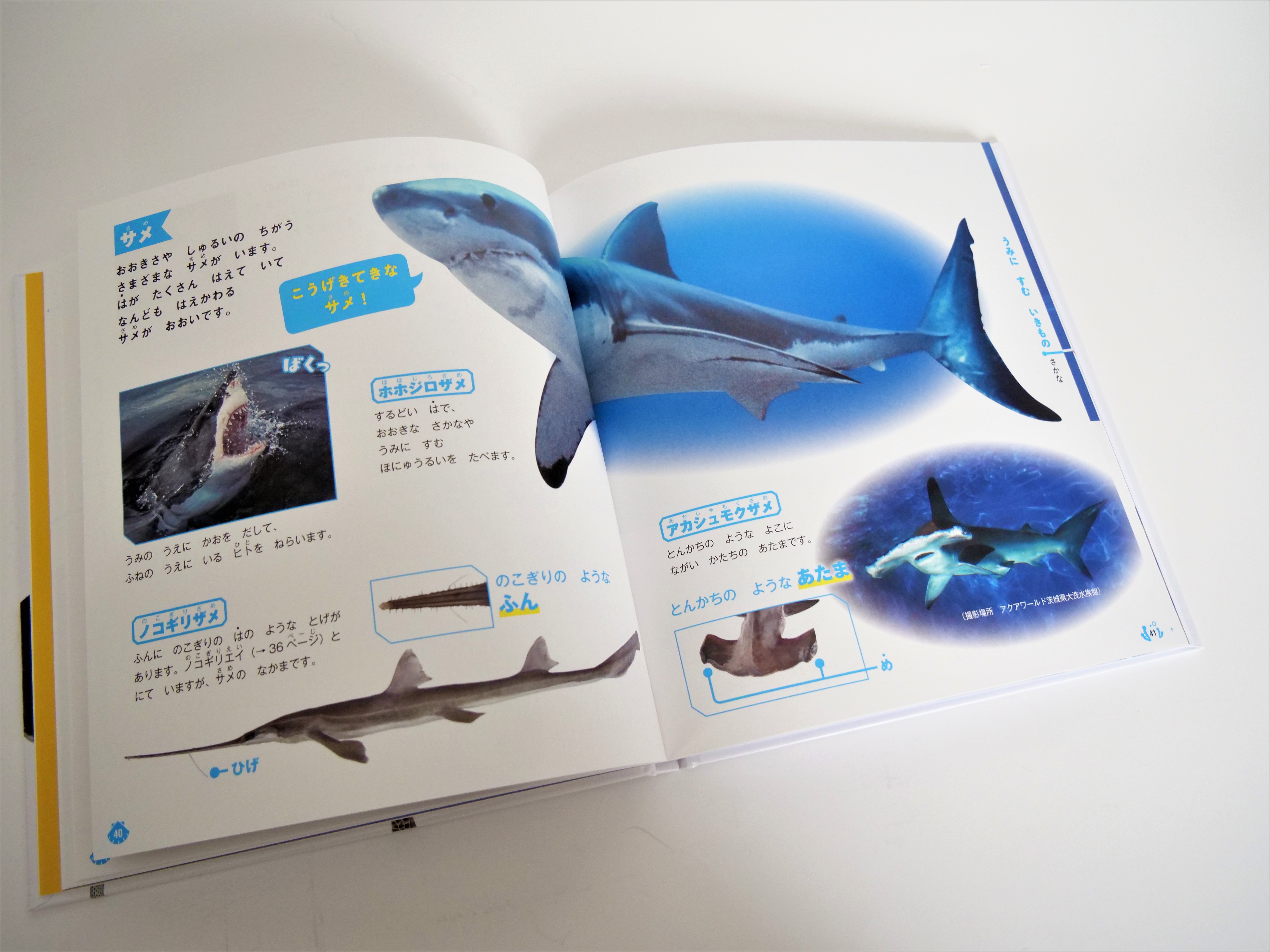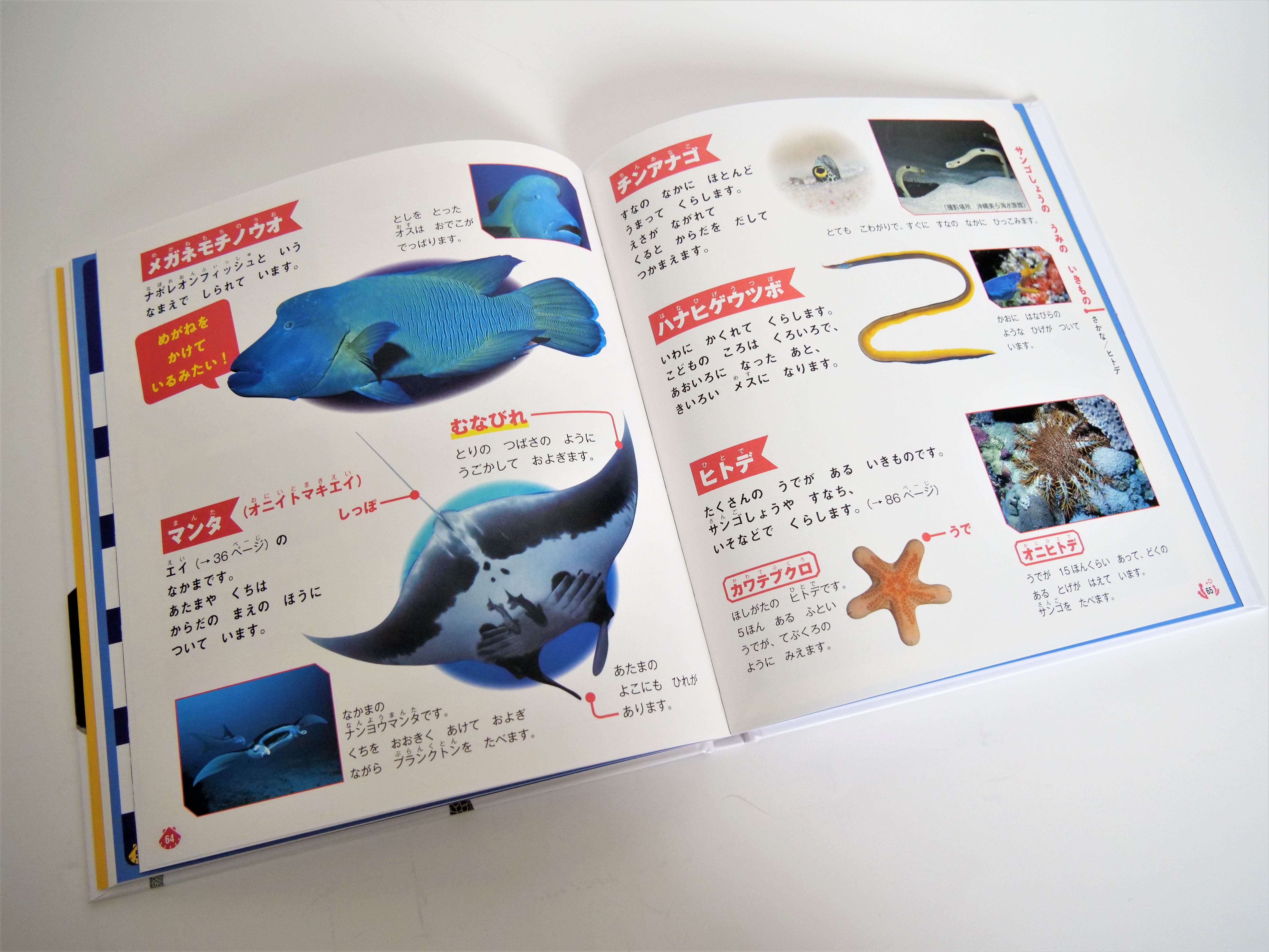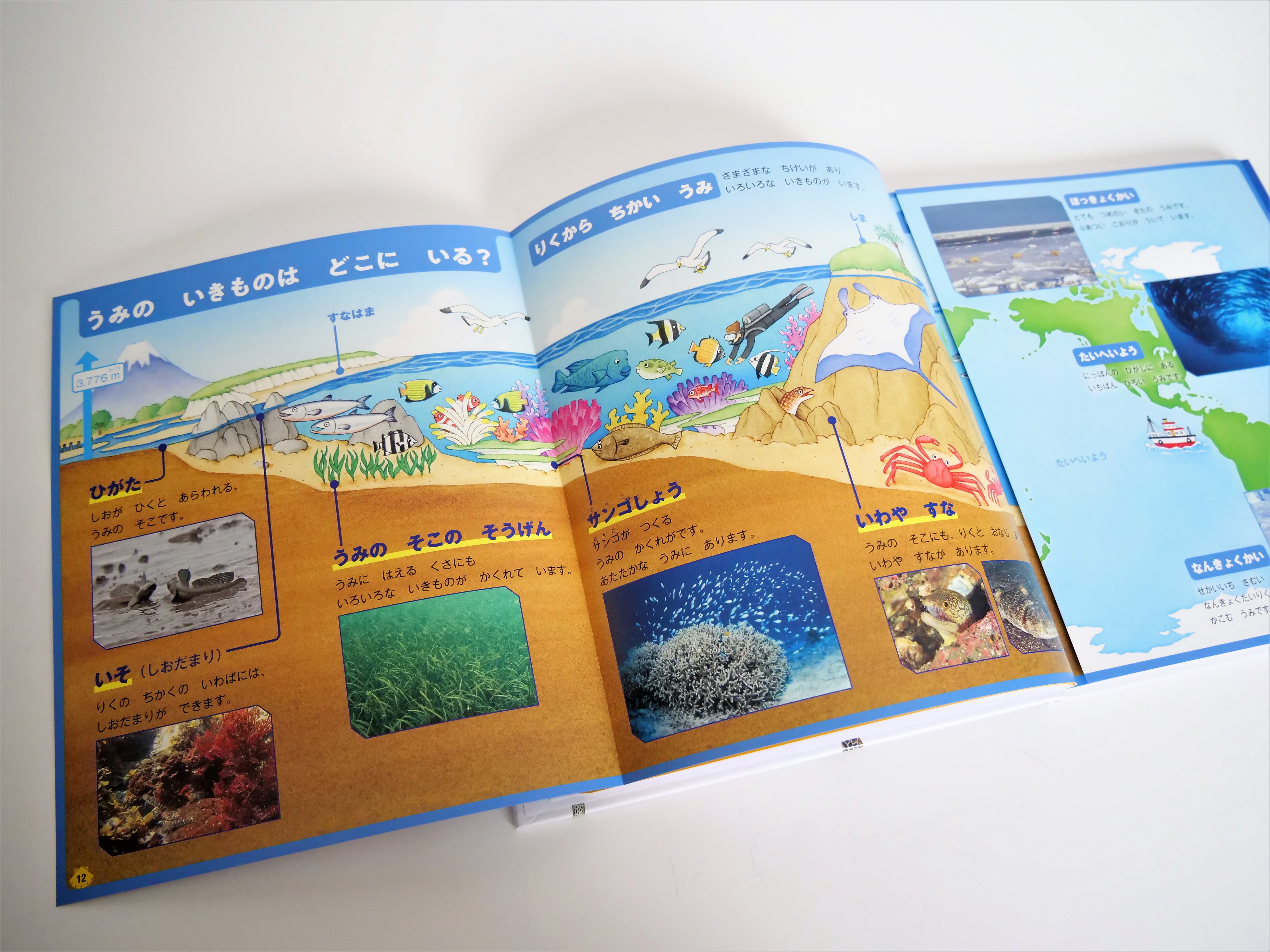 「はじめてのずかん」シリーズは、大きな写真や一目でわかる特徴など、小さなお子さまにとってわかりやすく、本を楽しめるための工夫を施した図鑑です。特に見開きページには、海底にどんな魚がいるか、昆虫がどのような場所にいるかがイラストで紹介されています。