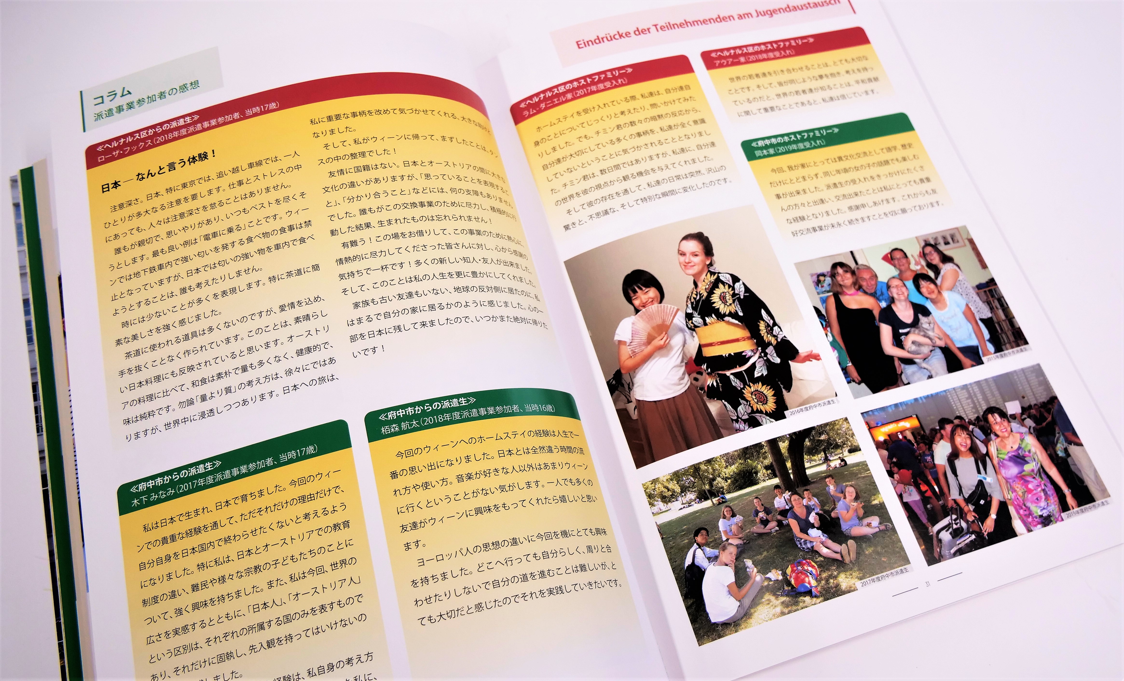 本誌では、30年間に渡る府中市とウィーン市ヘルナルス区の交流について、「友好交流のはじまり」「交流のあゆみ」「これまで、そして未来へ」の3章構成で、事例やコラムとともに紹介されています。