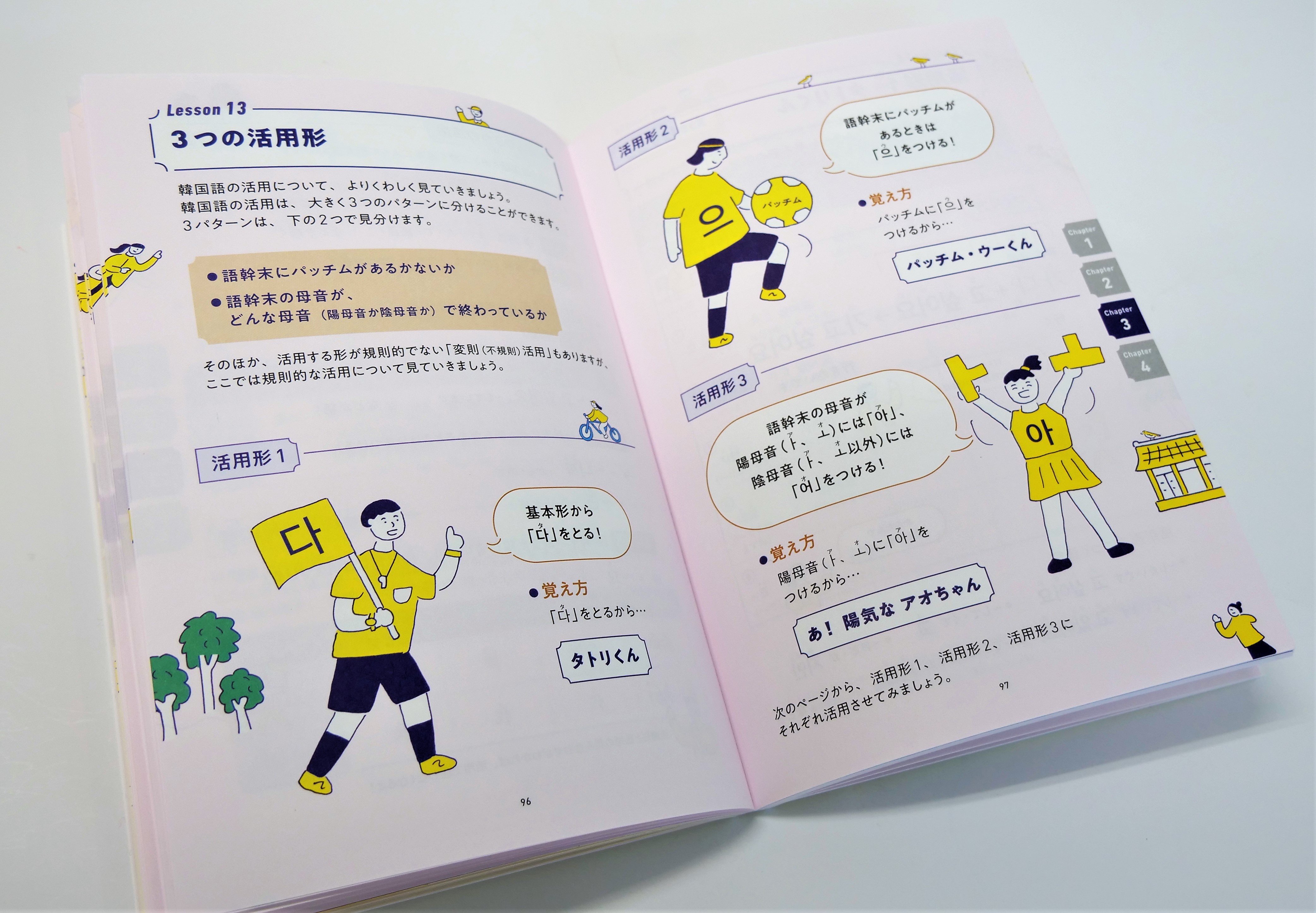初心者がつまずく活用も、イラストと図解で活用のつくり方がやさしく解説されており、「のりうつりの法則(連音化)」「カルビの法則(有声音化)」など、難しくて混乱しがちな文法用語もわかりやすく言い換えて説明しています。