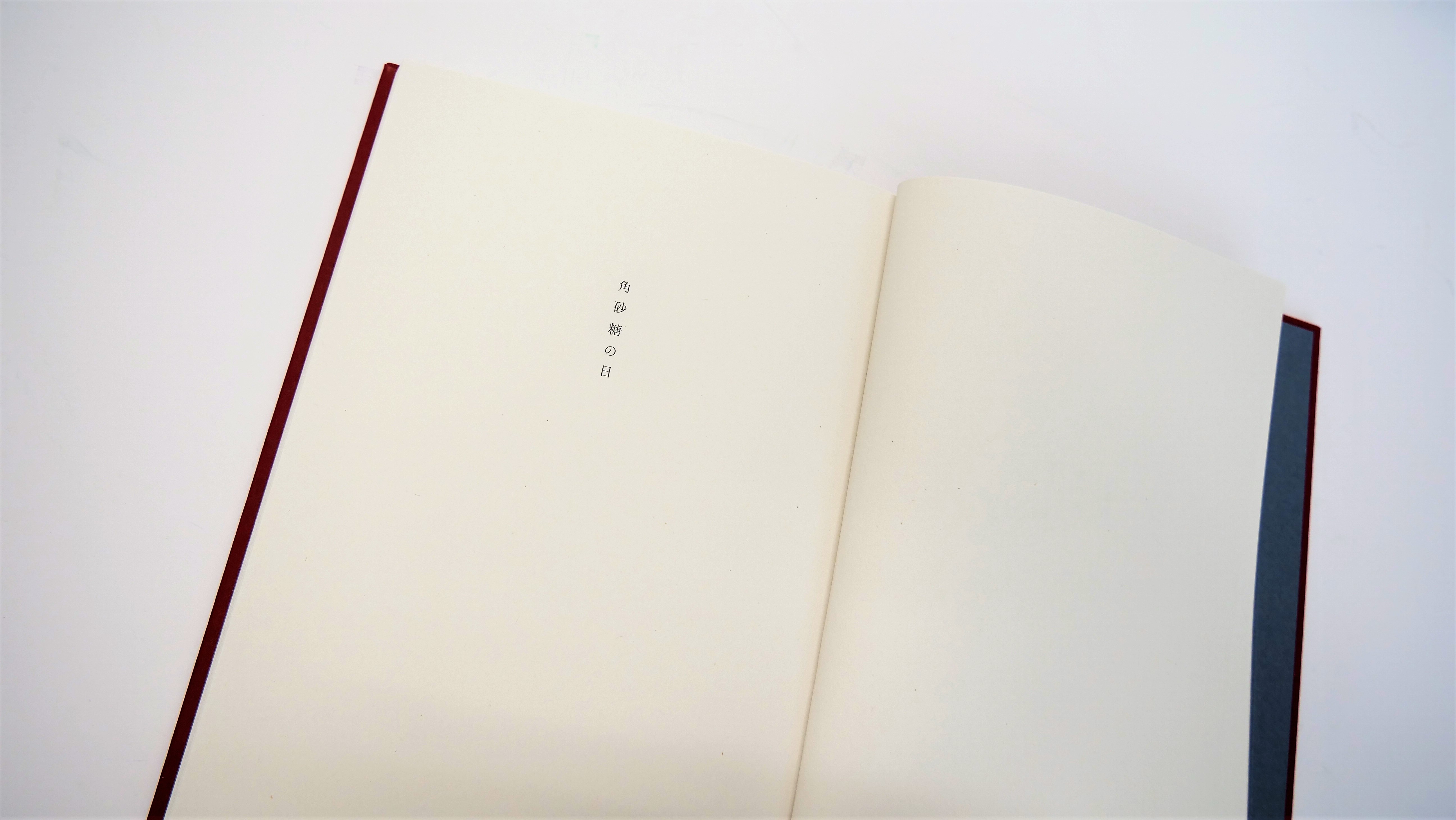 今回34年ぶりの復刊となった『新装版 角砂糖の日』は、装幀の佐野裕哉さんによって、その内容にふさわしいとても美しい本となっています。白いケースと深い赤の表紙に描かれた角砂糖のイラストには繊細な金の箔押しが施されています。