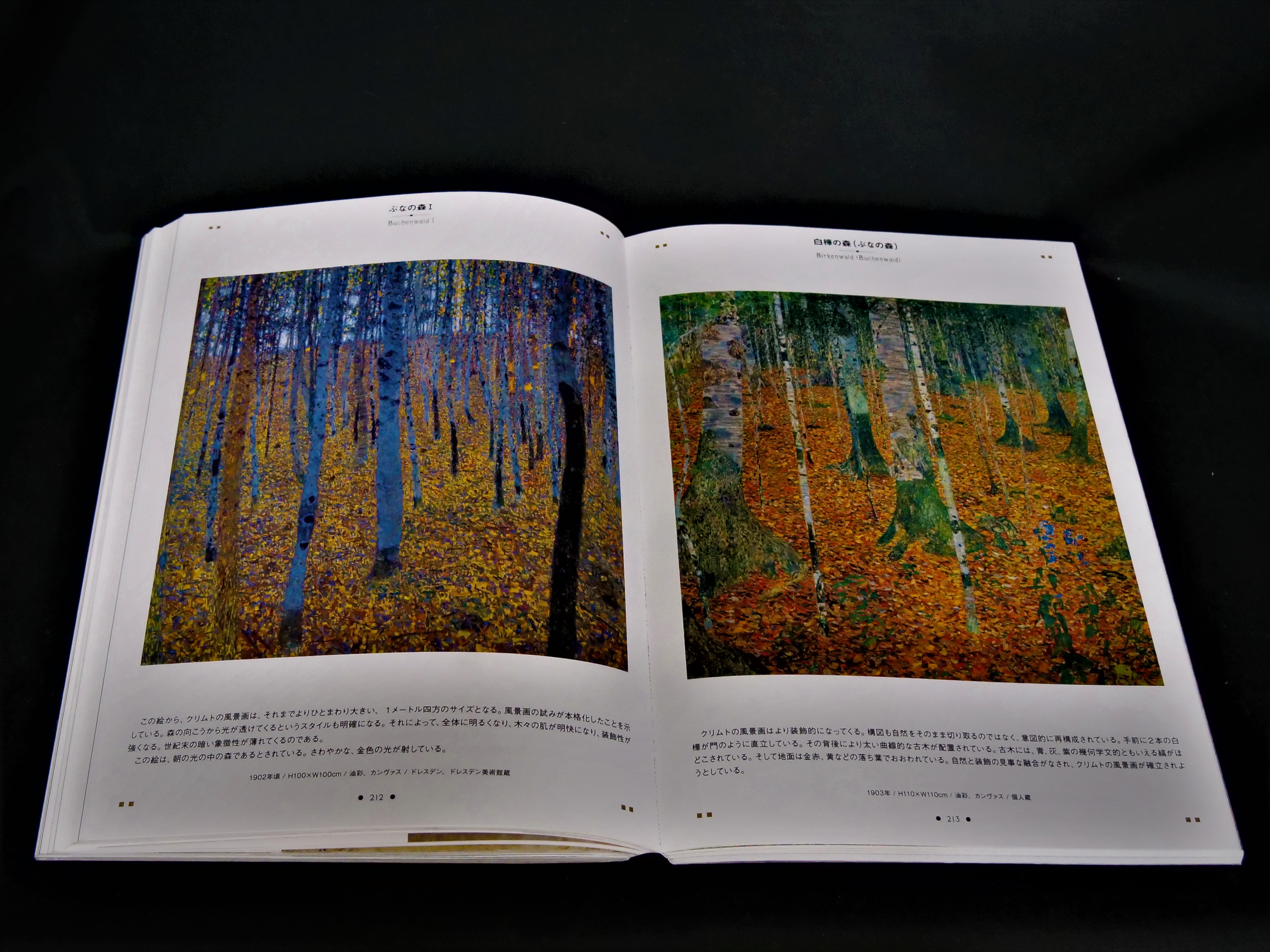 クリムトの黄金色を象徴する美しい装丁や本文デザインを十二分に活かすために、限界まで金インキと銀インキを盛り込んで最高の発色を追求しました。また今回写真でご紹介できないのが残念なのですが、片観音折4丁で制作した6ページ分相当の見開きが大迫力です。