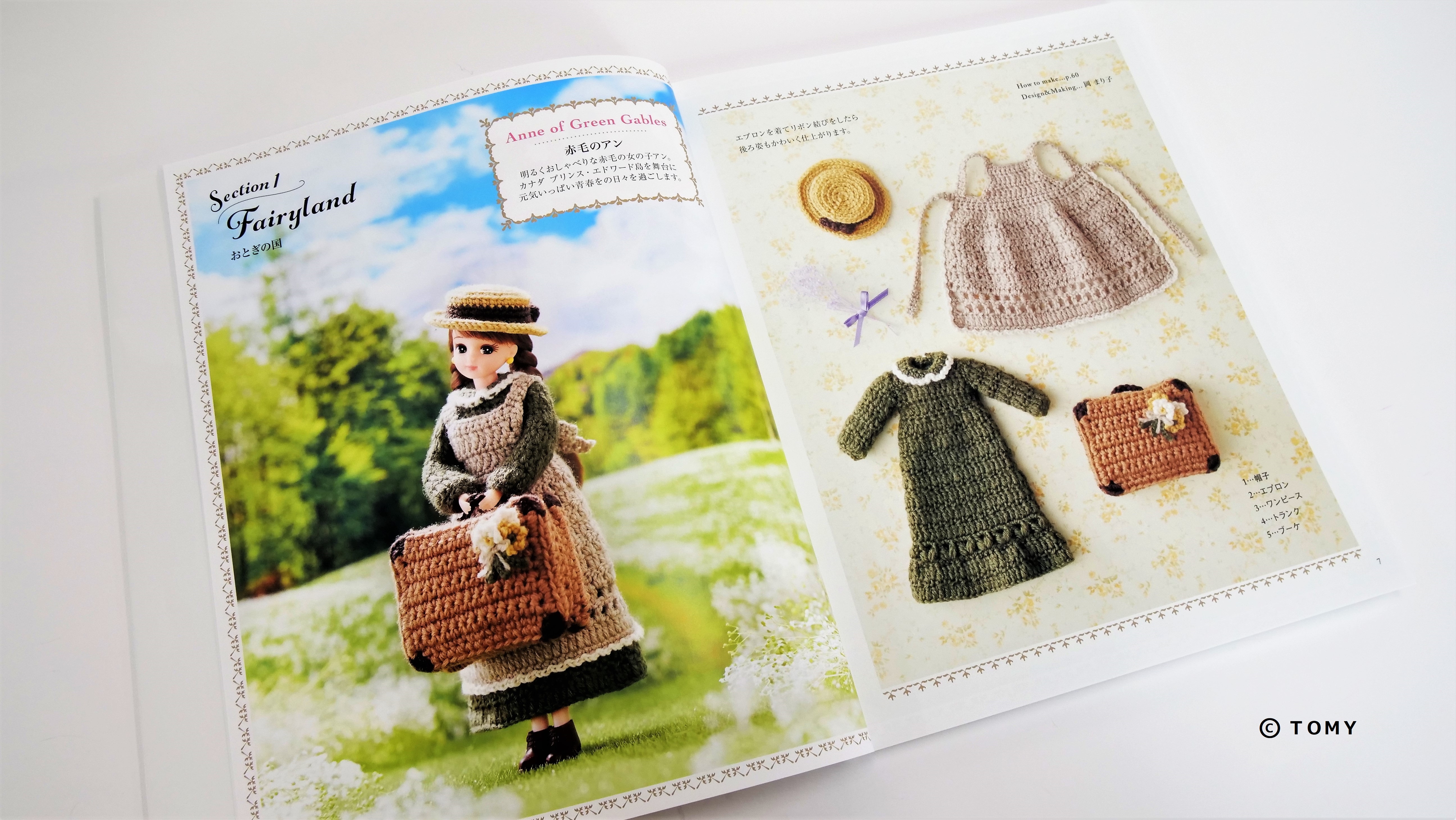 赤毛のアンや赤ずきん、人魚姫などのおとぎ話の主人公シリーズ、ルームウェアや伝統ニットなどのカジュアルな普段着、ウエディングドレスやプリンセスドレスなどのきらびやかなドレス、白無垢や袴などの和装の4つのテーマにわけて、バリエーション豊富に紹介。初心者でも安心して編めるよう、写真での詳しいポイントレッスンつき。また、作品の糸紹介、この本で使用した編み目記号とその編み方の基礎なども詳しく解説されています。着せたいリカちゃんの髪の色に合わせて配色を変えたり、アレンジも楽しめます。