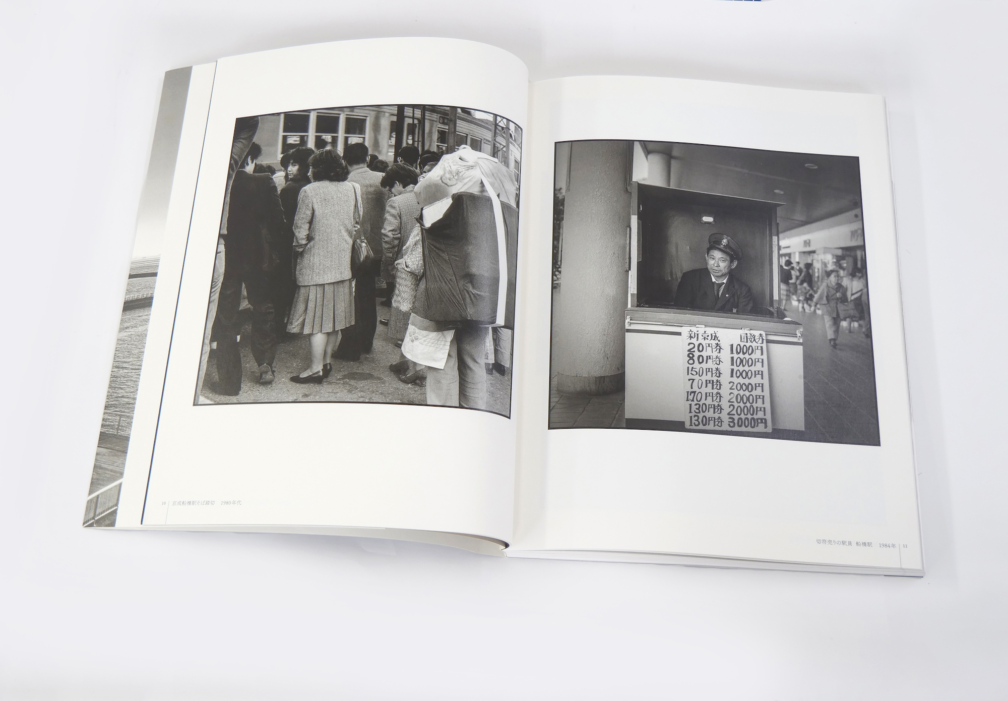 踏切に並ぶ人々を捉えた写真に写る女性が纏う肩幅の広いジャケット。80年代を象徴するような豪奢なシルエットが印象的ですが、その後ろ姿からは、どこかバブル期直前の日本人の徒労感や物哀しさのようなものが伝わってきます。そして、踏切の前には、通勤客に混じって、行商と思しき大きな荷物を背負った人も写りこんでいます。