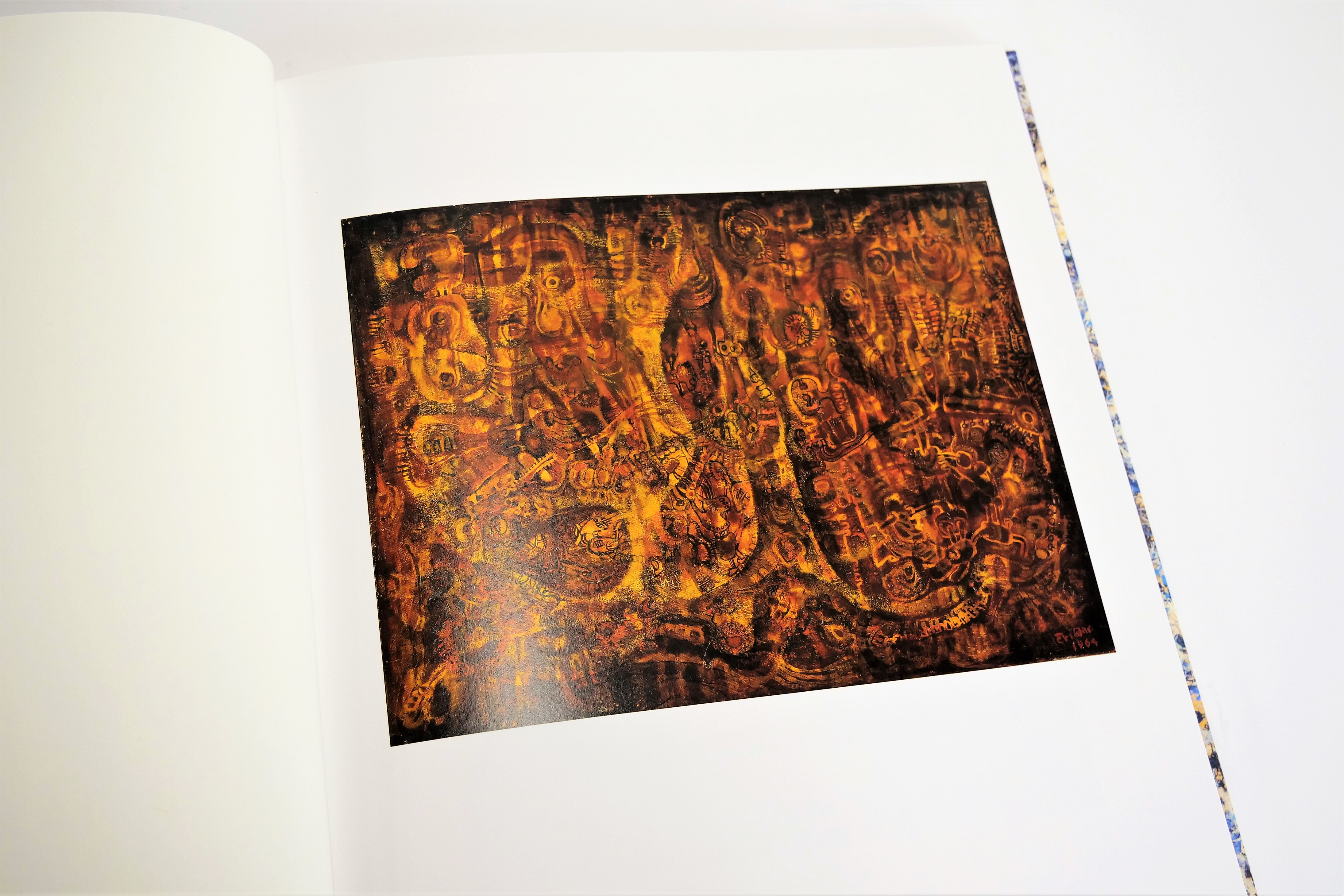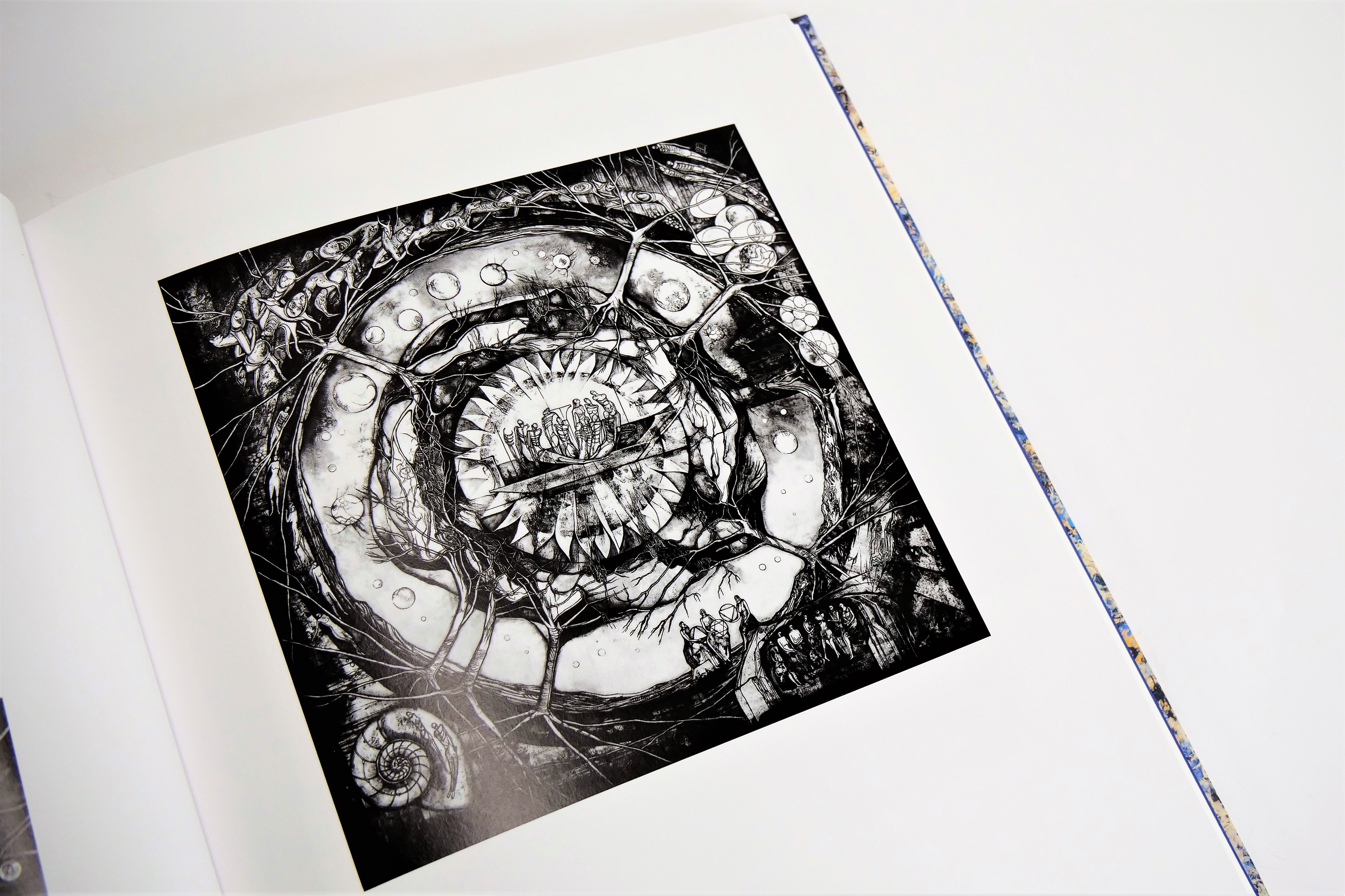 今回の作品集のタイトルでもあるブルーの曼荼羅は、幾層も重ねられた絵具を削り取っては、さらに幾層にも重ねた重厚な画面に、動物の骨や卵のような形象が緩みのない線で描かれています。この現代の曼荼羅を前にした時、私たちも己の傲慢を省み、奪われた命の尊さに思いを遣ることができるのでしょう。