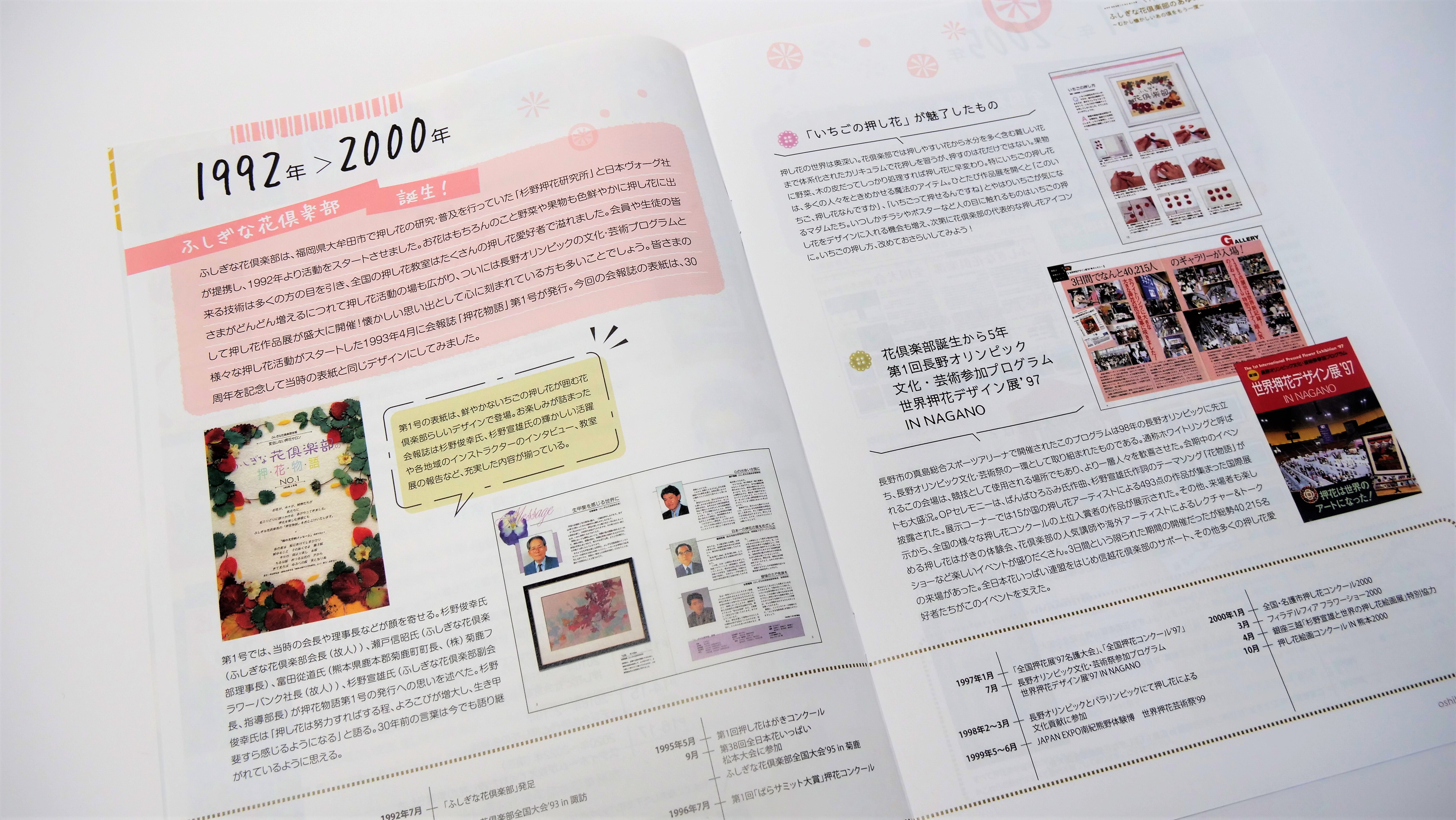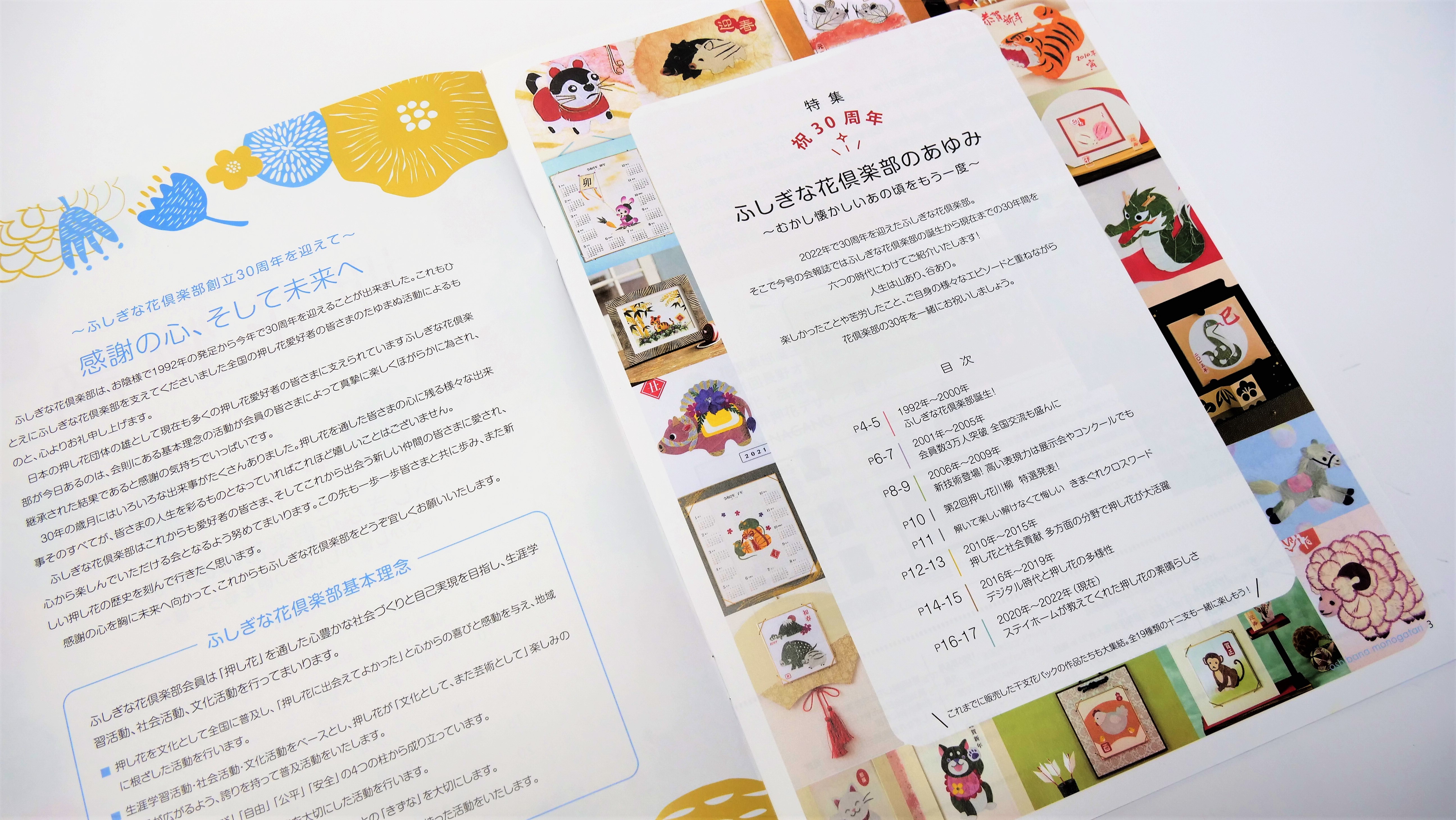 ふしぎな花倶楽部は、日本の押し花団体の雄として現在も多くの押し花愛好者の方々に支えられ、会員の皆様は「押し花」を通した心豊かな社会づくりと自己実現を目指し、生涯学習活動、社会活動、文化活動を行っています。本誌は、1992年の発足から30周年を記念するもので、倶楽部の歴史を振り返る特集となっています。