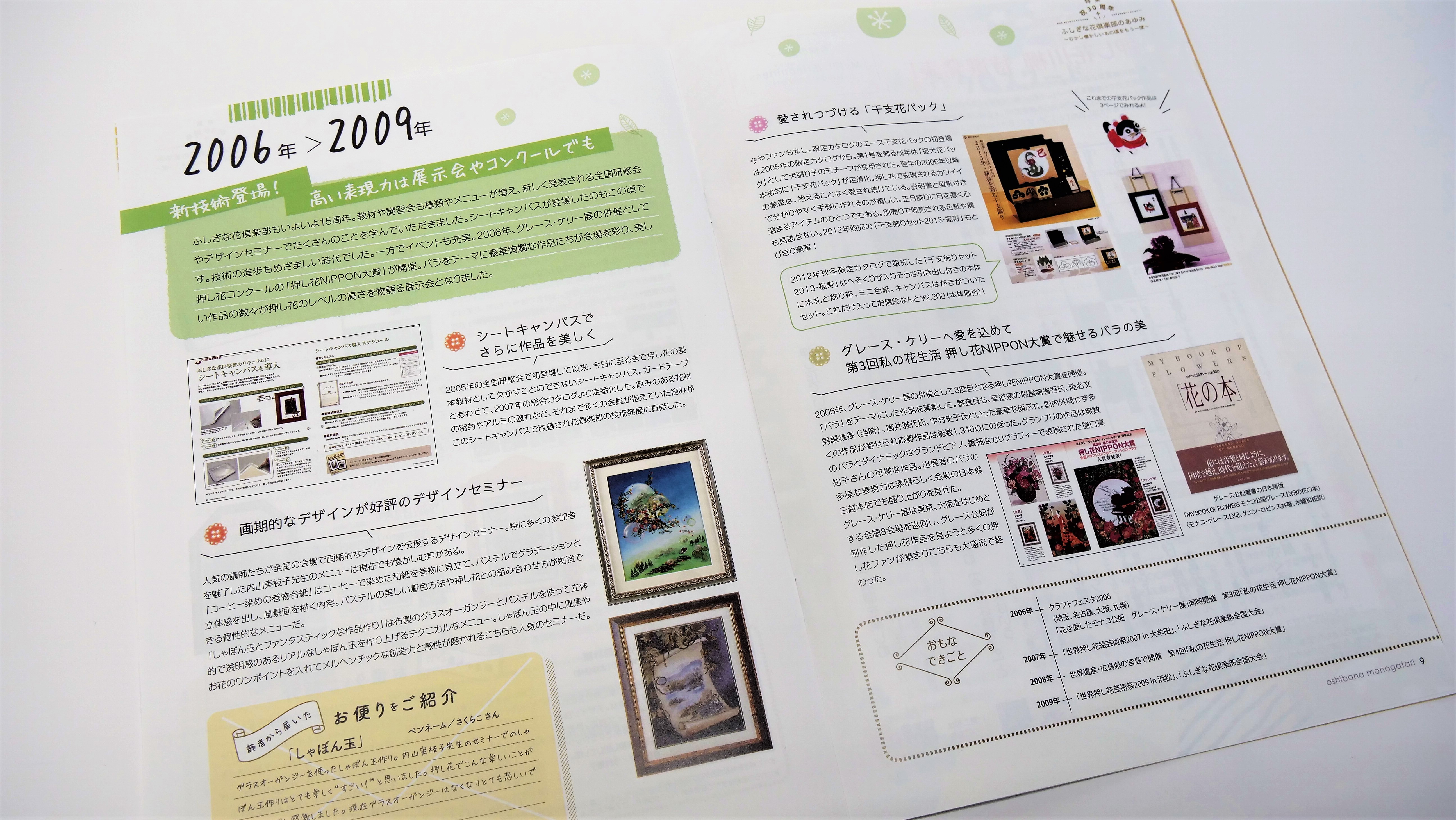 今なお愛され続ける「干支花パック」や大ヒットした「フラワーボールペン」など、ベストセラー教材や、東日本大震災時の支援活動など、30年を総括する思い出深い事例が紹介されています。