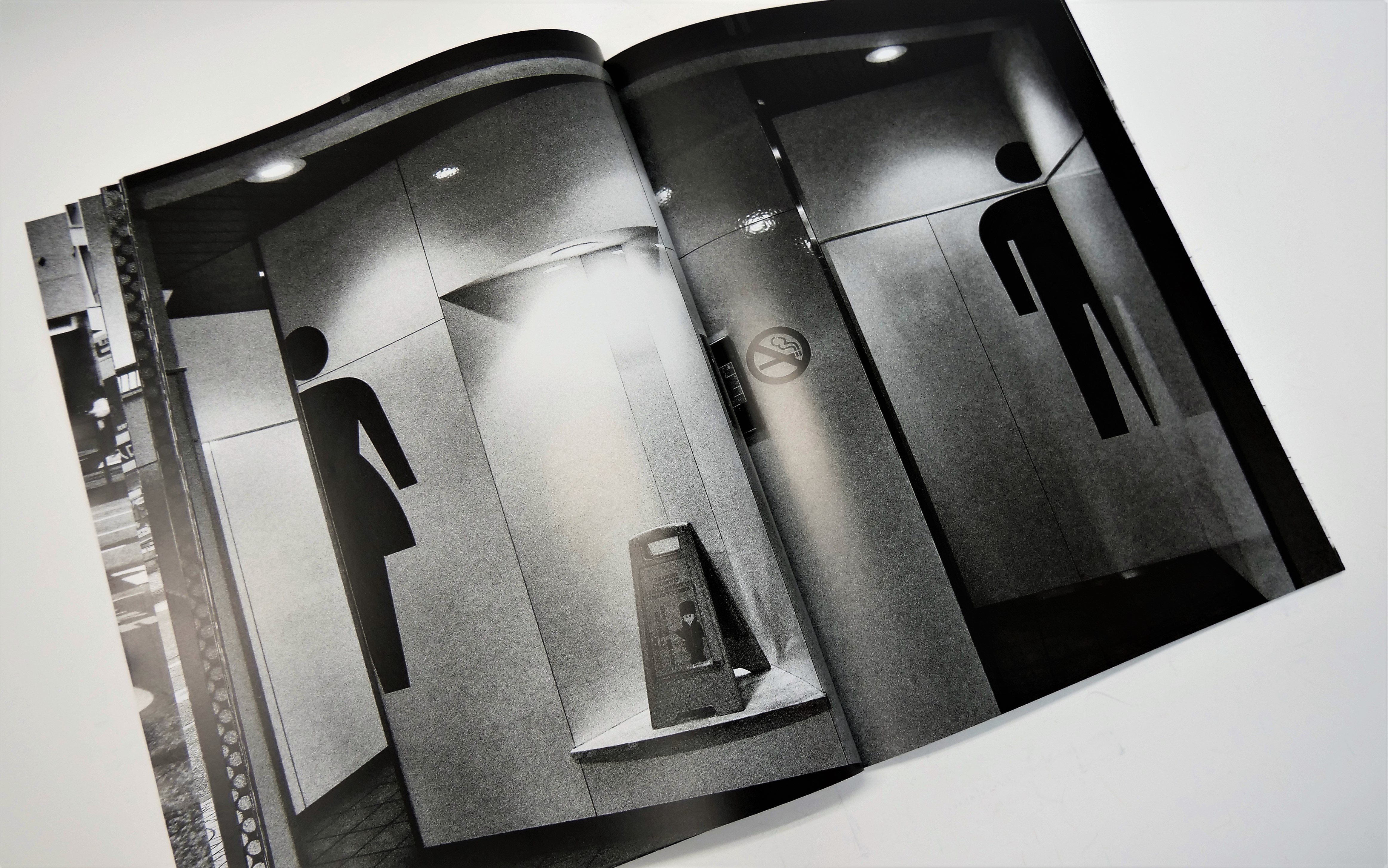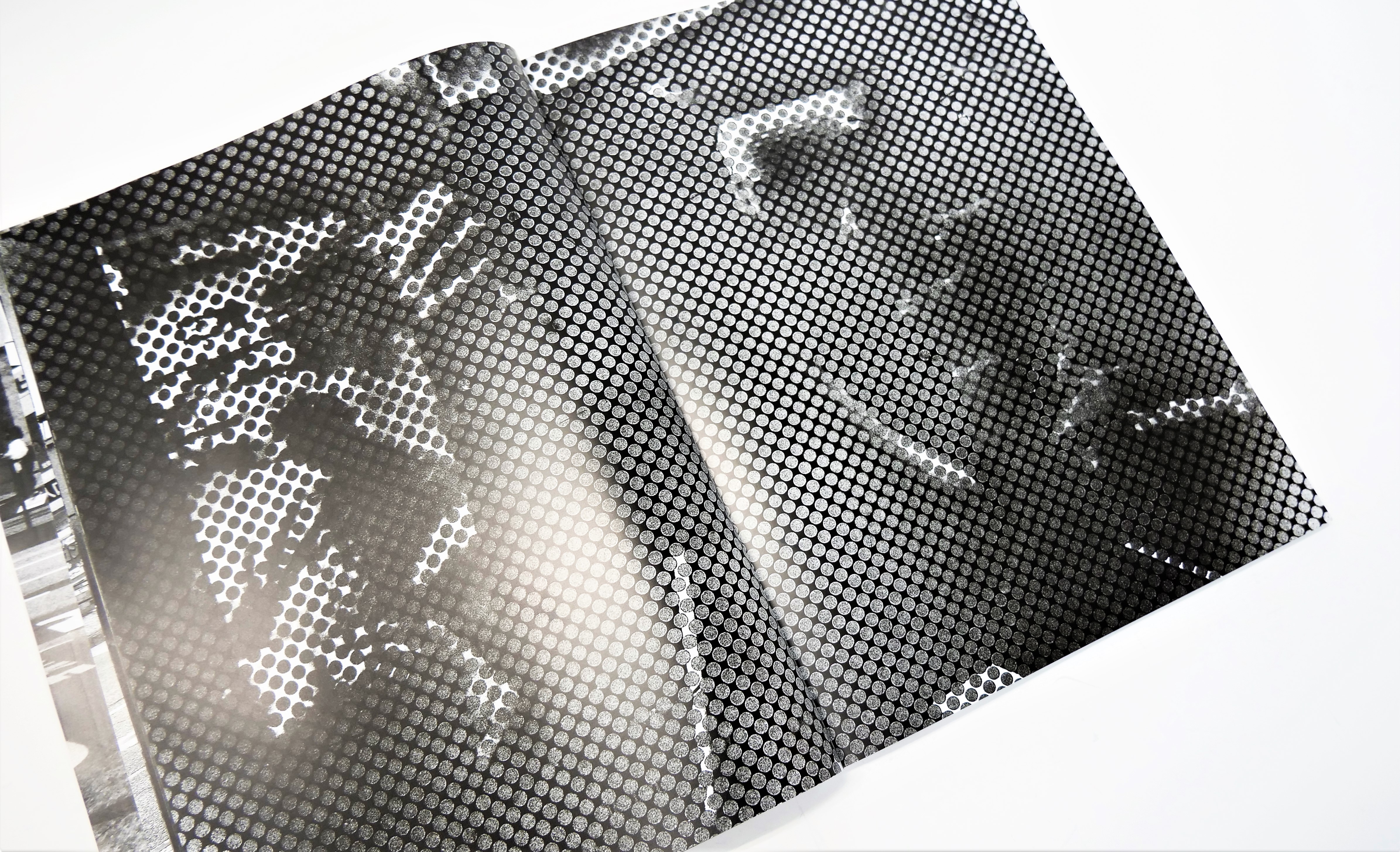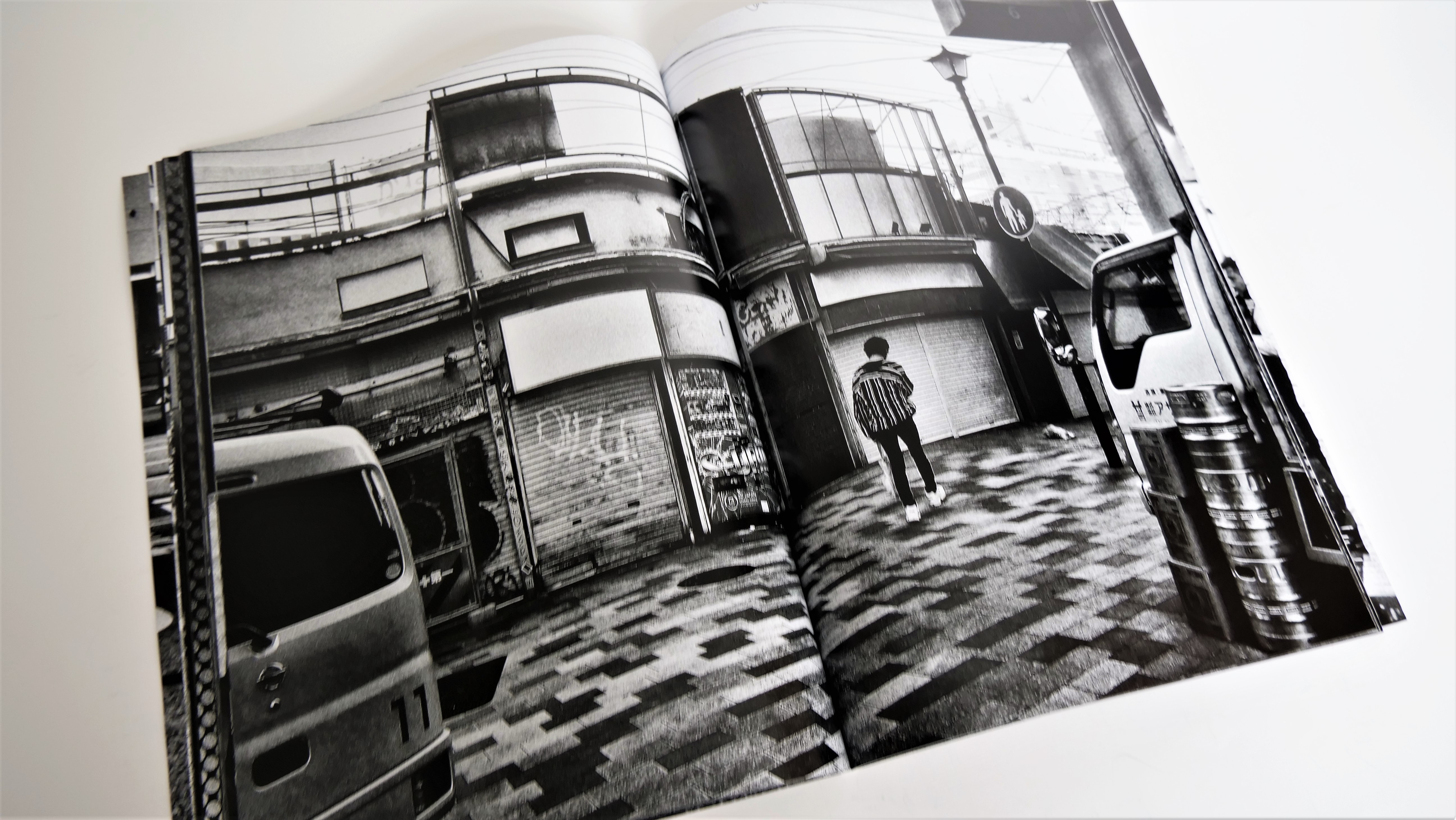 スミは濃い特殊仕様コンクスミ、グレーは大道氏の写真の印刷に合わせて、弊社が独自に配合した特に濃い「大道グレー」を使用し、階調表現を豊かに、暗部のスミの濃度を上げ濃密な印象に仕上げました。用紙の特性とUV印刷の相乗効果で、印刷面のグロス感も高まっています。