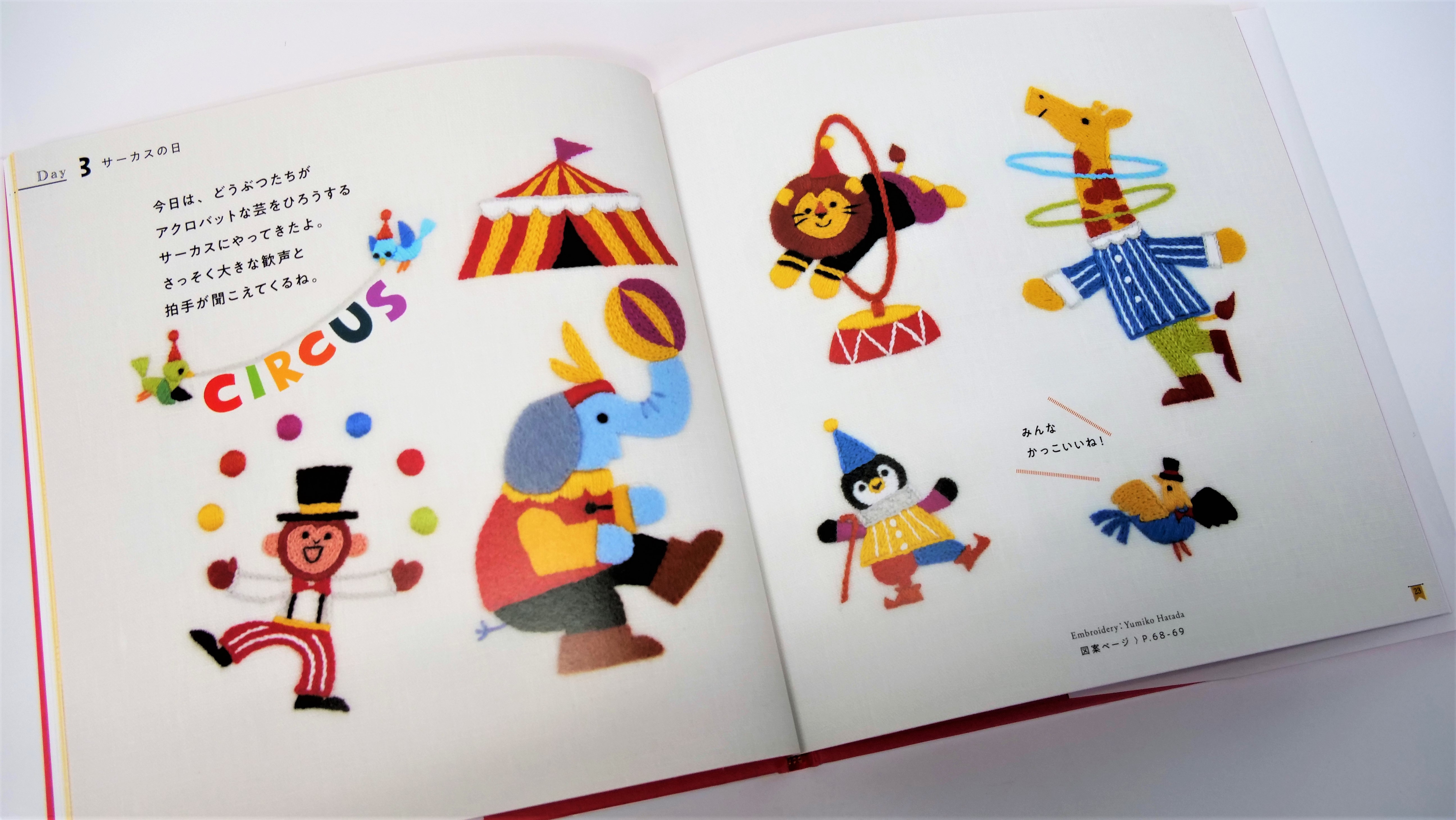 1羽のことりが、愉快などうぶつのおともだちと過ごす楽しい毎日の図案です。サーカス、遊園地、パーティー、音楽のパレード、数字、アルファベットなど、Happyなモチーフがいっぱい!