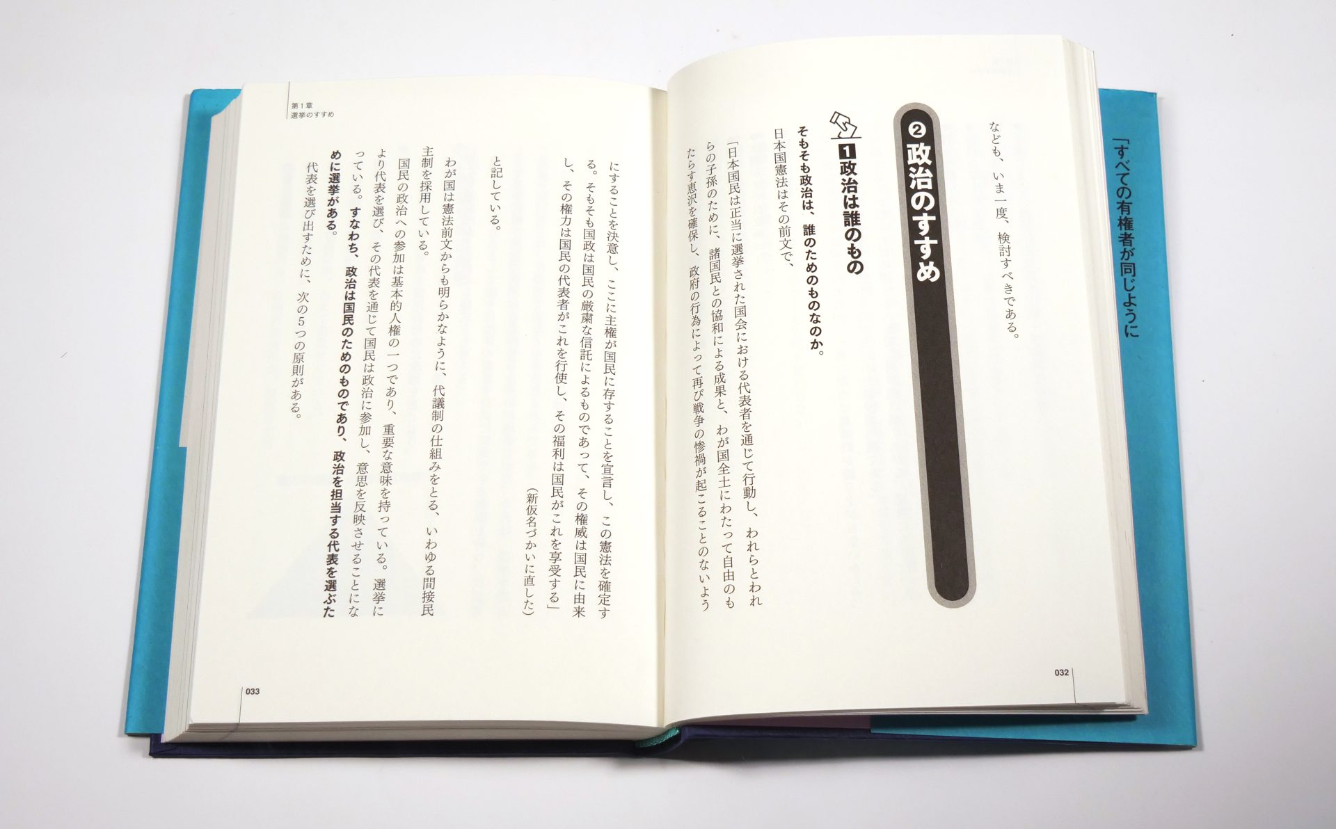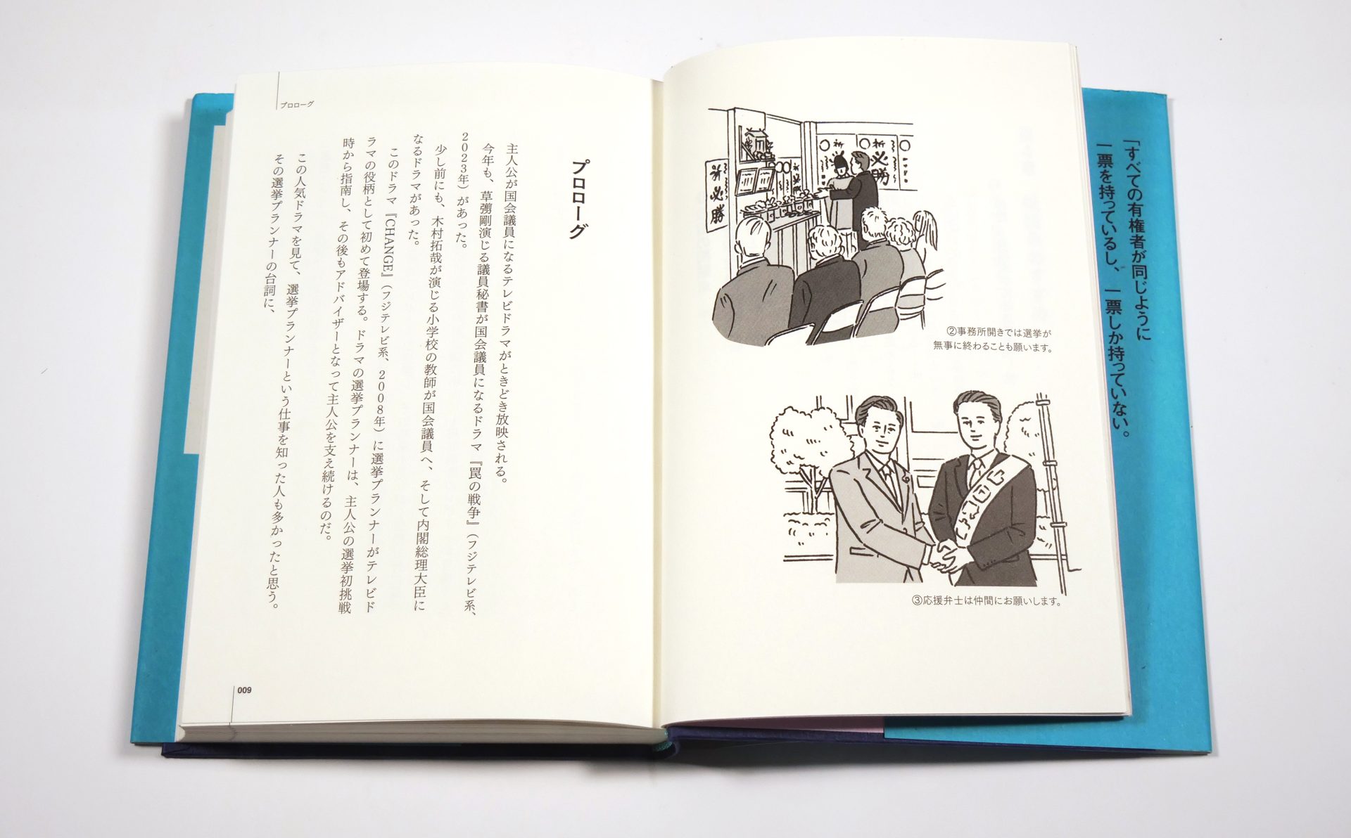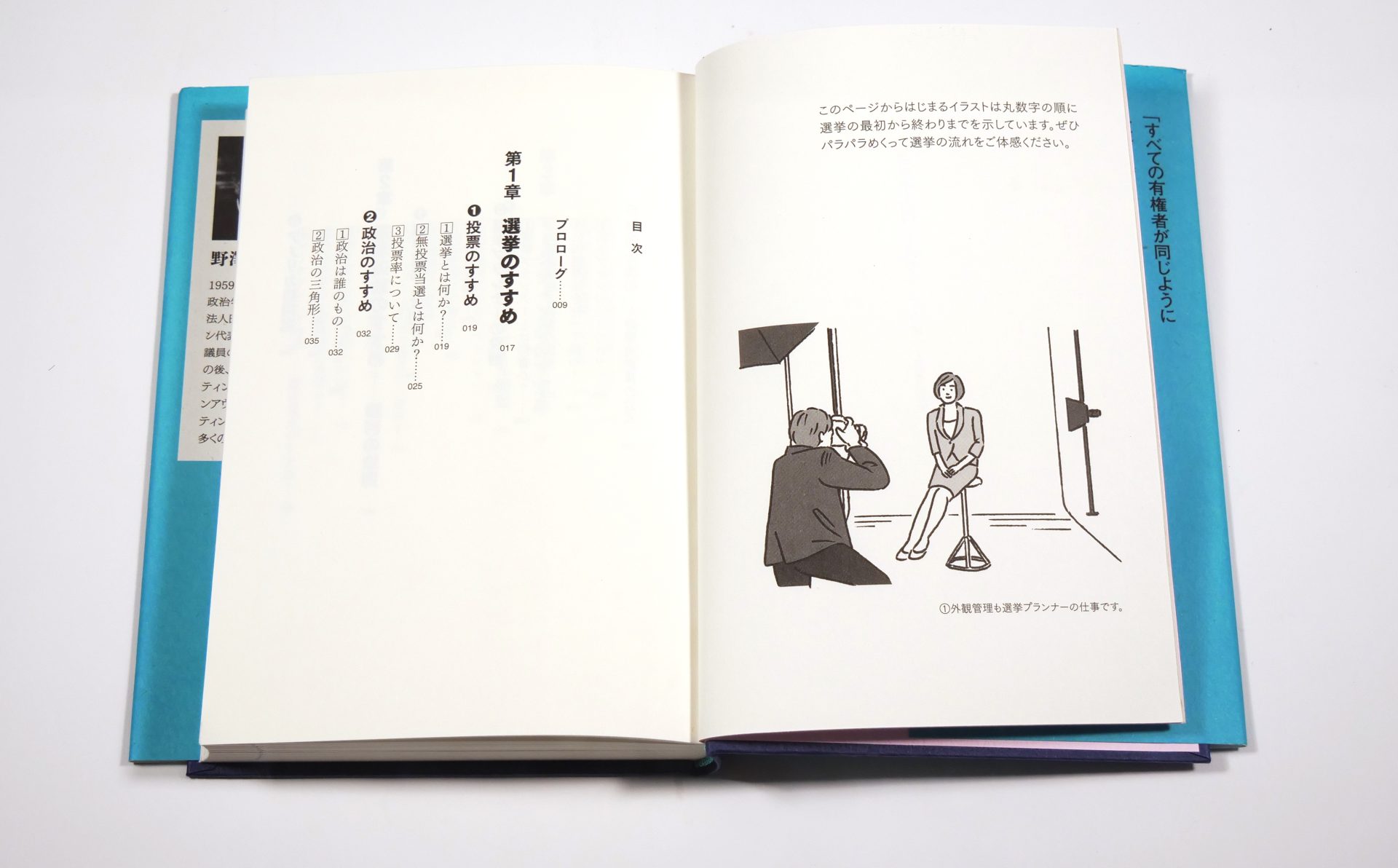 カバーには選挙運動している様子や投票のイラストが描かれており、明るいターコイズブルーと鮮やかな蛍光ピンクの特色が使用されております。