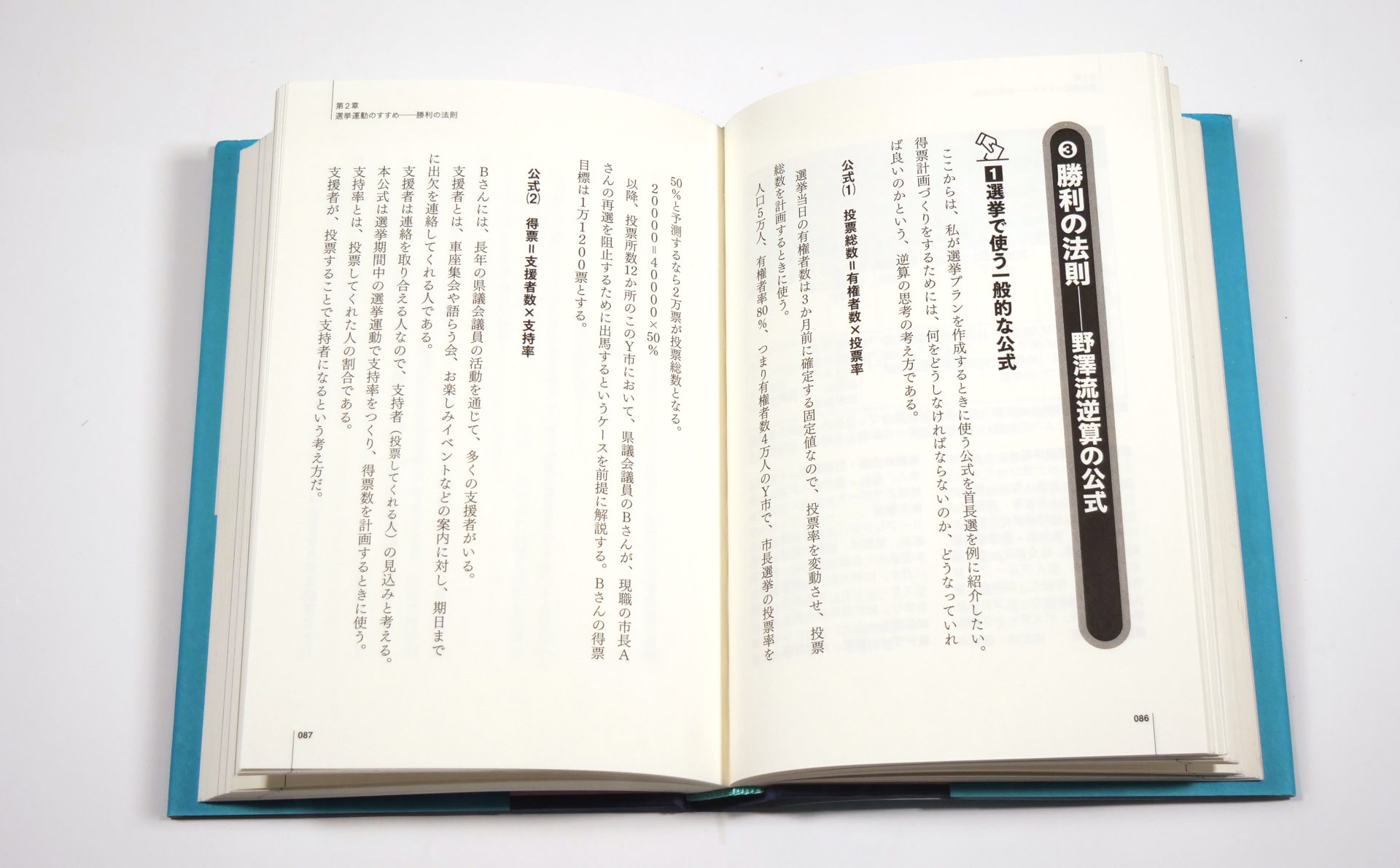 第2章「選挙運動のすすめ」では、選挙プランナーとは何かからはじまり、その役割、さらに勝利の法則として野澤流逆算の公式が説明されています。