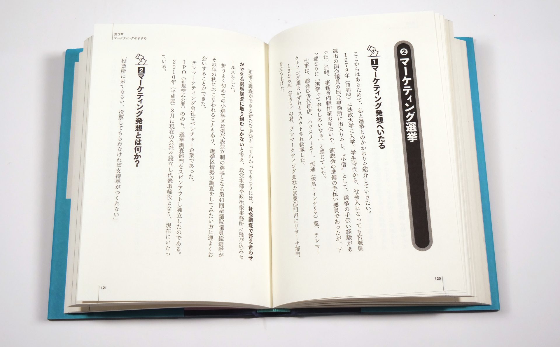 第3章「マーケティングのすすめ」では、選挙に勝つには住んでいる人のことをよく知らなければならないとし、住んでいる人のことを知らなければ良い政治はできないと語っています。
