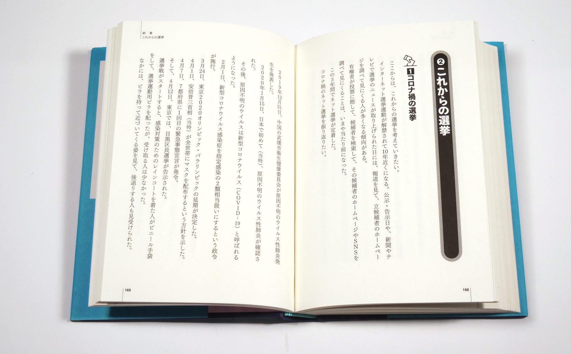 最終章「これからの選挙」では、現在の政治の問題から選挙システムの改善点や課題、ネット選挙についても語られており、今後、政治家と有権者の関係は推すと推される関係性になっていくだろうとも。