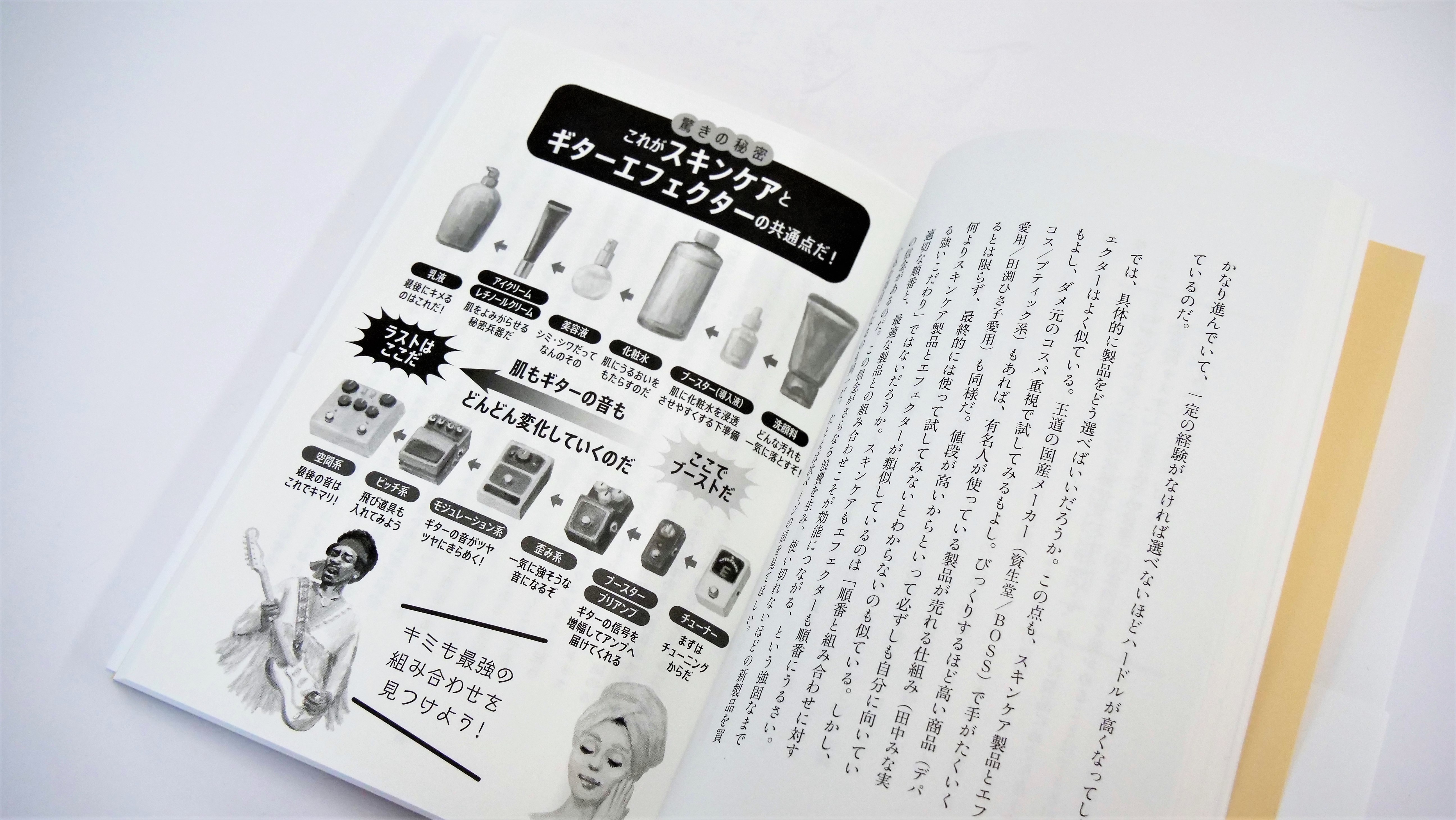 スキンケアアイテムをギターのエフェクターと比較した箇所は、男性ならではの視点で大変面白かったです。「有名人が使っている製品が売れる仕組み(田中みな実/田渕ひさ子愛用)」というように、美容女子のカリスマ・田中みな実とギター女子のカリスマ・田渕ひさ子(NUMBER GIRLのギタリスト)の名前が並列されることなどあったでしょうか。