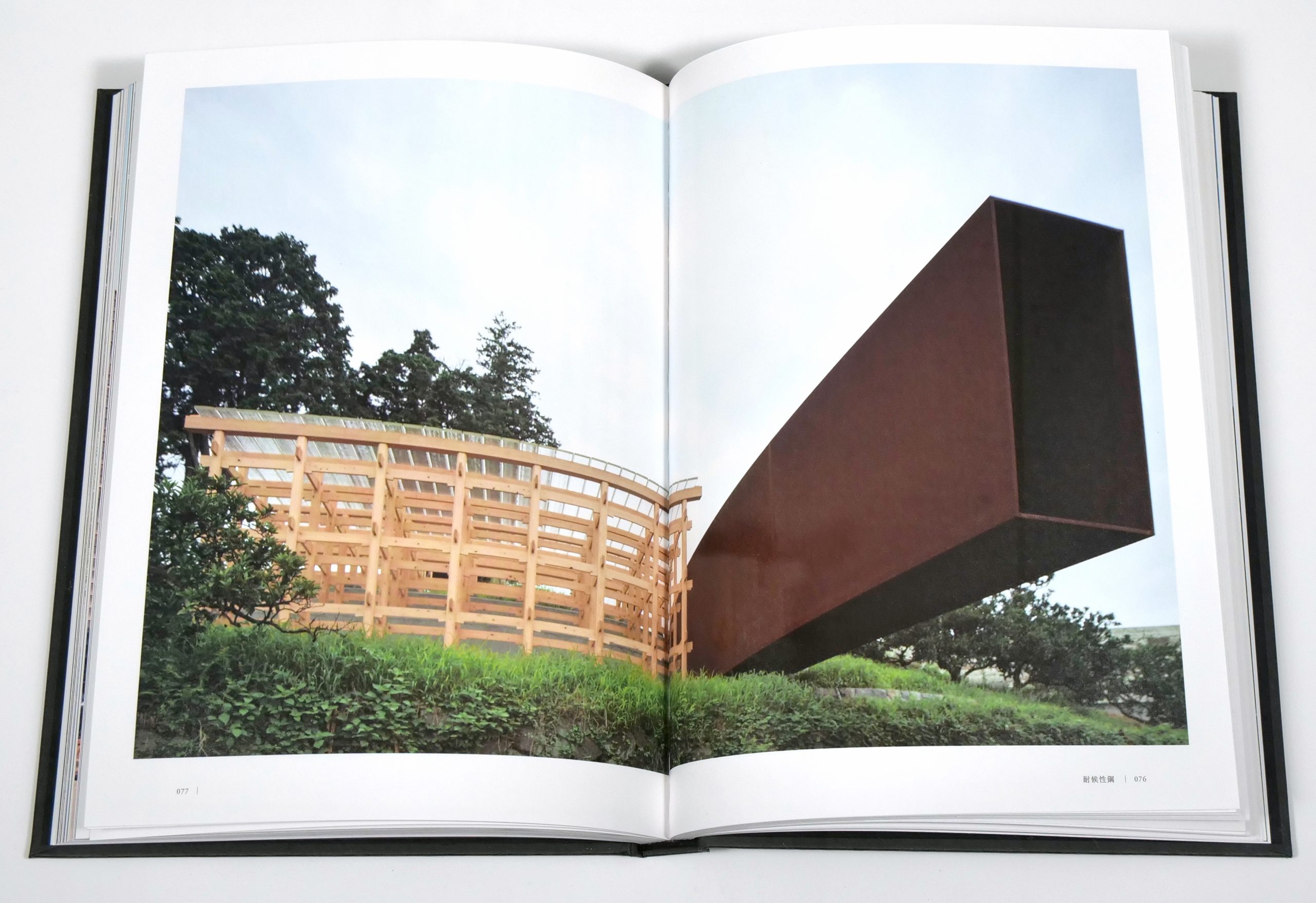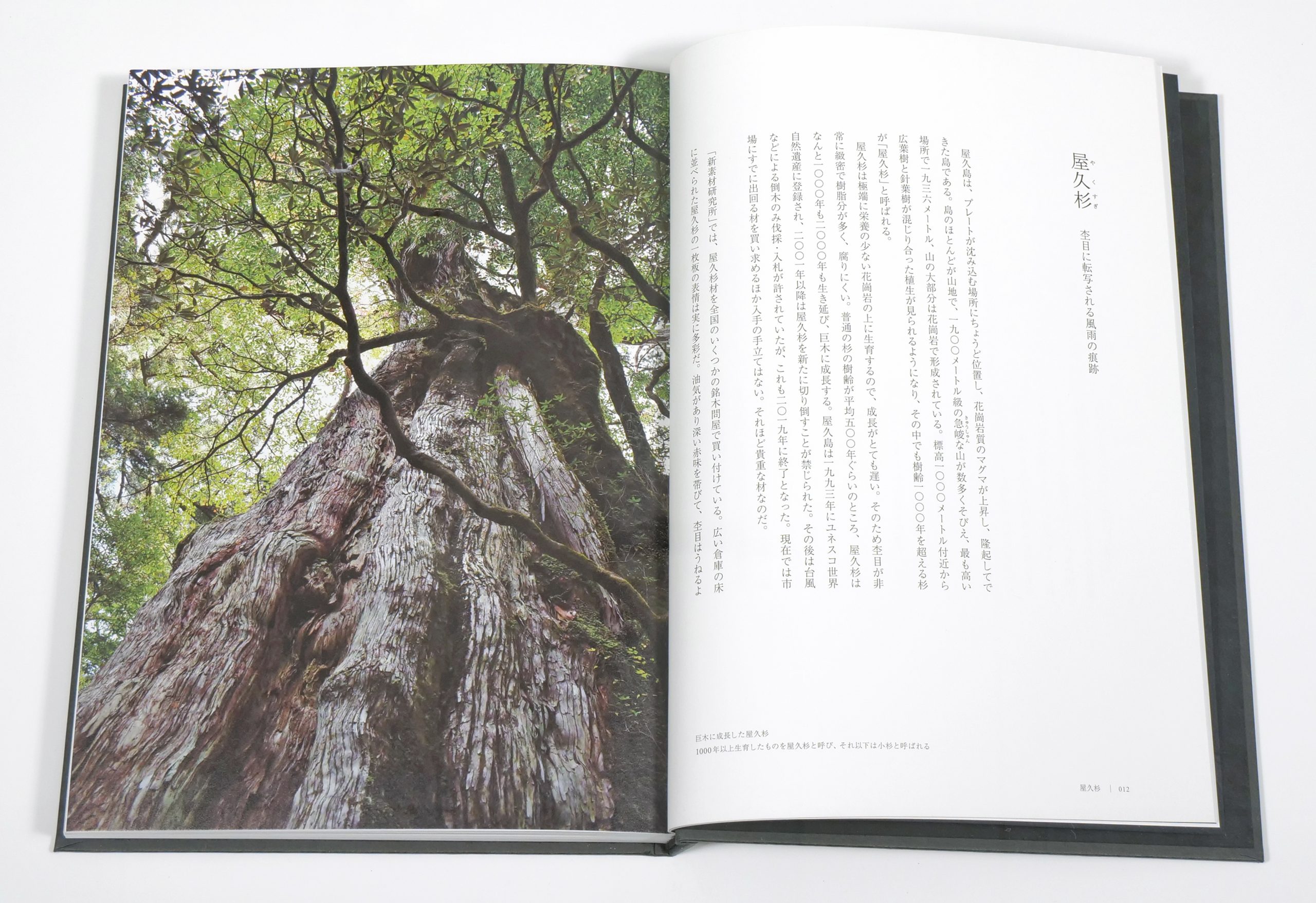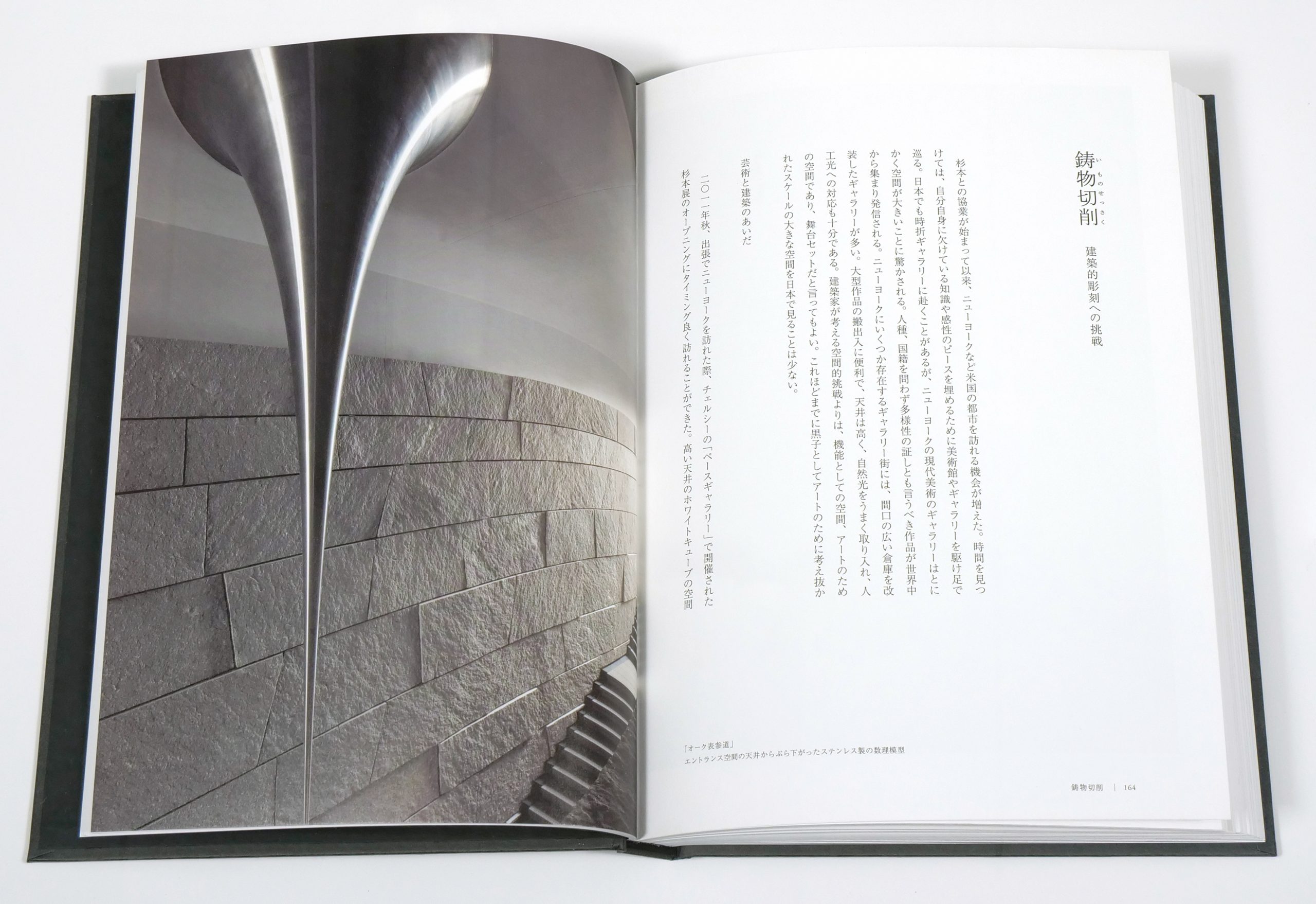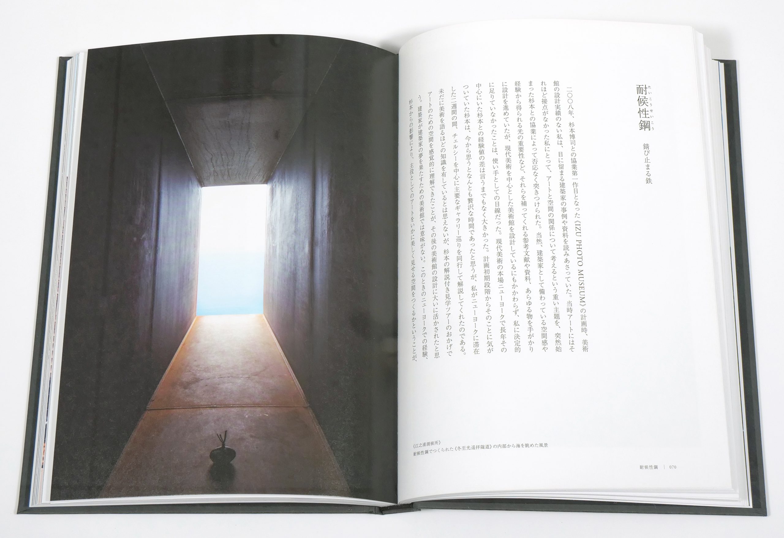 屋久杉、小松石、低焼成瓦、耐候性鋼など素材ごとに節を区切り、それぞれ何を考えて最終的なデザインに至ったのかを、重厚な写真とともに語ります。