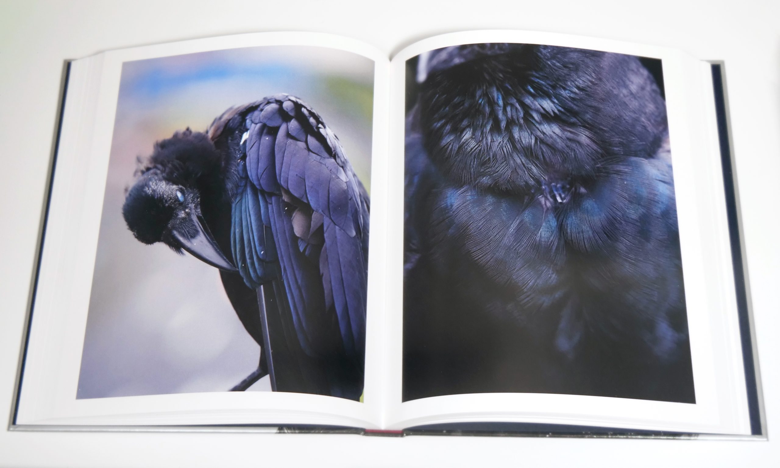 今作では、デジタル機能を最大限に生かし、暗所や悪天候、飛翔シーンなどフィルムカメラ時代に技量不足で撮影できなかったイメージにも果敢に挑戦されたとのこと。また、モノクロからカラーになったことも大きな変化。カラスの羽の色は、「構造色」と呼ばれる光の角度によって緑、青、紫にも見え方が変わる色。真っ黒ではないのです。「濡羽色」と呼ばれる艶のある黒色を指す言葉はそこから来ています。撮影の際には、その色の美しさを見せることを意識されたそうです。
