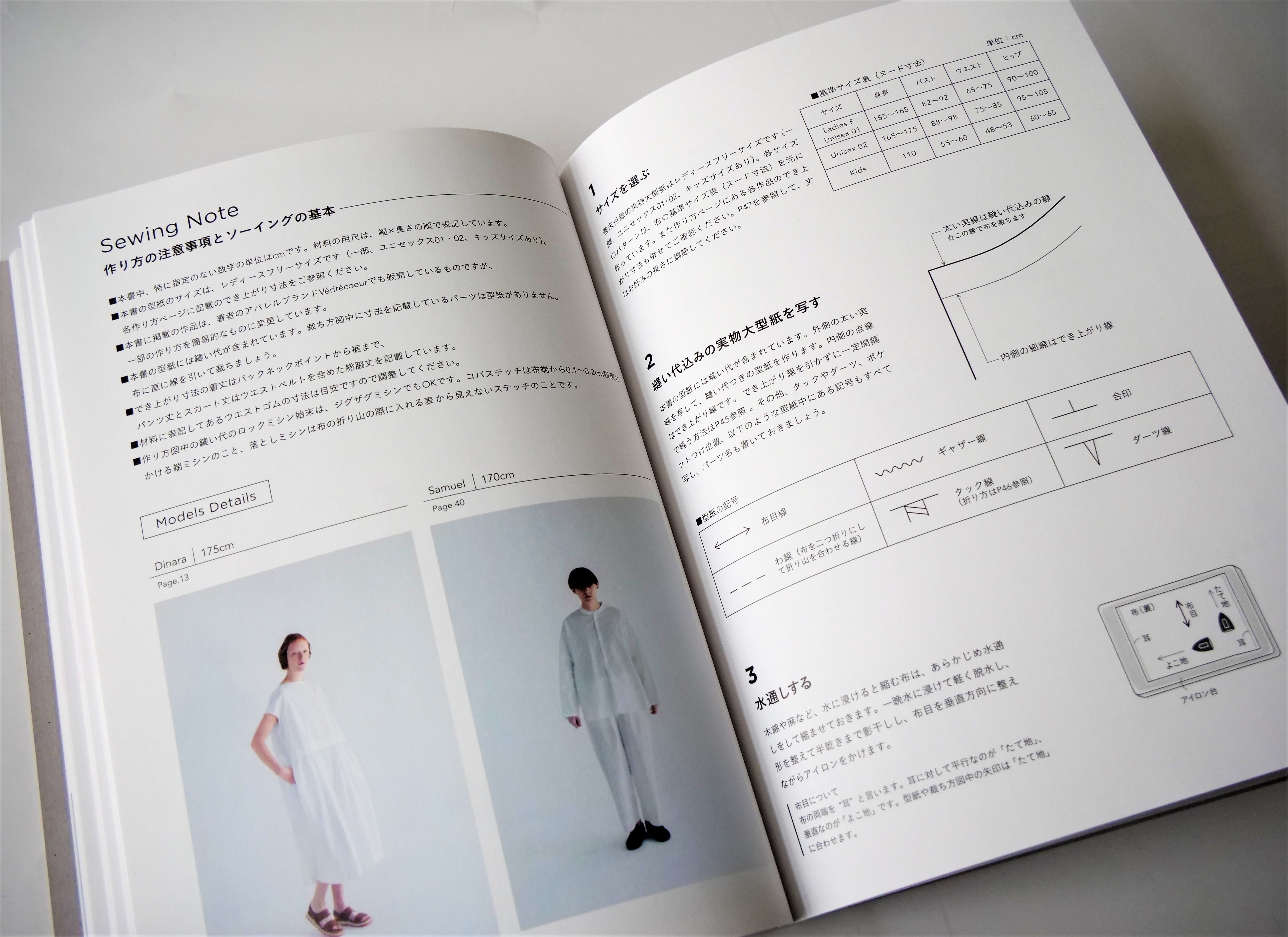 作品は、パンツ、スカート、シャツ、ブラウス、ワンピース、ベスト、羽織もの、コート、バッグ、帽子など計26点。レディースフリーサイズ(一部、ユニセックス01・02、キッズサイズあり)。縫い代込みの実物大型紙つき。