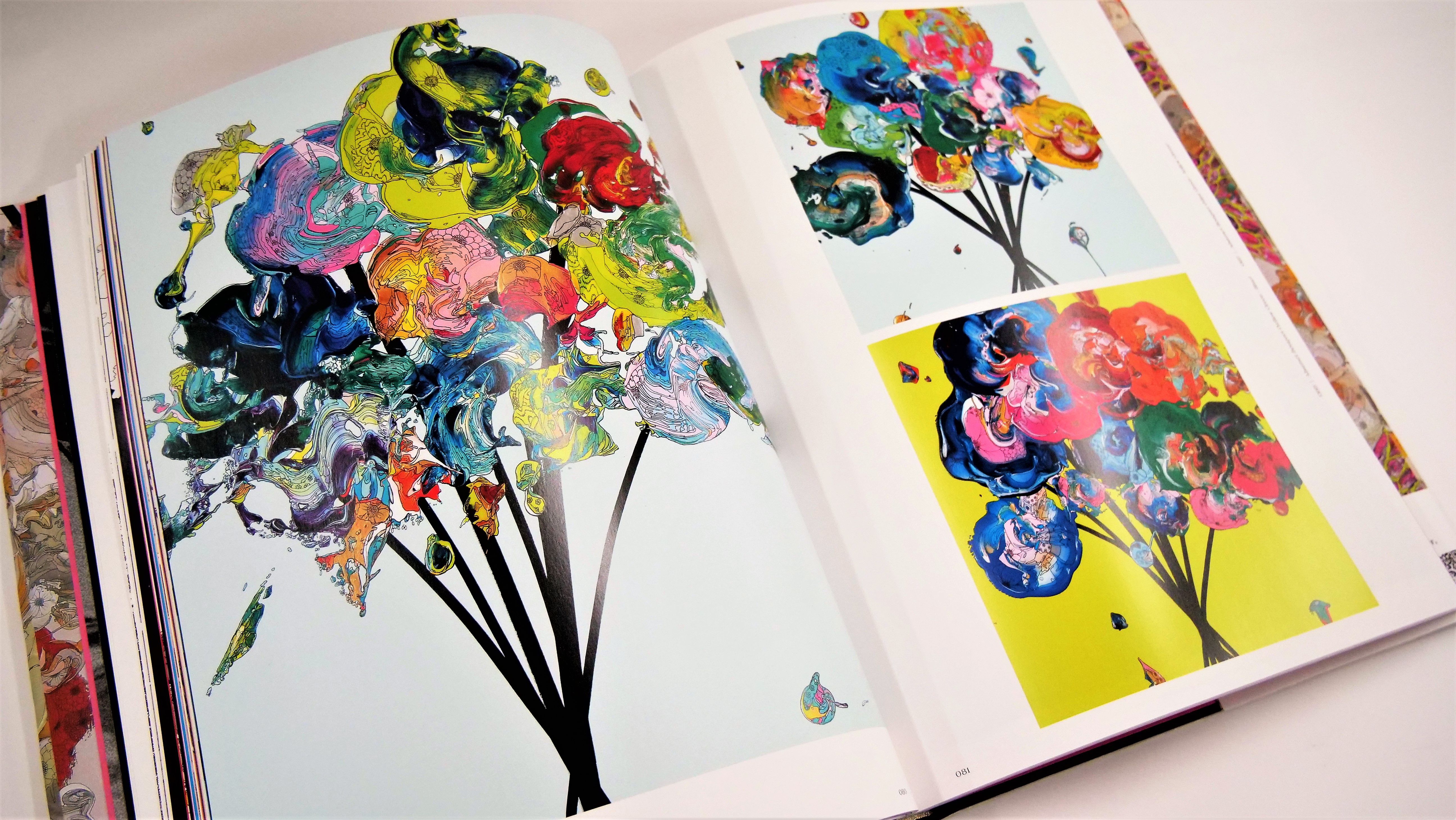 実際にギャラリーで現物を拝見すると、作品のダイナミックさに圧倒されました。全図では色鮮やかな発色に見えますが、個々で見ると印刷インクのような僅かに濁りを感じる発色でした。但し、実際、印刷でインキを盛りすぎると作品のイメージを逸脱してしまうような、非常に難しい作品でした。特にピンクやブルーもやや黄味のあるエメラルド色に近い発色で、黄味が多すぎると濁りが生じるような微妙な色彩です。