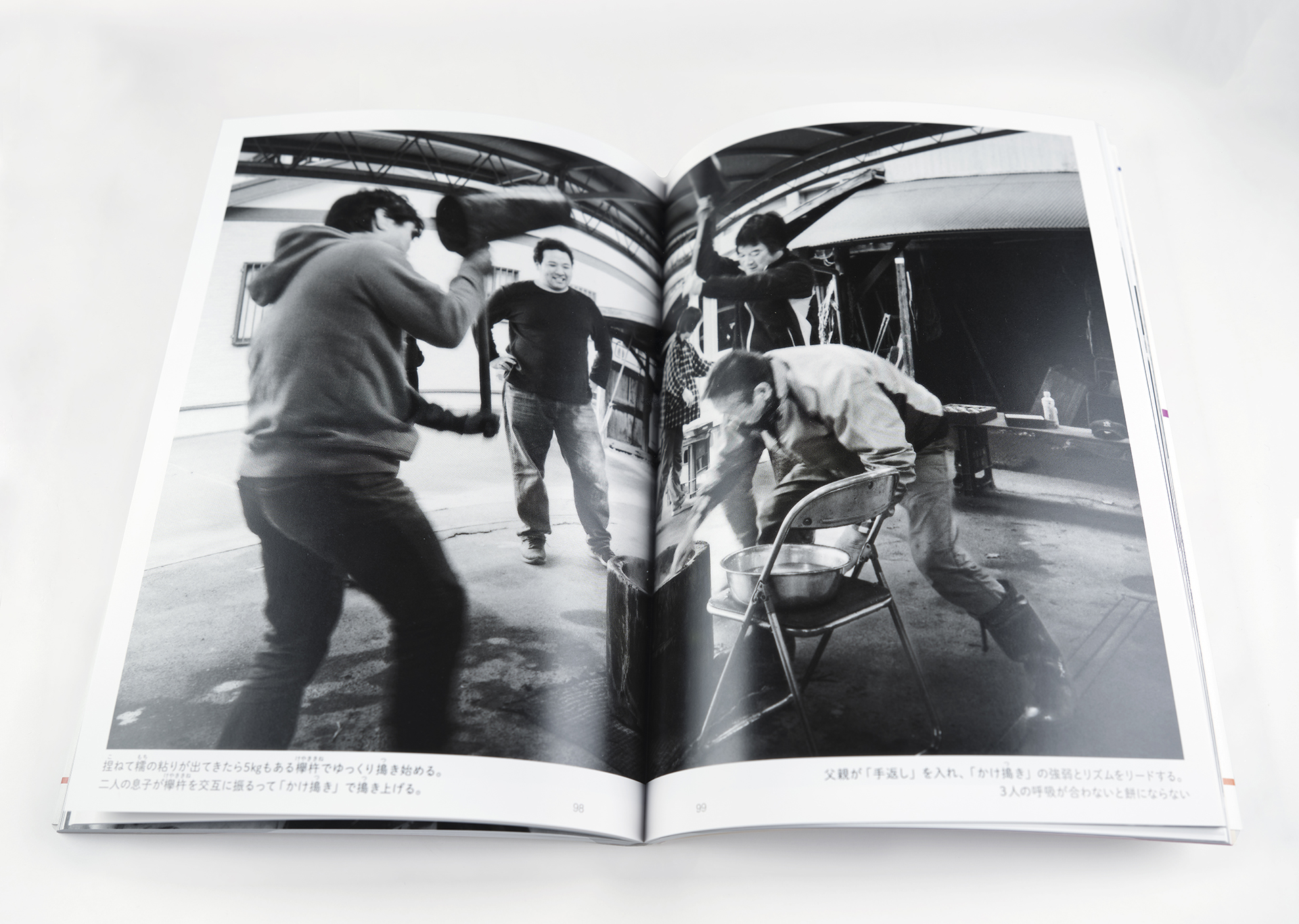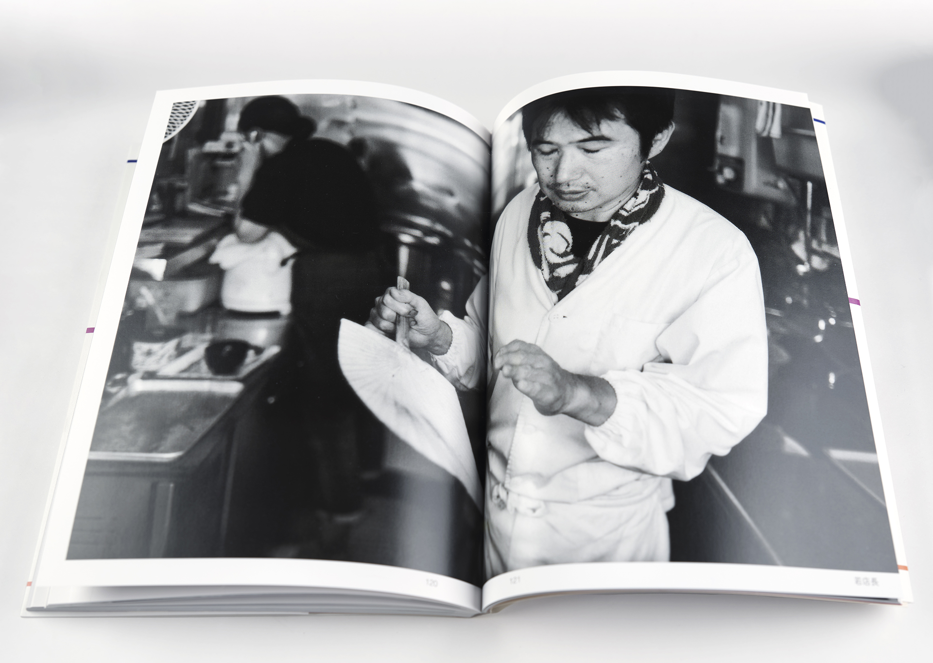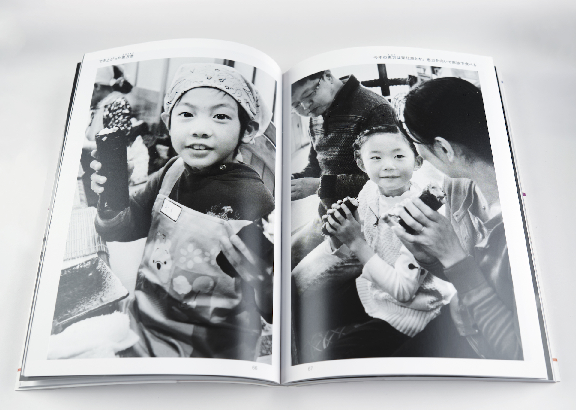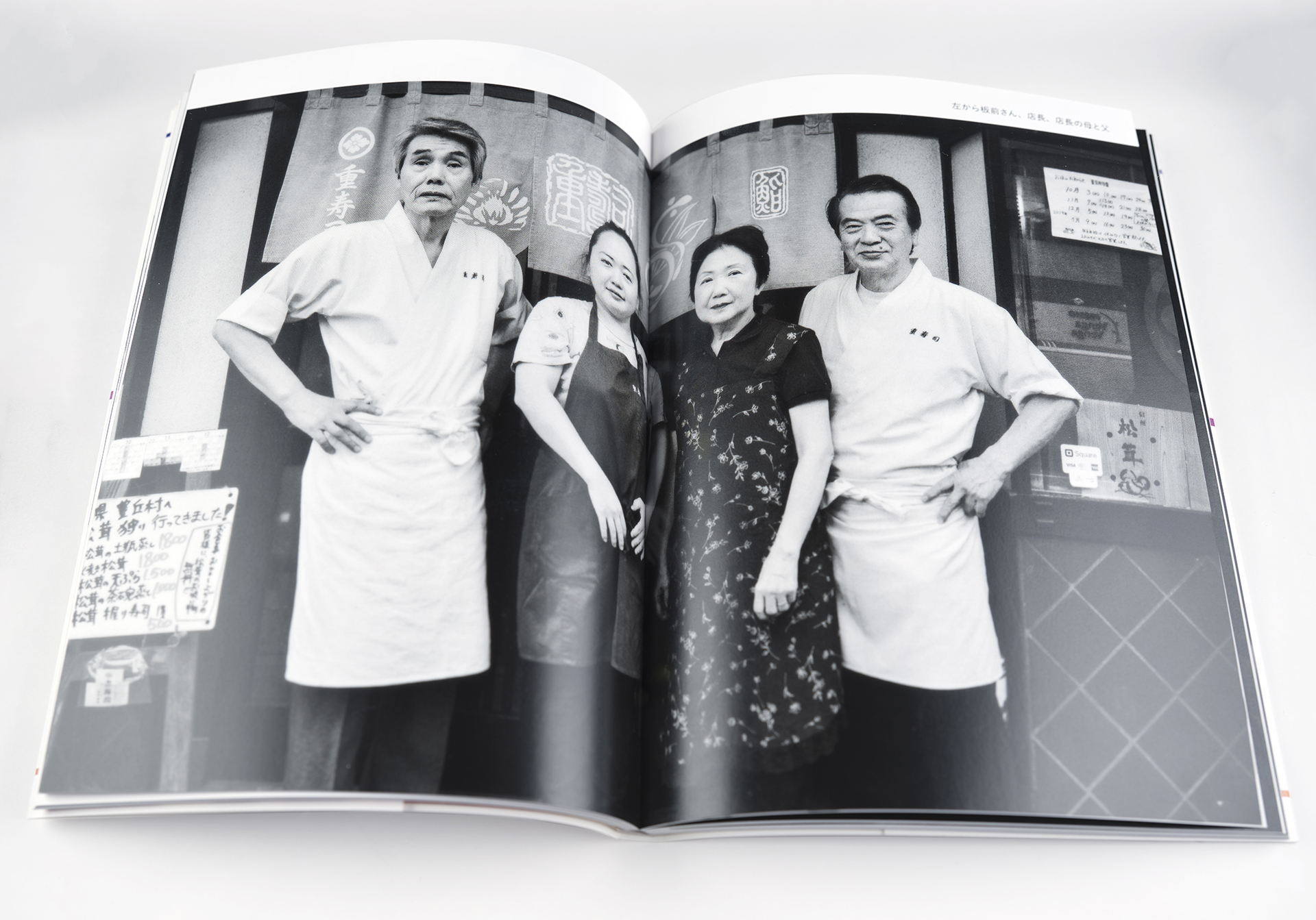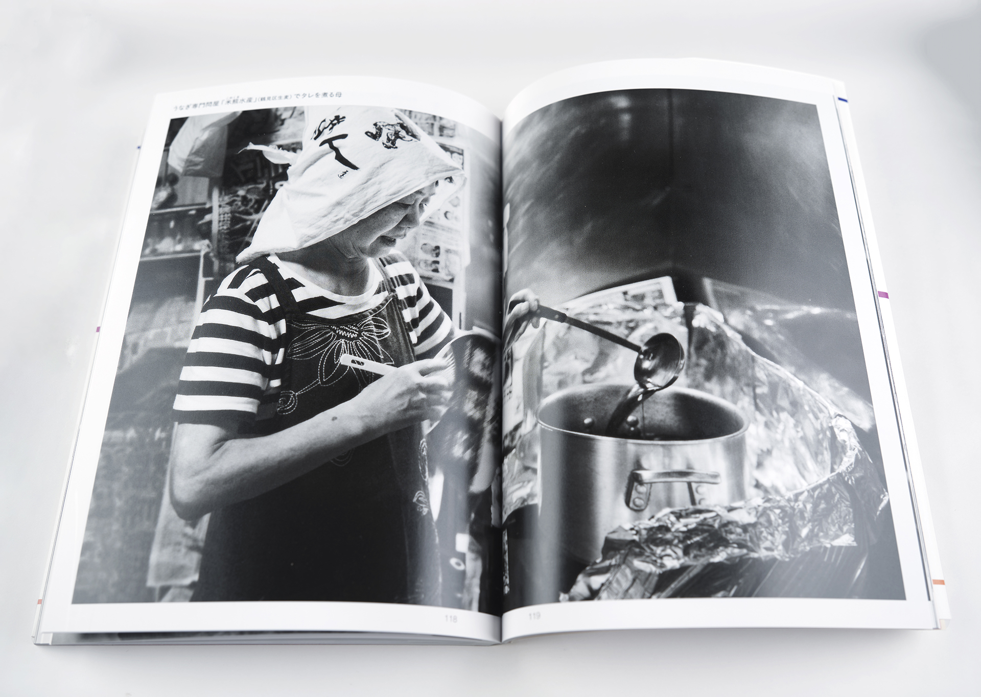 写真集には、これらの店の日常とそこで働く人々の人生がいきいきと描かれています。例えば、168歳の和菓子店「若葉」で丹念に捉えられている和菓子職人の細やかな技や、百年もののタレと甕を今でも使い続けるうなぎ店の家族。そして、近所の子供たちが寿司屋の大将に学び、恵方巻き作りに挑戦する姿や親子4代で糯搗きに勤しむ家族の写真からは、代々受け継がれてきた食文化や伝統が今なお共同体の中で若い世代に継承されている様子がありありと伝わってきます。